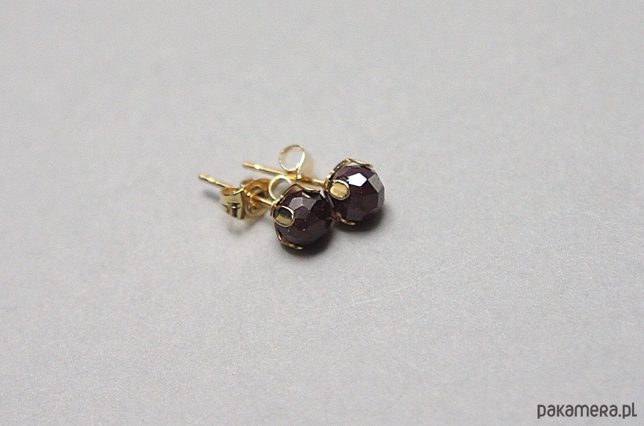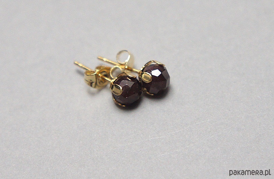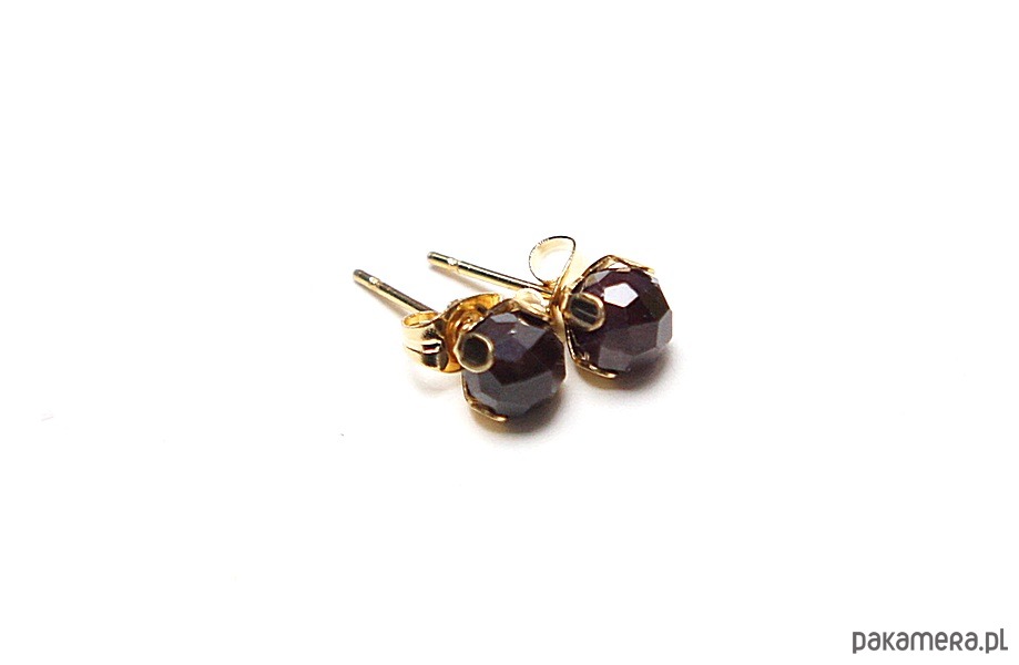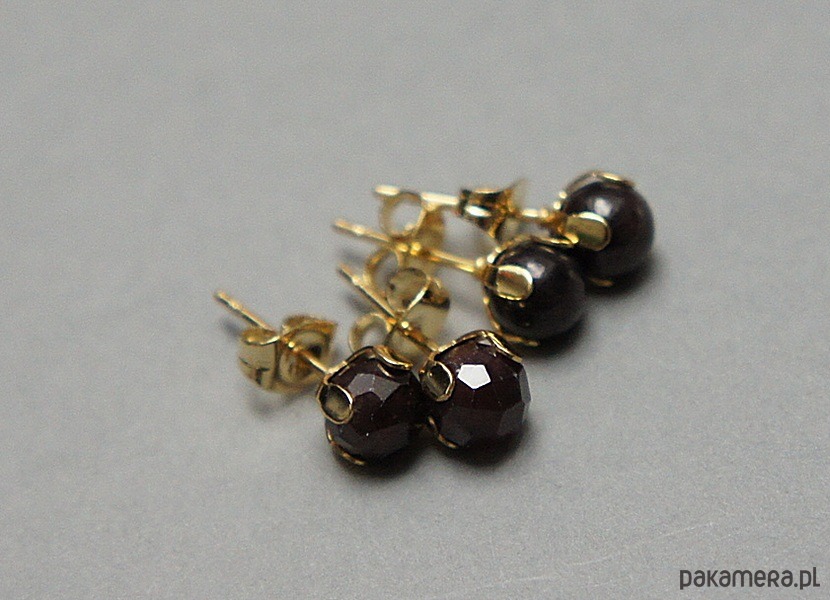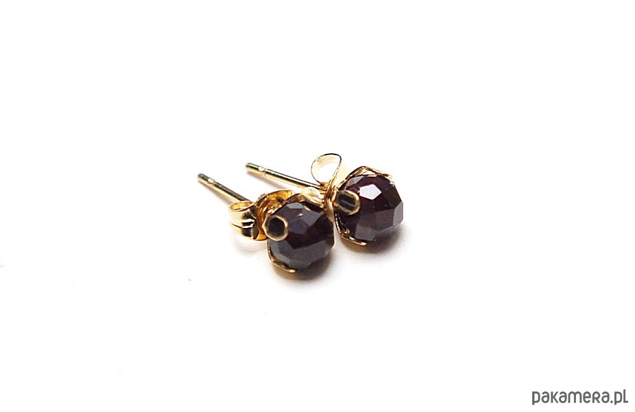 Delikatne, drobne kolczyki wykonane z naturalnych minerałów - granaty fasetowawne o ciemnym wybarwieniu [6mm] oraz z pozłacanej stali szlachetnej. Zapięcie - sztyfty;
