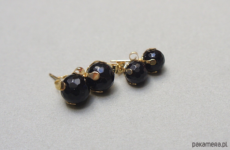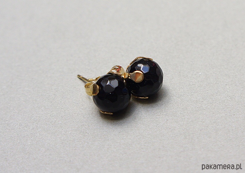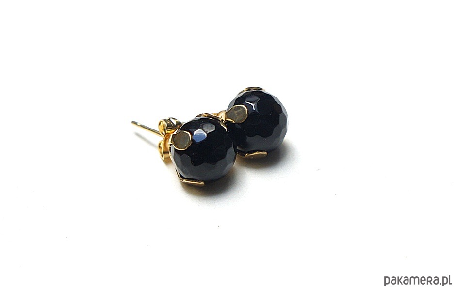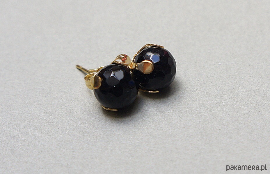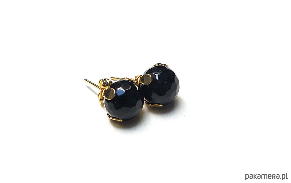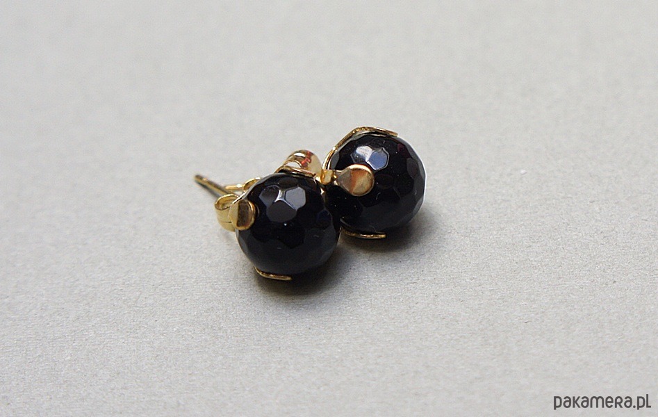 Delikatne kolczyki wykonane z naturalnych minerałów - onyks fasetowany [10mm] oraz z pozłacanej stali szlachetnej. Zapięcie - sztyfty; Biżuteria ozdobnie zapakowana.