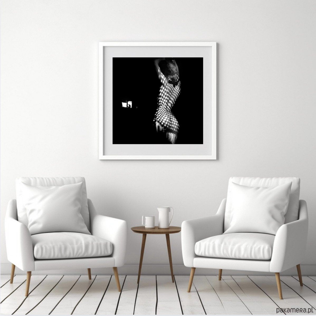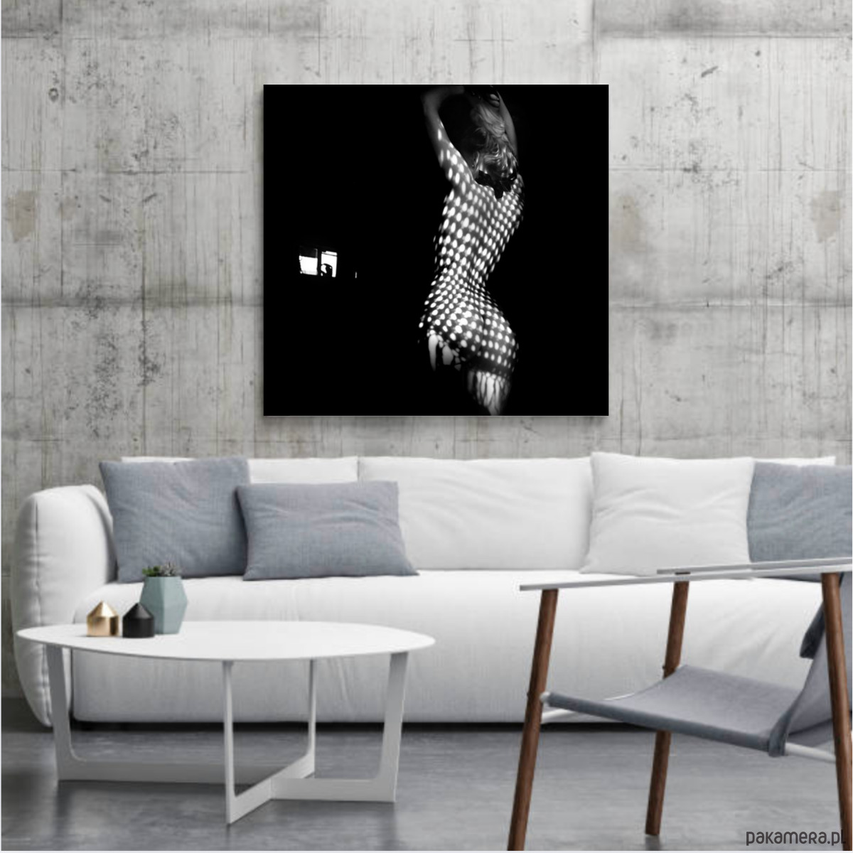 Fotografia artystyczna pin up vogue na płótnie satynowanym 60x60 cm, gotowa do zawieszenia na ścianie -naciągnięta na solidny blejtram i utrwalona werniksem (mat lub piękny pół połysk satynowy), co daje dodatkowe zabezpieczenie przed urazami zewnętrznymi. Werniks w bardzo elegancki sposób wydobywa fakturę płótna, a pół połysk dodatkowo ożywia kolory. Dzięki werniksowi można obraz od czasu do czasu delikatnie przetrzeć na sucho z kurzu.