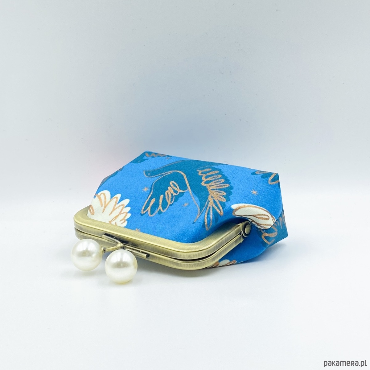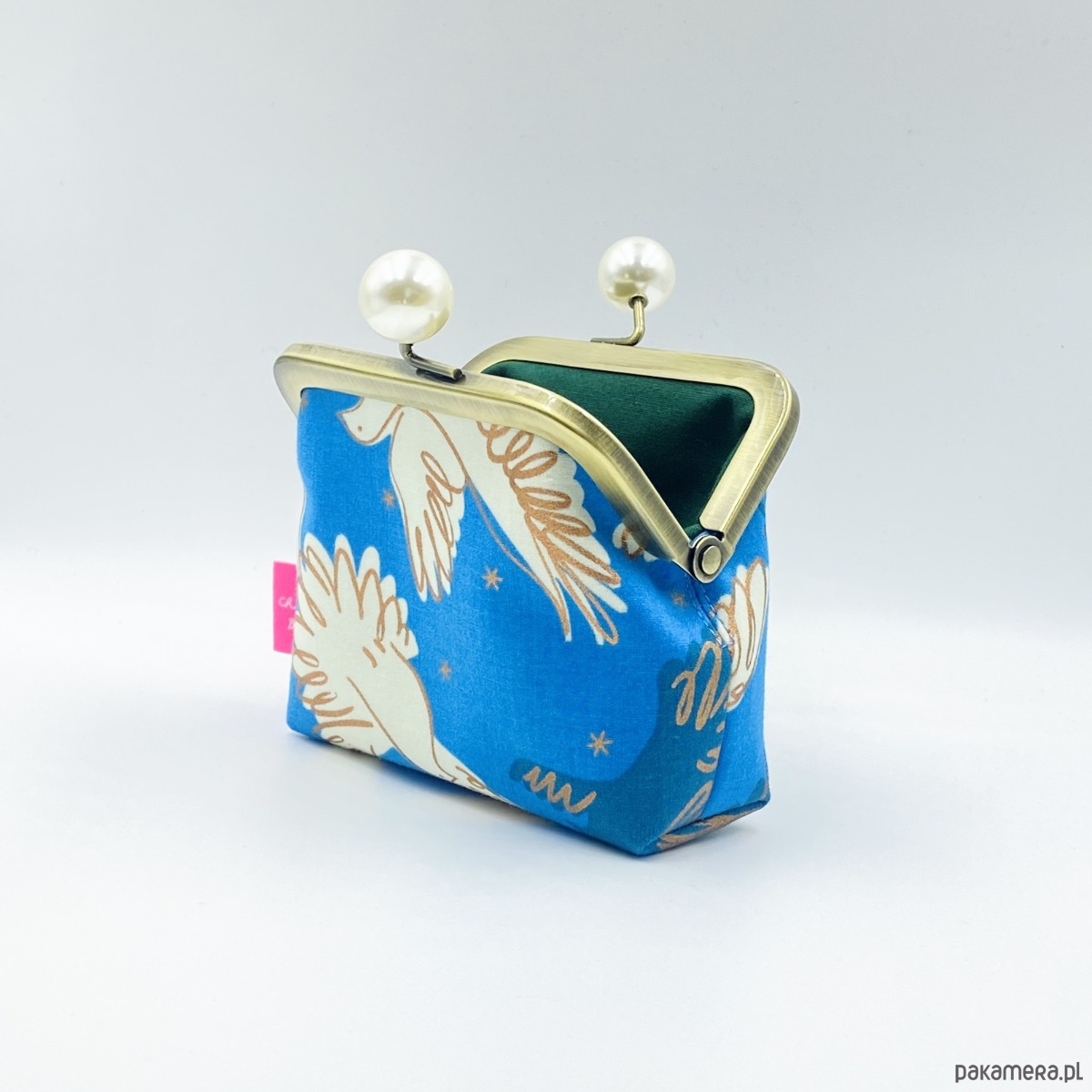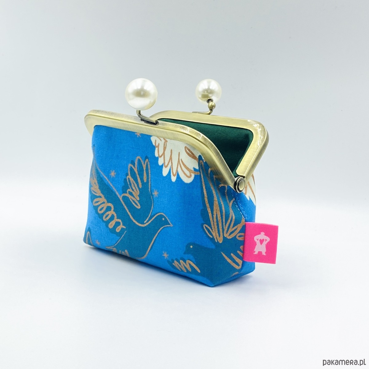 Portmonetka „Doves Blue” przedstawia białe i niebieskie gołębie obrysowane złotym konturem, na błękitnym tle. Wewnętrzna podszewka wykonana została z bawełny w zielonym kolorze. Jednokomorowa portmonetka, mieści w sobie karty kredytowe.