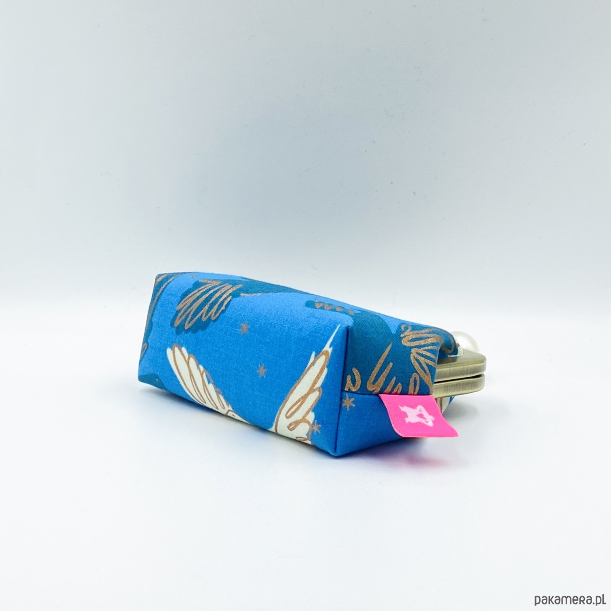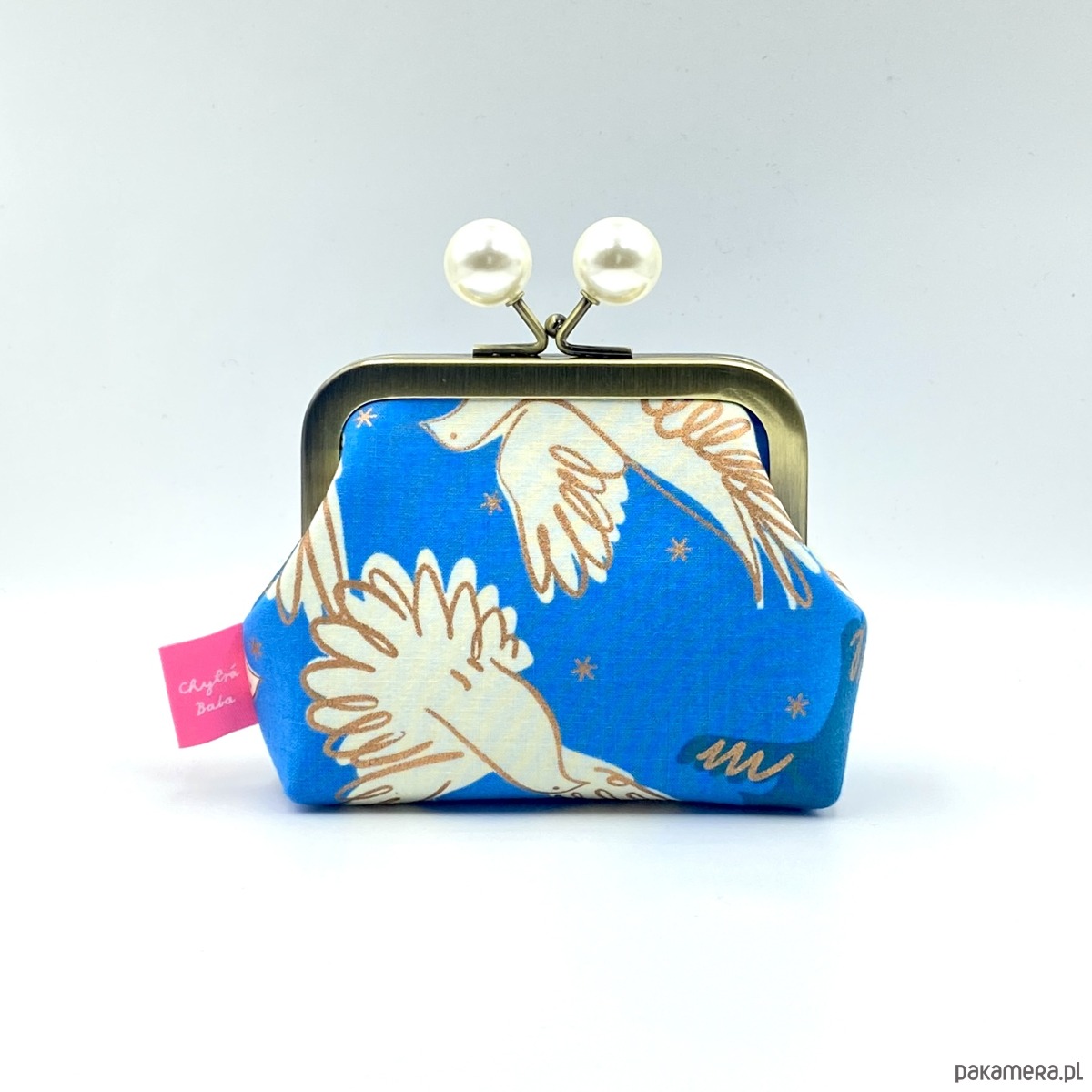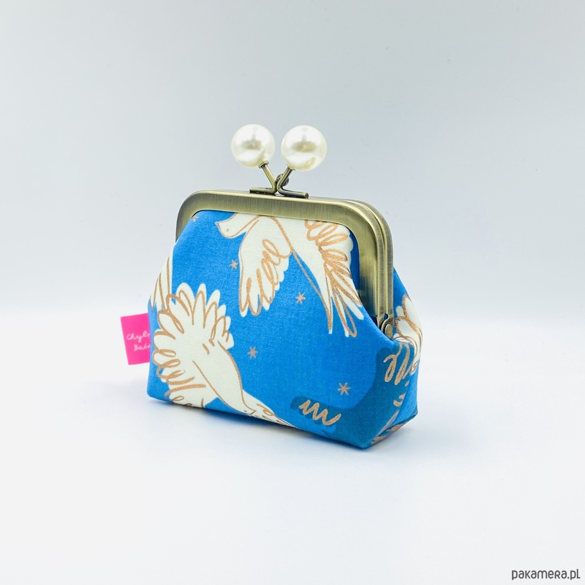 Portmonetka „Doves Blue” przedstawia białe i niebieskie gołębie obrysowane złotym konturem, na błękitnym tle. Wewnętrzna podszewka wykonana została z bawełny w zielonym kolorze. Jednokomorowa portmonetka, mieści w sobie karty kredytowe.