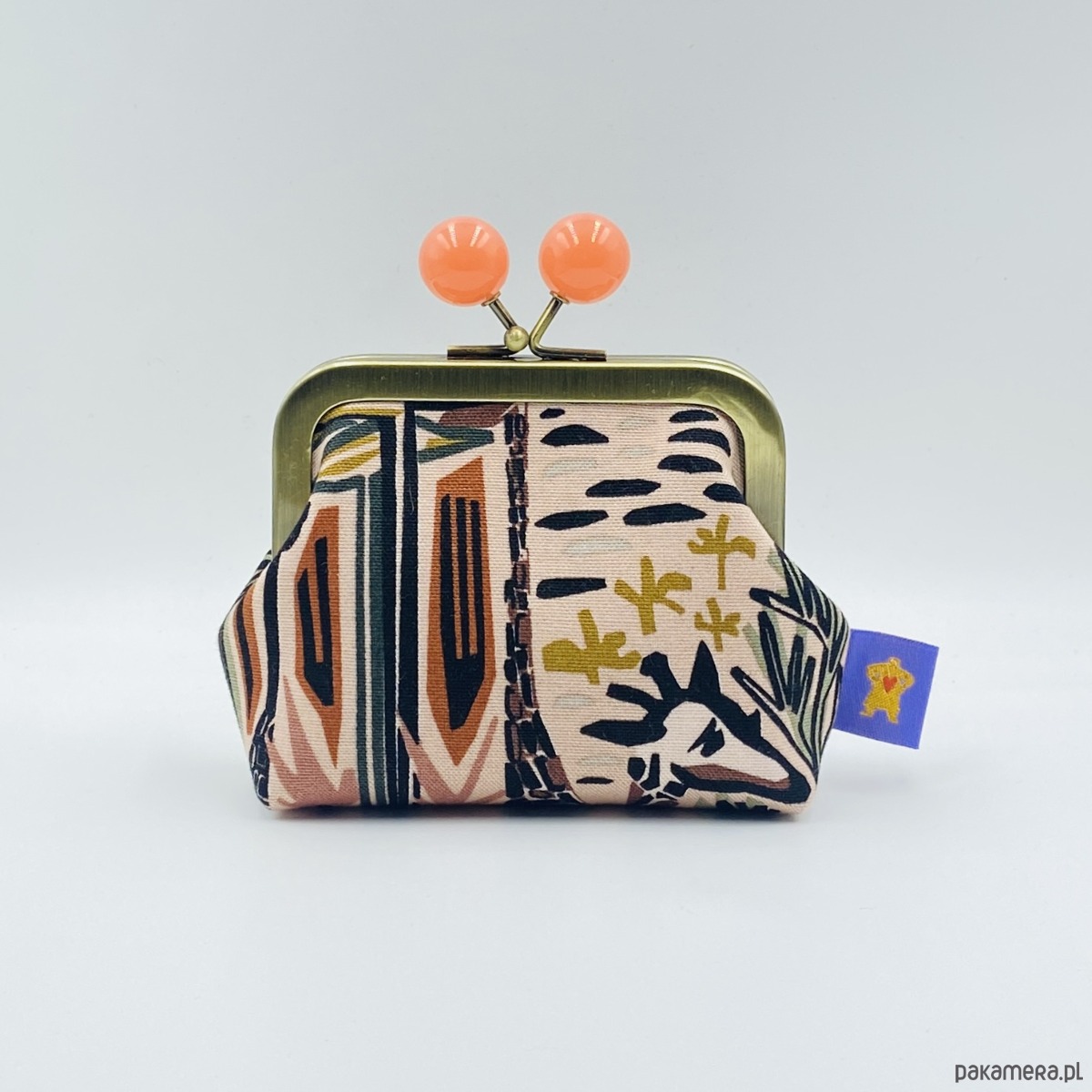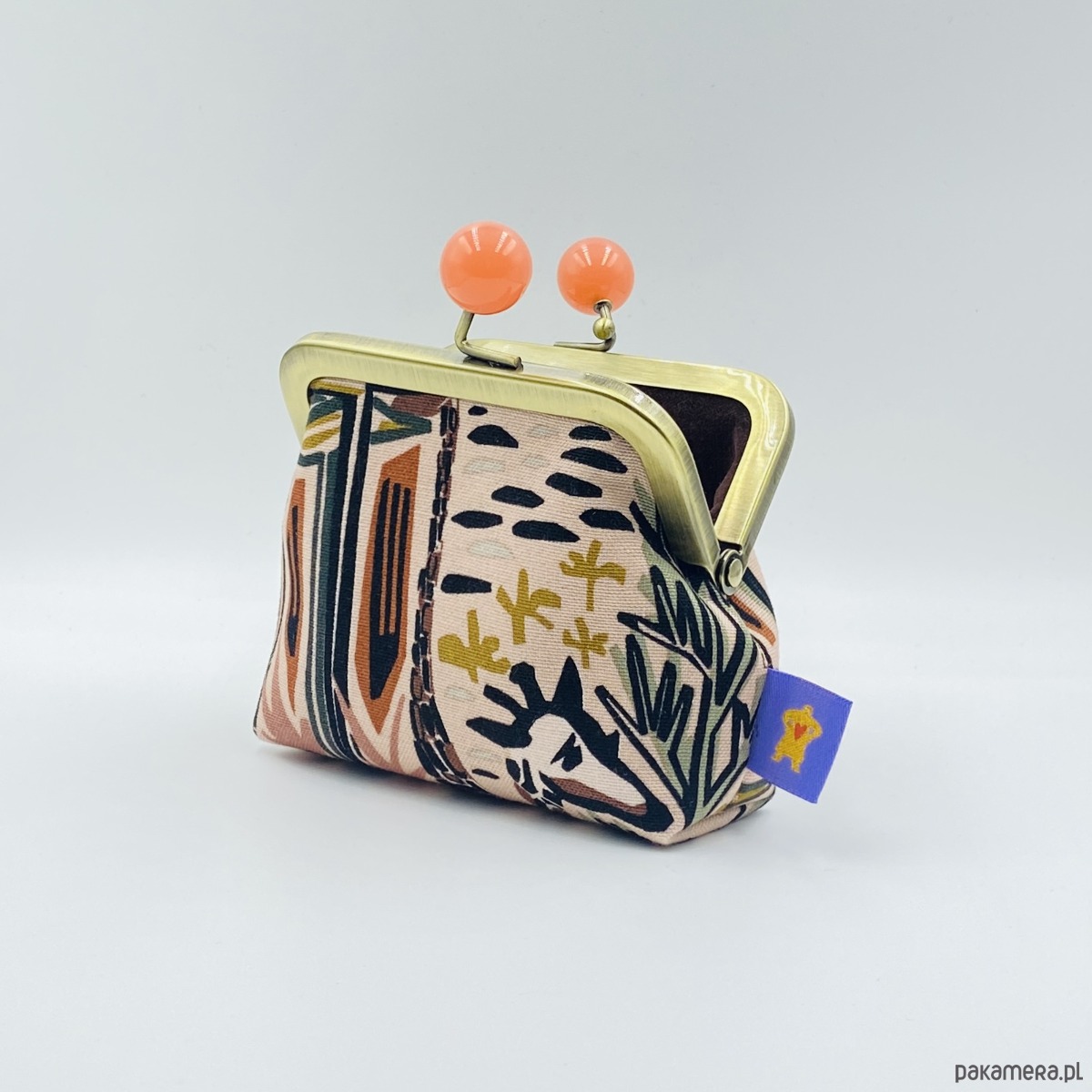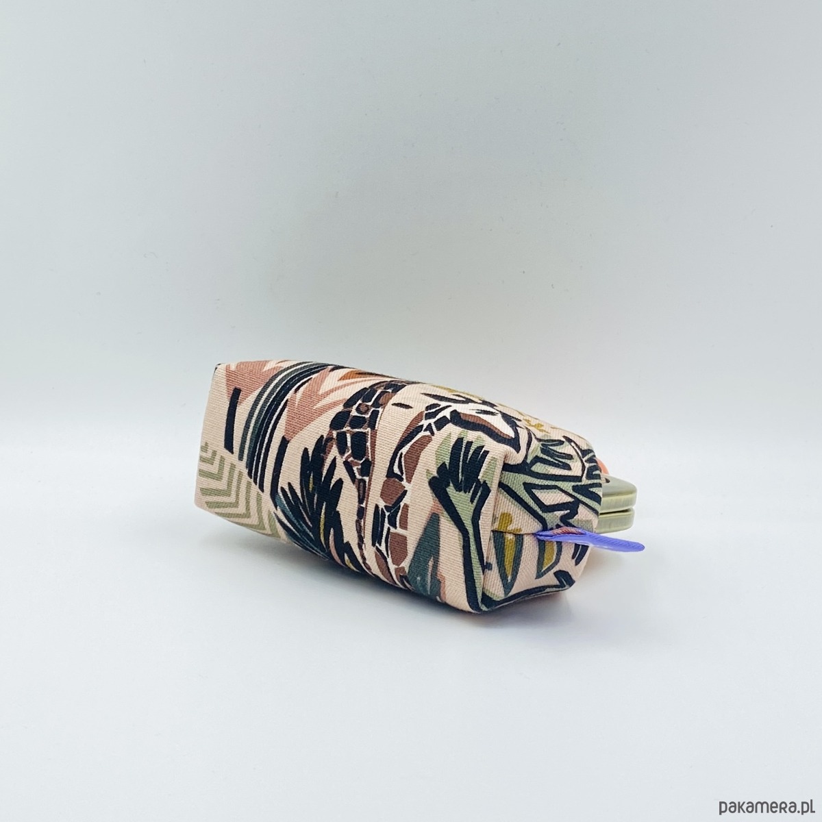 Portmonetka „Giraffe Orange” przedstawia abstrakcyjne wizerunki żyraf i drzew na beżowym i brązowym tle. Wewnętrzna podszewka wykonana została z prawdziwego aksamitu w kolorze brązowym. Jednokomorowa portmonetka, mieści w sobie karty kredytowe.