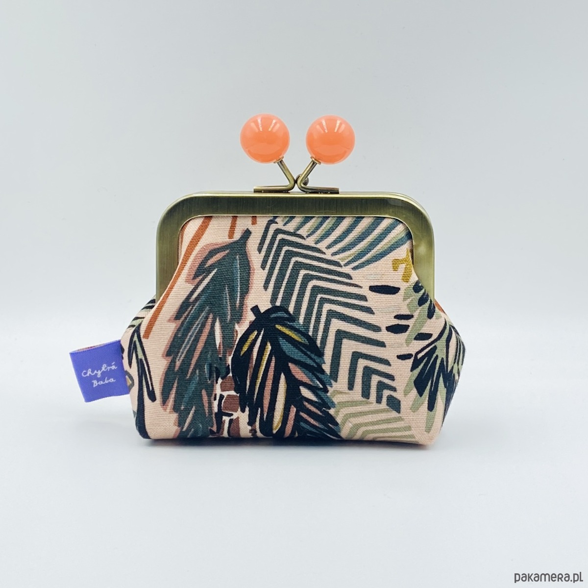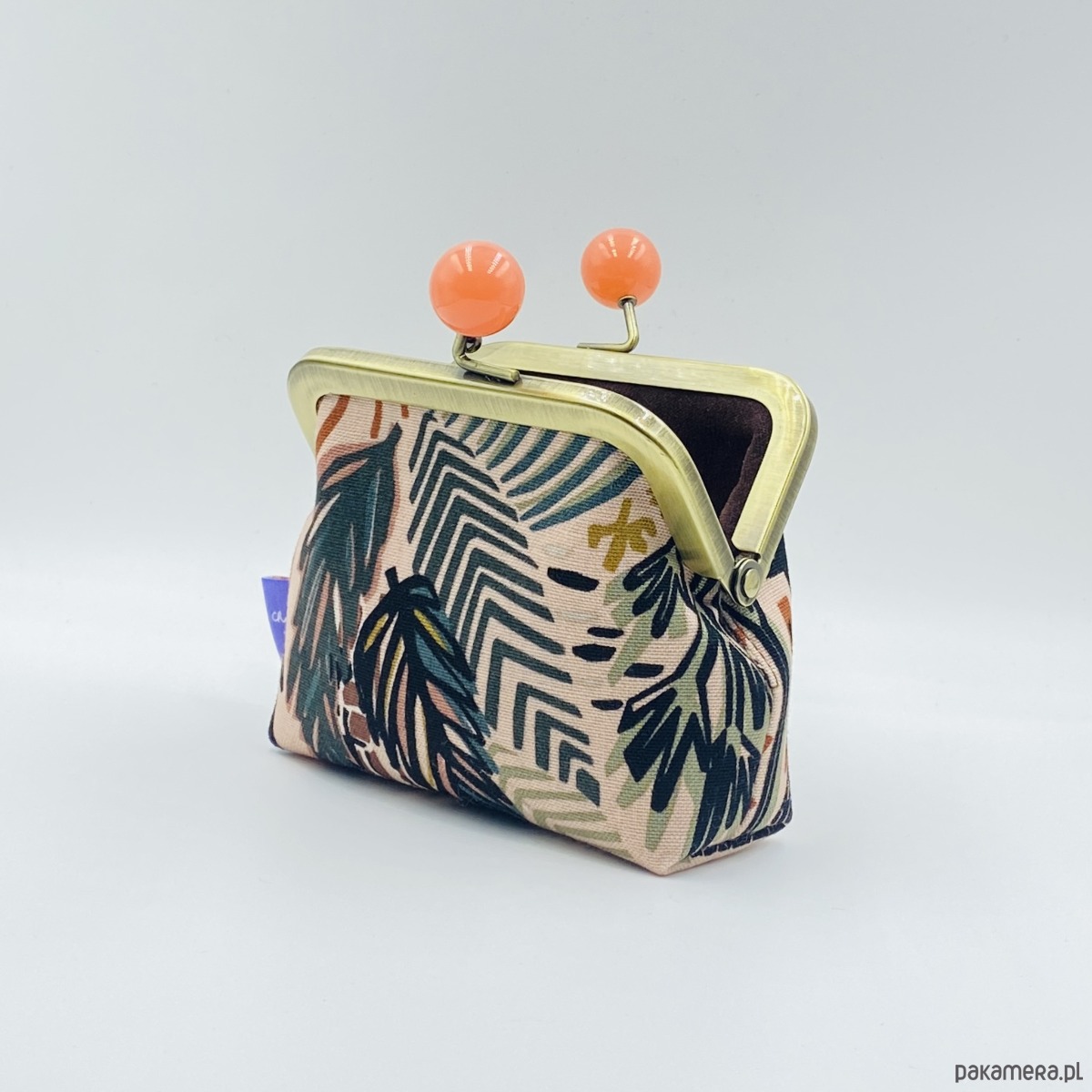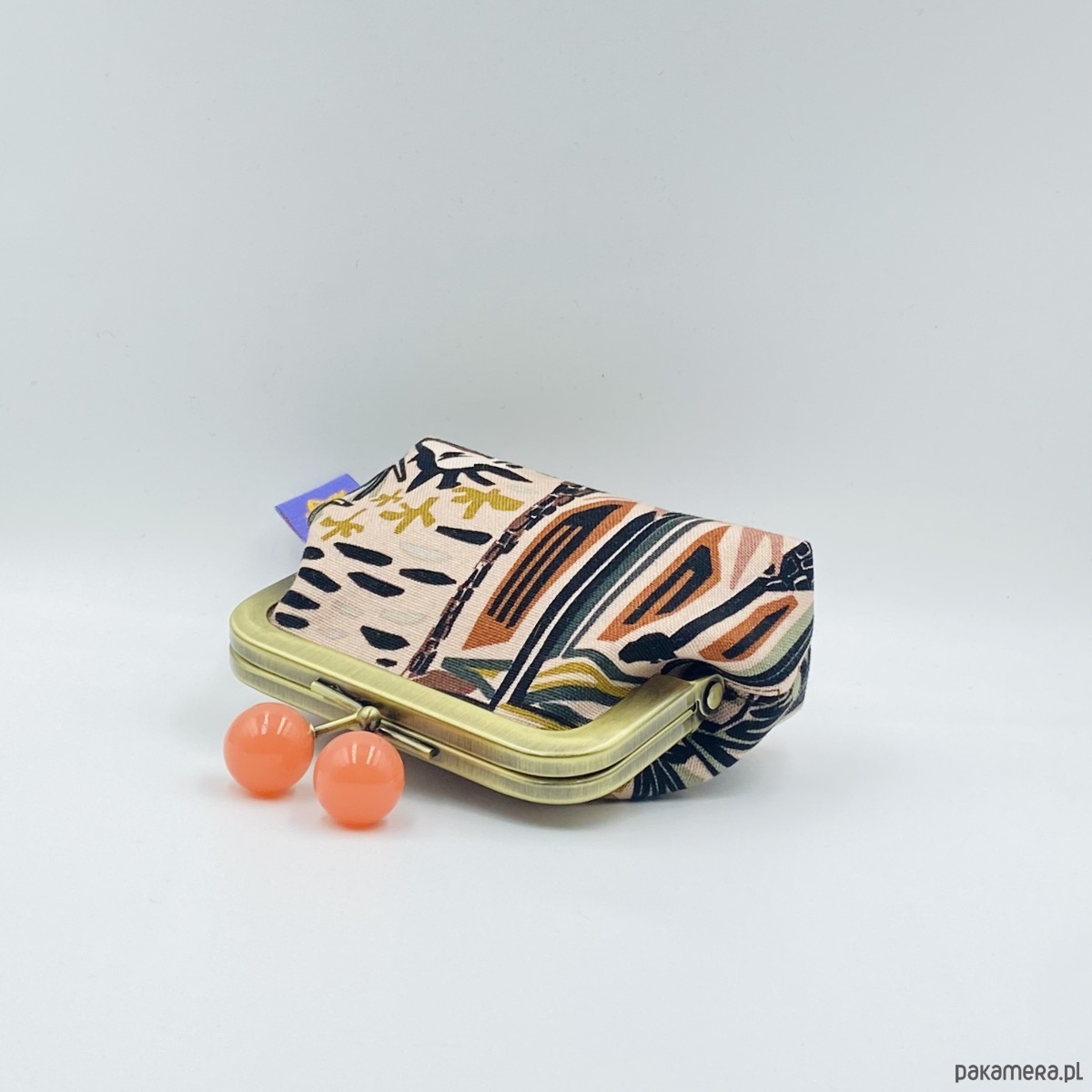 Portmonetka „Giraffe Orange” przedstawia abstrakcyjne wizerunki żyraf i drzew na beżowym i brązowym tle. Wewnętrzna podszewka wykonana została z prawdziwego aksamitu w kolorze brązowym. Jednokomorowa portmonetka, mieści w sobie karty kredytowe.