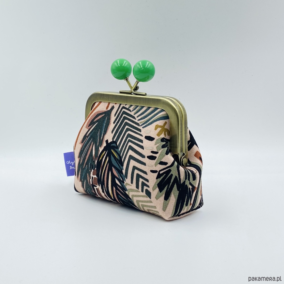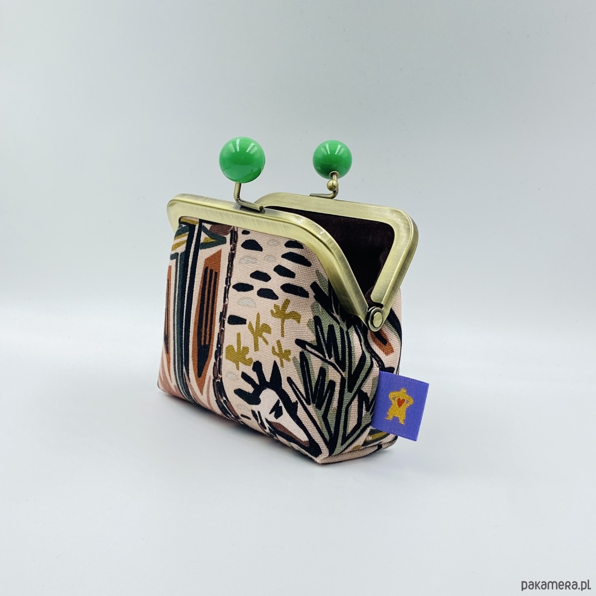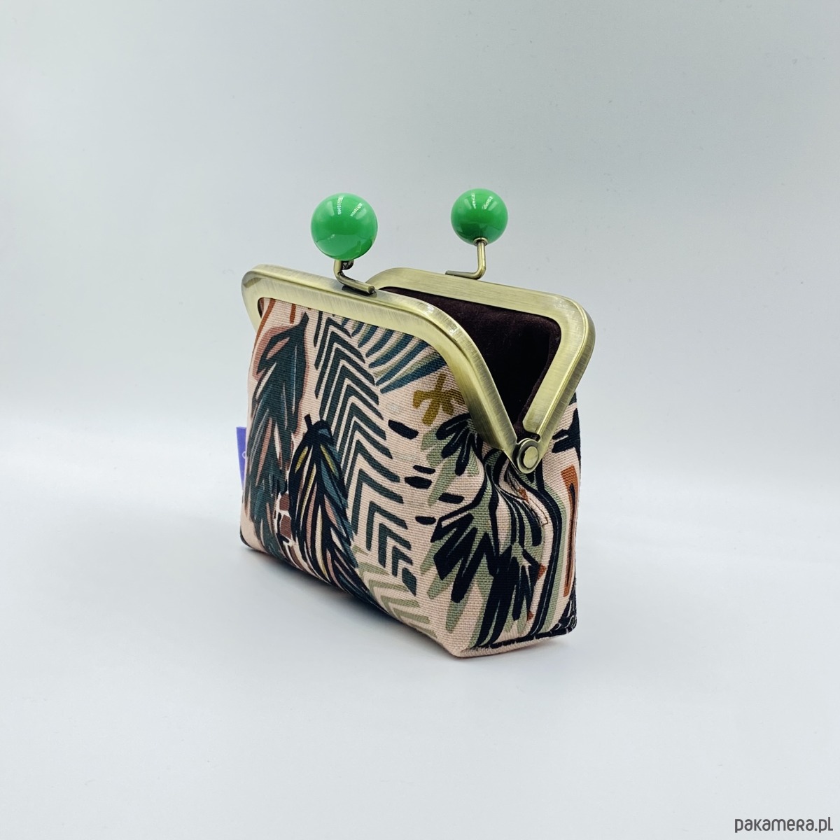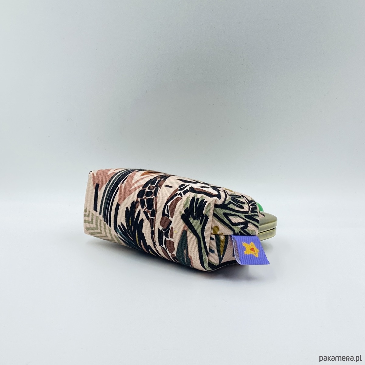 Portmonetka „Giraffe Green” przedstawia abstrakcyjne wizerunki żyraf i drzew na beżowym i brązowym tle. Wewnętrzna podszewka wykonana została z prawdziwego aksamitu w kolorze brązowym. Jednokomorowa portmonetka, mieści w sobie karty kredytowe.