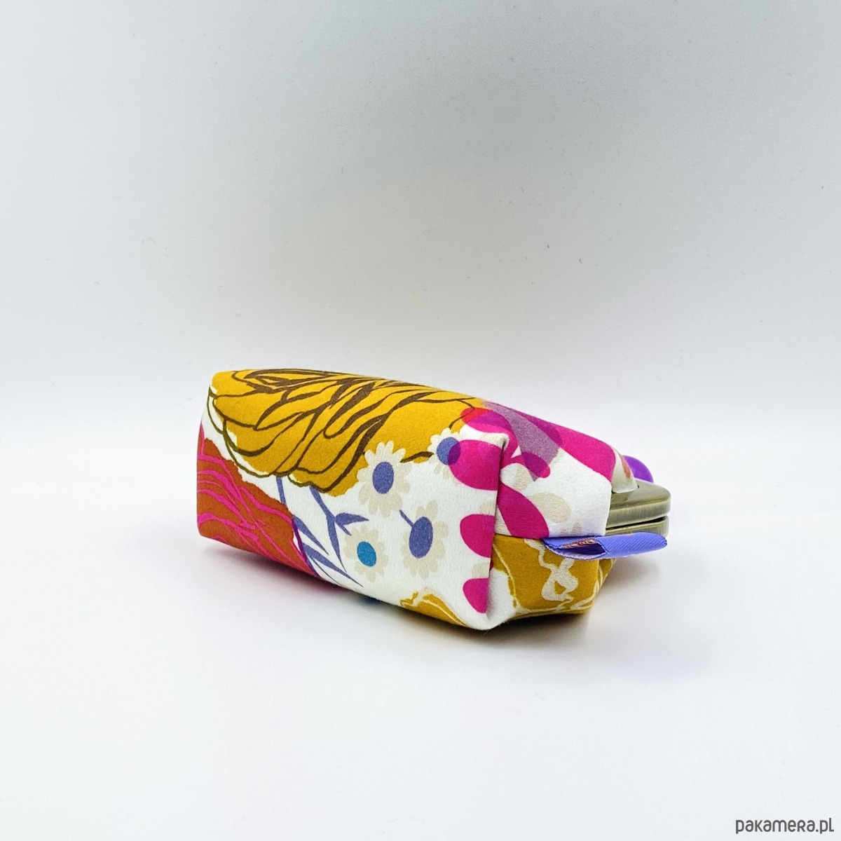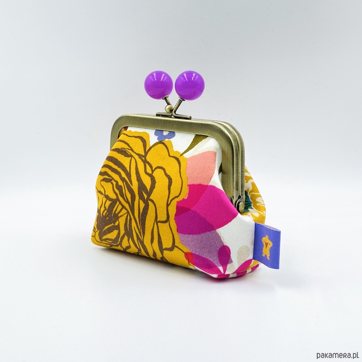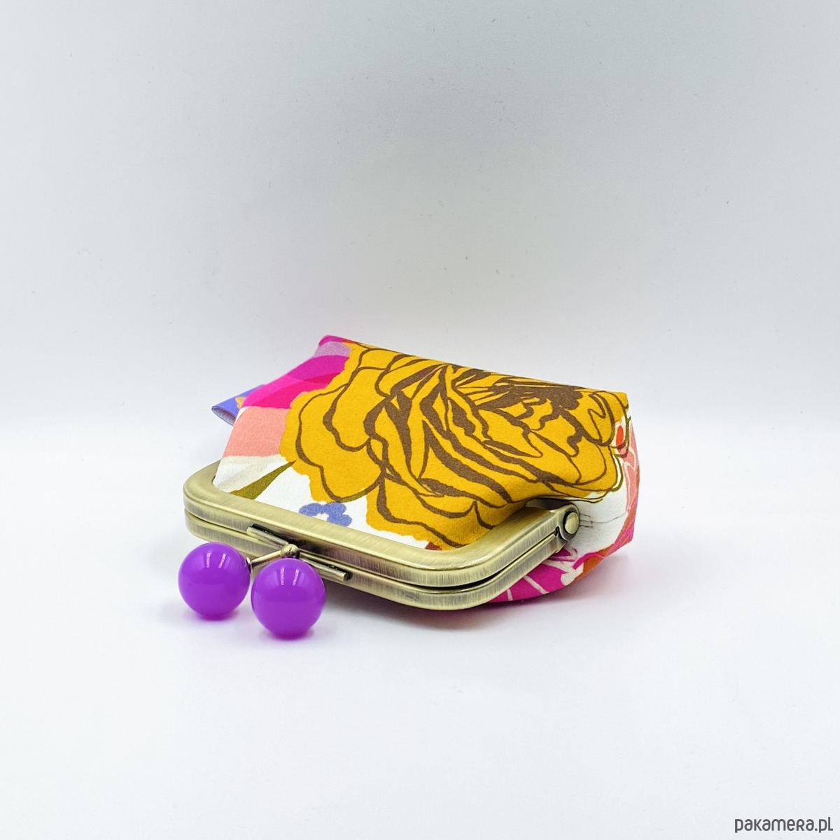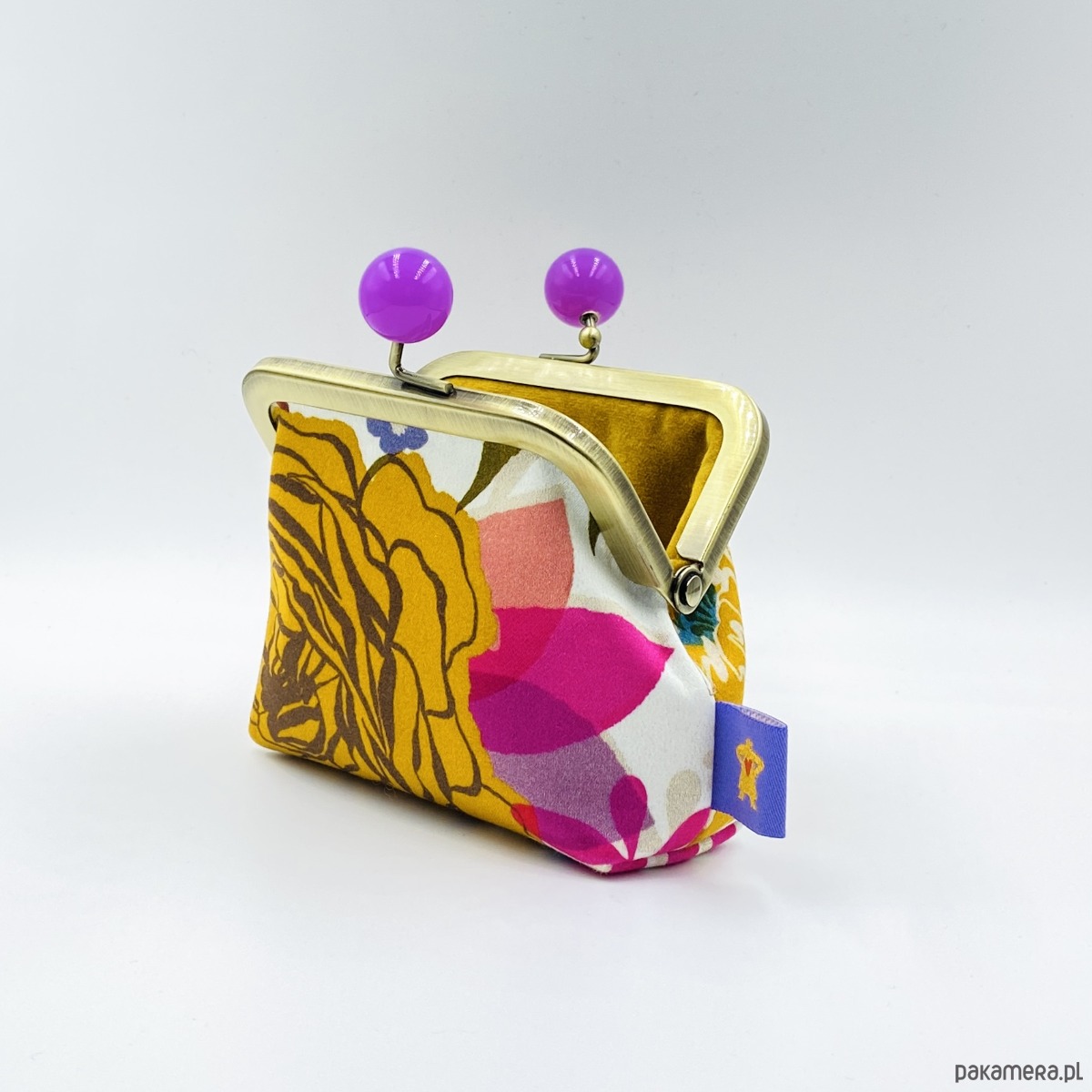 Portmonetka „Peonies and Roses Purple” przedstawia kwiaty piwonii i róży na białym tle satynowej, bawełnianej podszewki. Wewnętrzna podszewka wykonana została z prawdziwego aksamitu w miodowym kolorze. Jednokomorowa portmonetka, mieści w sobie karty kredytowe.