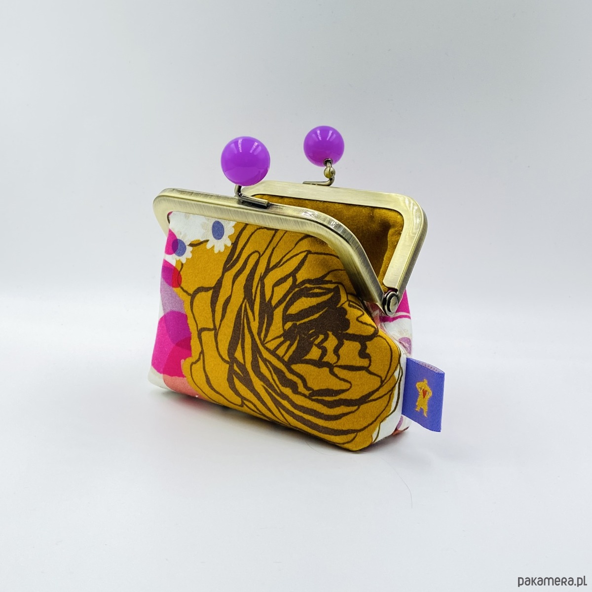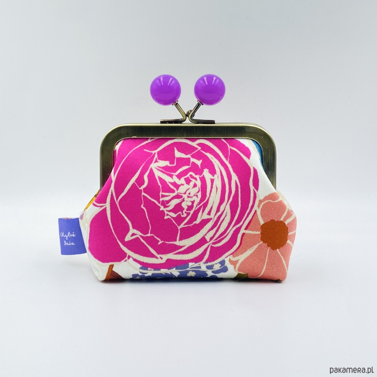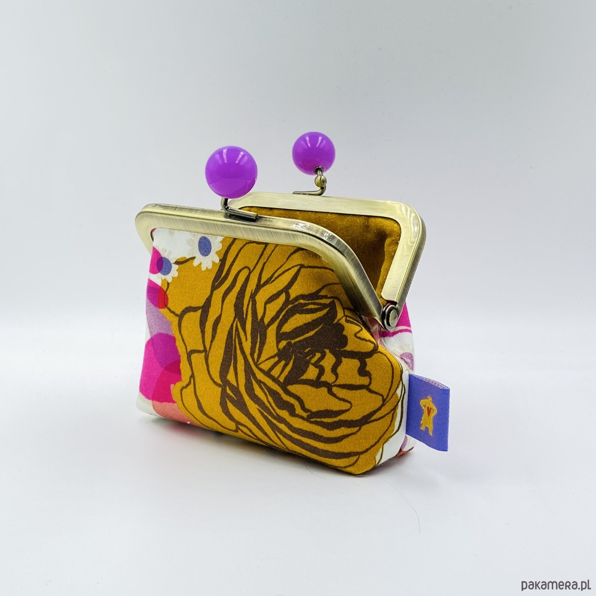 Portmonetka „Peonies and Roses Purple” przedstawia kwiaty piwonii i róży na białym tle satynowej, bawełnianej podszewki. Wewnętrzna podszewka wykonana została z prawdziwego aksamitu w miodowym kolorze. Jednokomorowa portmonetka, mieści w sobie karty kredytowe.