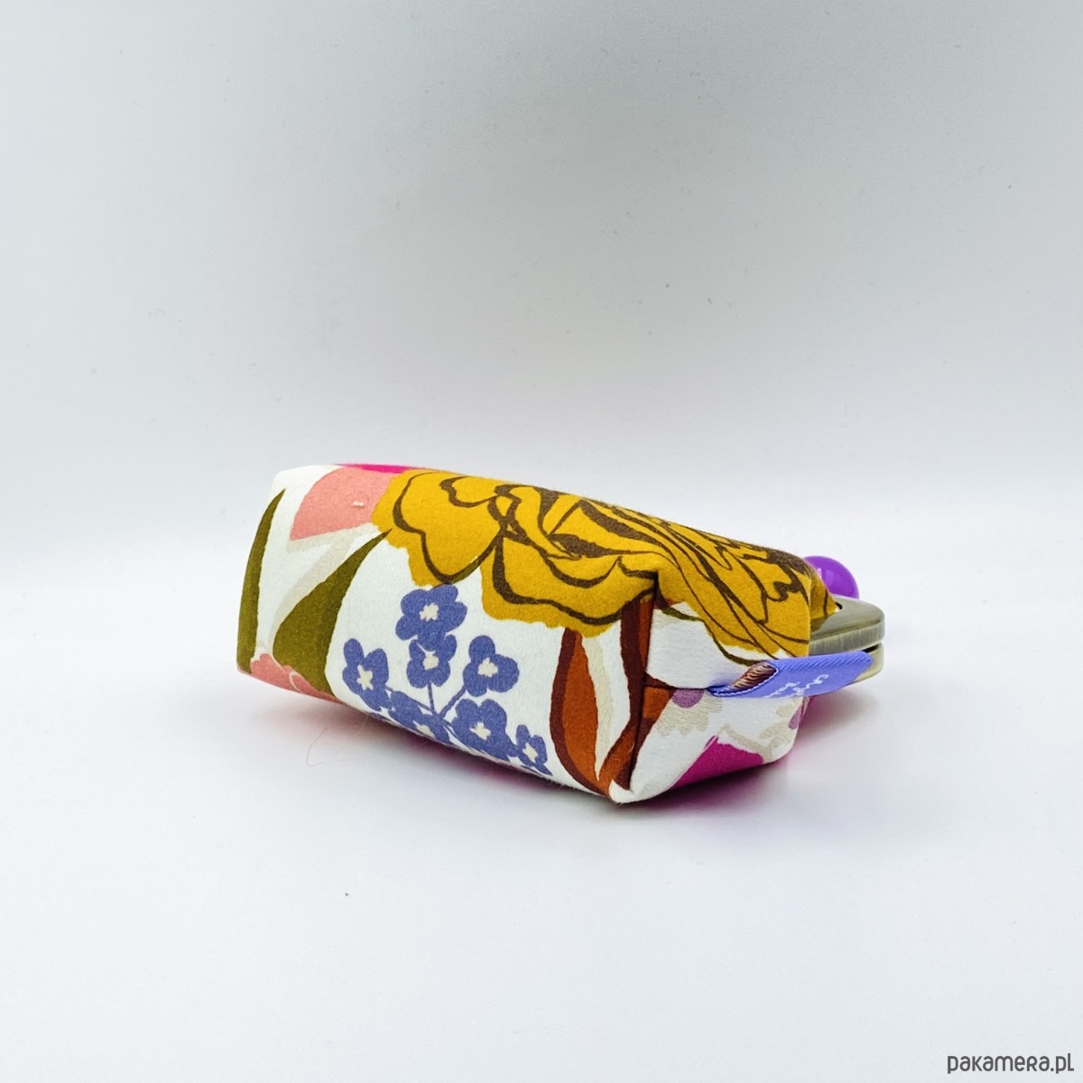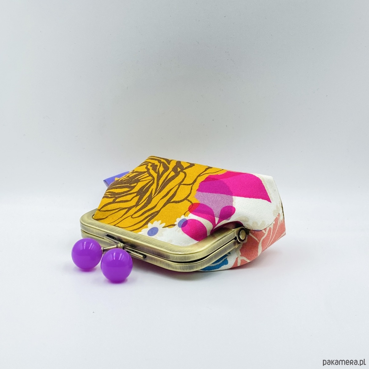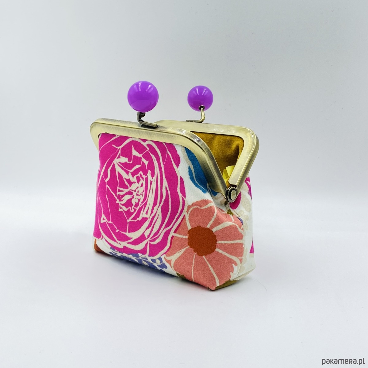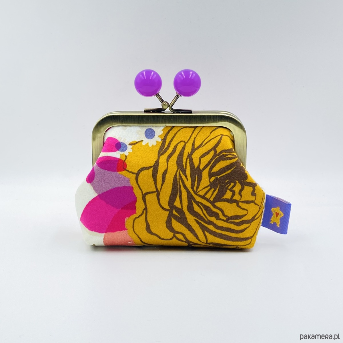 Portmonetka „Peonies and Roses Purple” przedstawia kwiaty piwonii i róży na białym tle satynowej, bawełnianej podszewki. Wewnętrzna podszewka wykonana została z prawdziwego aksamitu w miodowym kolorze. Jednokomorowa portmonetka, mieści w sobie karty kredytowe.