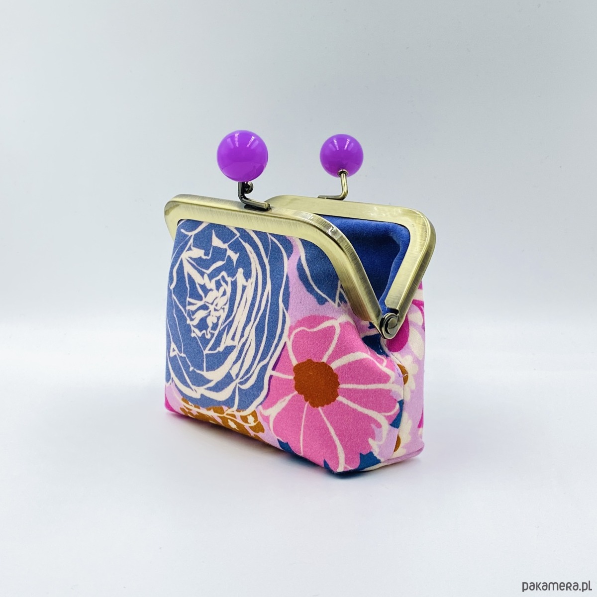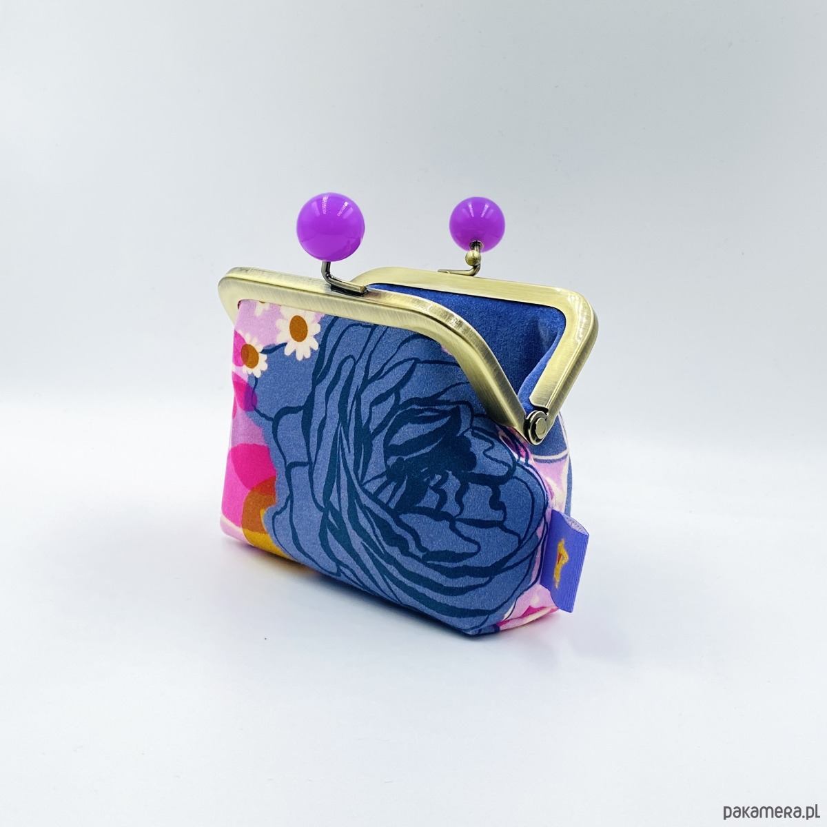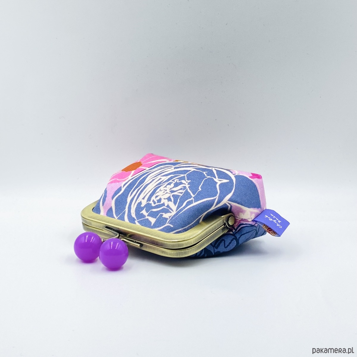Portmonetka „Peonies and Roses Purple” przedstawia kwiaty piwonii i róży na białym tle satynowej, bawełnianej podszewki. Wewnętrzna podszewka wykonana została z prawdziwego aksamitu w błękitnym kolorze. Jednokomorowa portmonetka, mieści w sobie karty kredytowe.