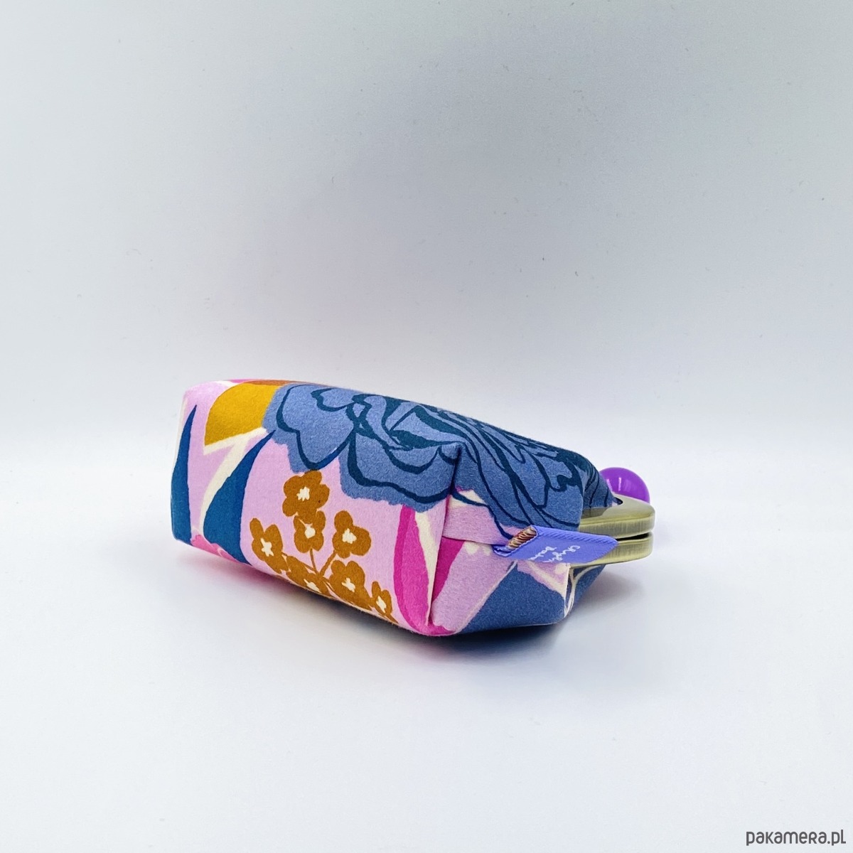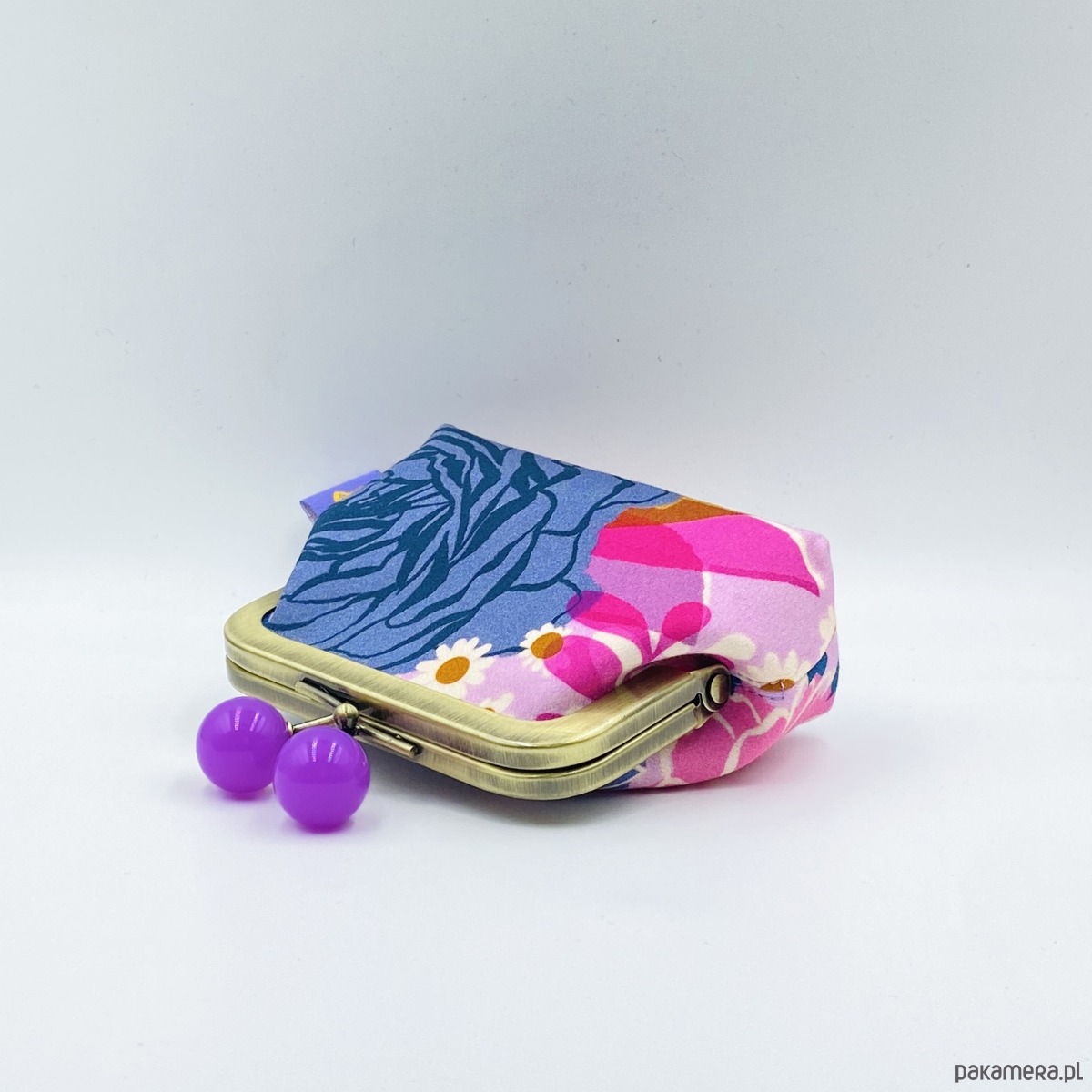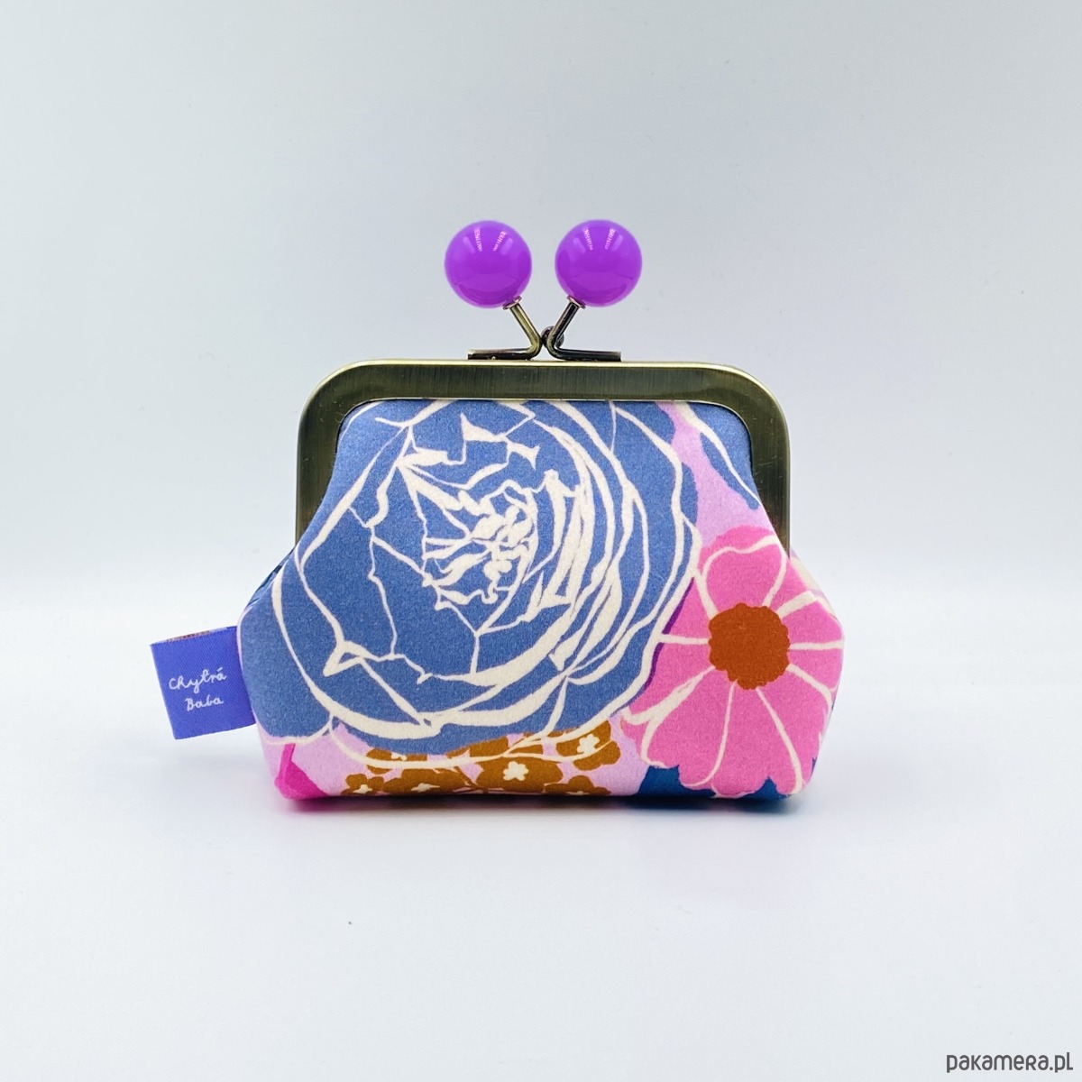 Portmonetka „Peonies and Roses Purple” przedstawia kwiaty piwonii i róży na białym tle satynowej, bawełnianej podszewki. Wewnętrzna podszewka wykonana została z prawdziwego aksamitu w błękitnym kolorze. Jednokomorowa portmonetka, mieści w sobie karty kredytowe.