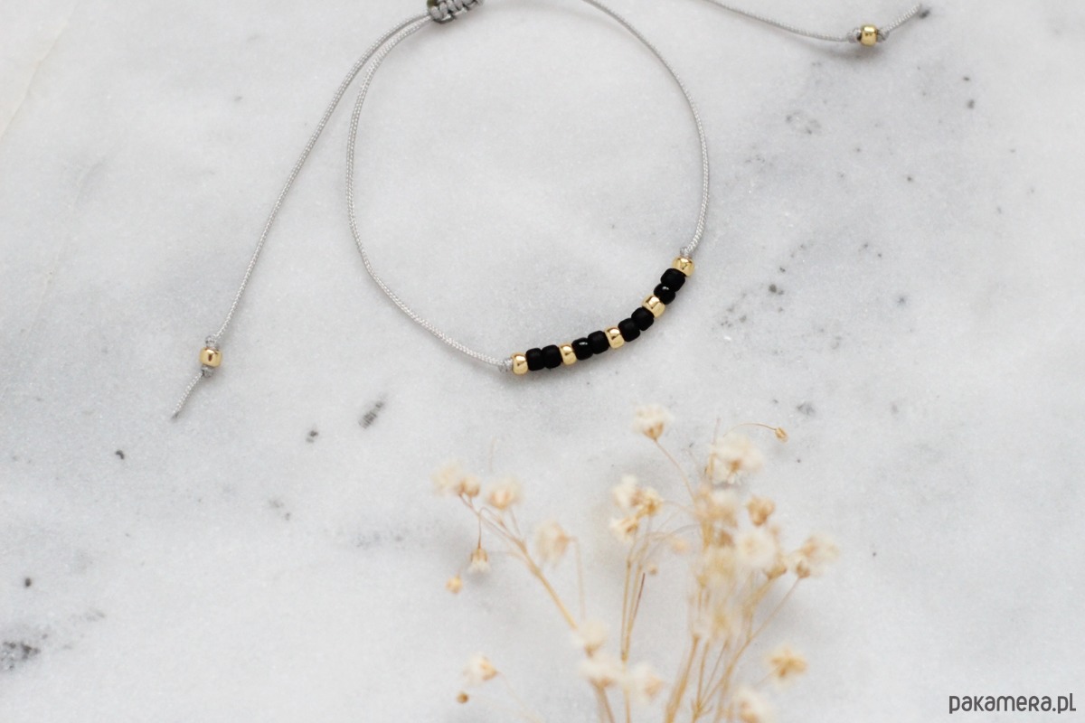 w bransoletce z czarnymi koralikami: czarny błyszczący - kropkę, czarny matowy - kreskę, złoty - oddziela każdą literę
