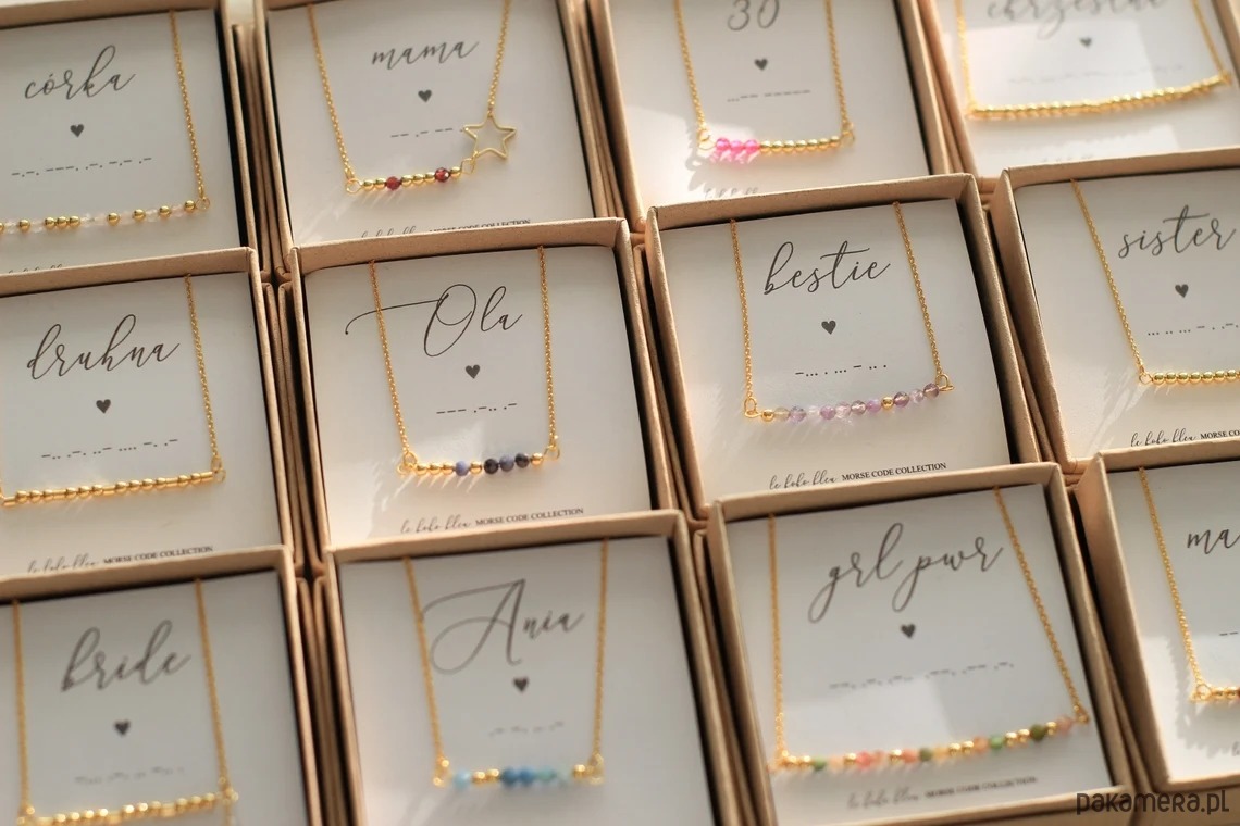 Delikatny naszyjnik z ukrytą wiadomością zapisaną alfabetem Morse'a.