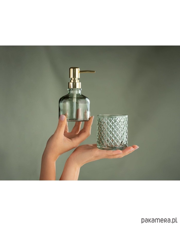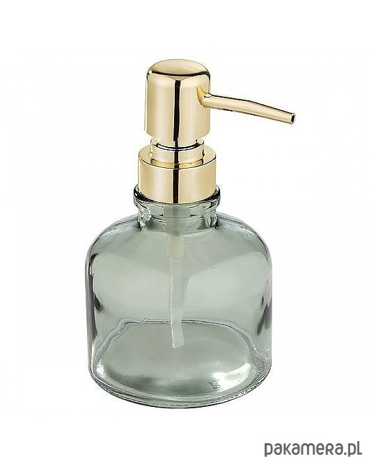 Dozownik do mydła. Ułatwia aplikację mydła w płynie lub żelu. Wykonany z wysokiej szkła. Pompka jest w kolorze złotym. Przeznaczony do wielokrotnego napełniania.