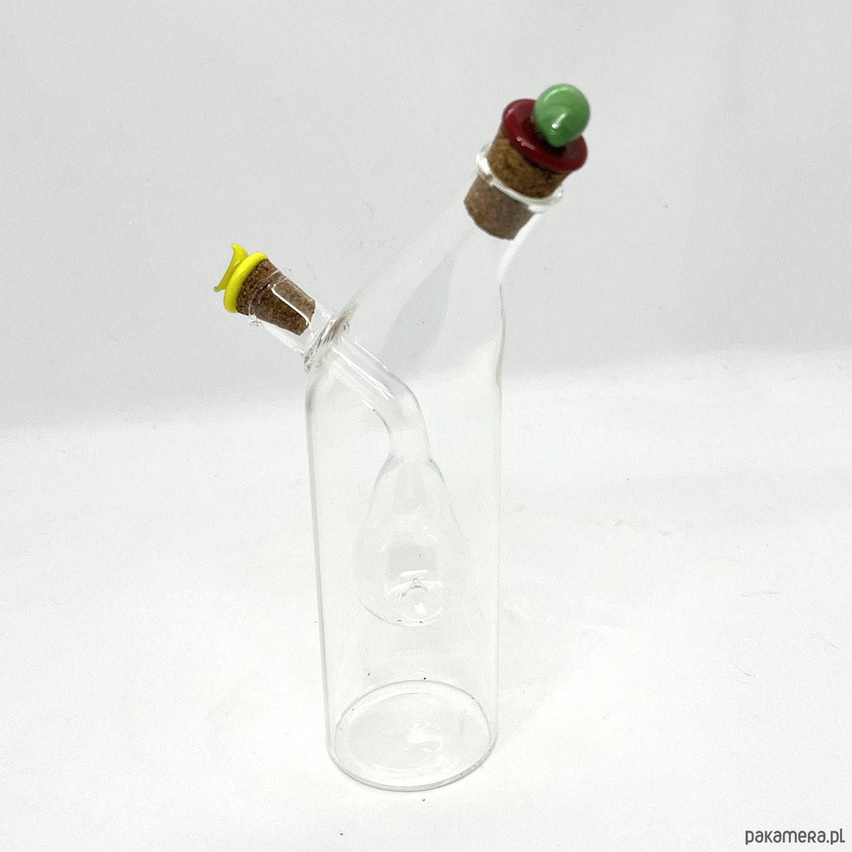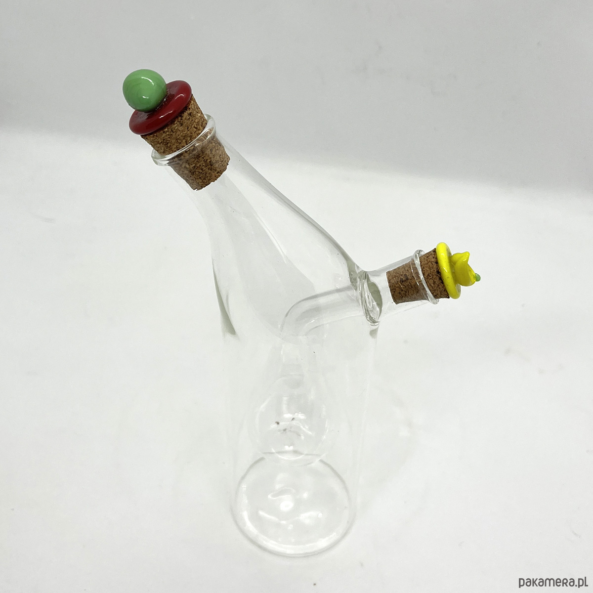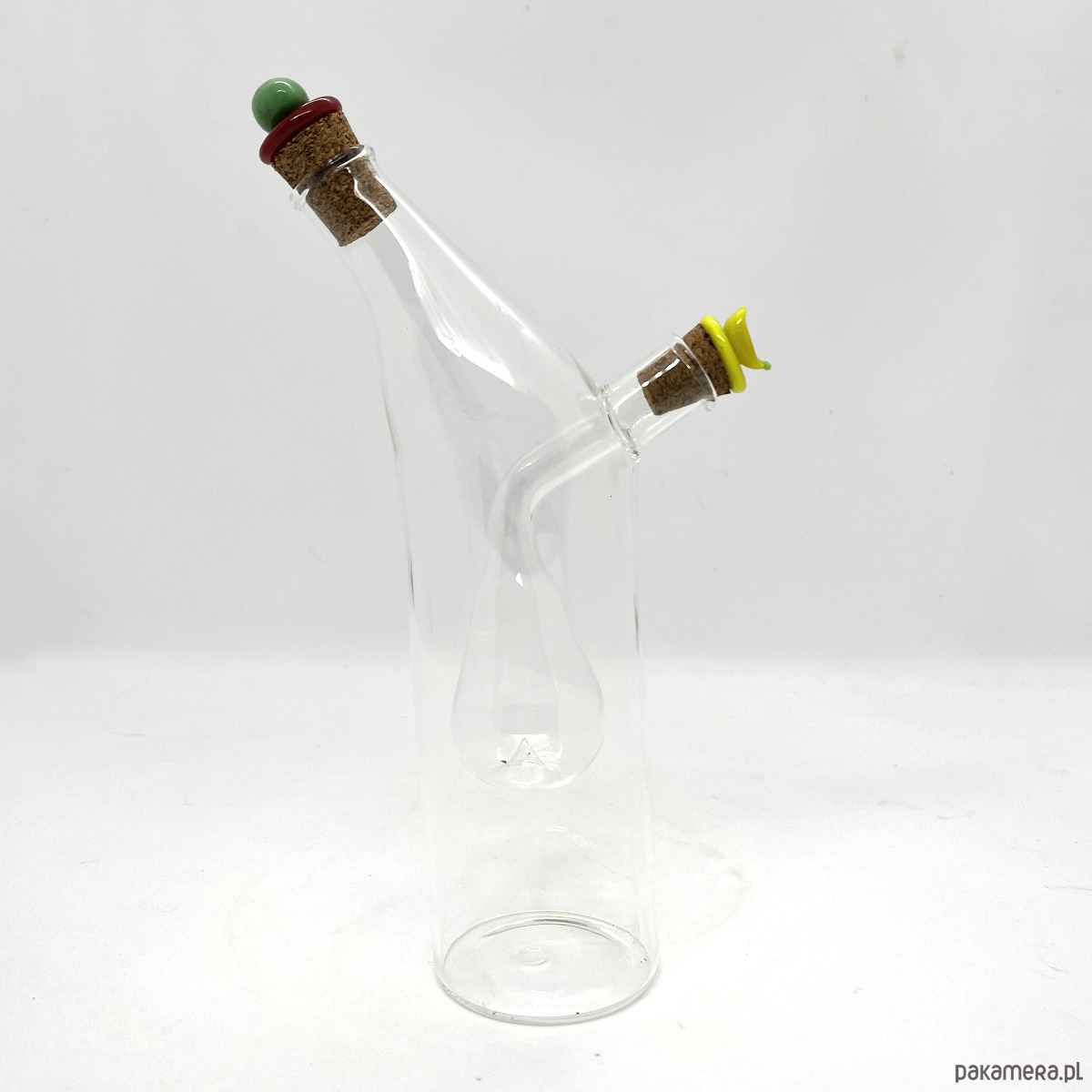 Dozownik składa się z dwóch osobnych zbiorników, które pozwalają na przechowywanie i serwowanie oliwy i octu jednocześnie. Zatyczki wykonane są z naturalnego korka, co pozwala na bezpieczne i trwałe przechowywanie produktów. Szkło w stylu murano, z którego wykonany jest dozownik, wyróżnia się pięknymi, kolorowymi wstawkami, które nadają mu niepowtarzalnego charakteru.