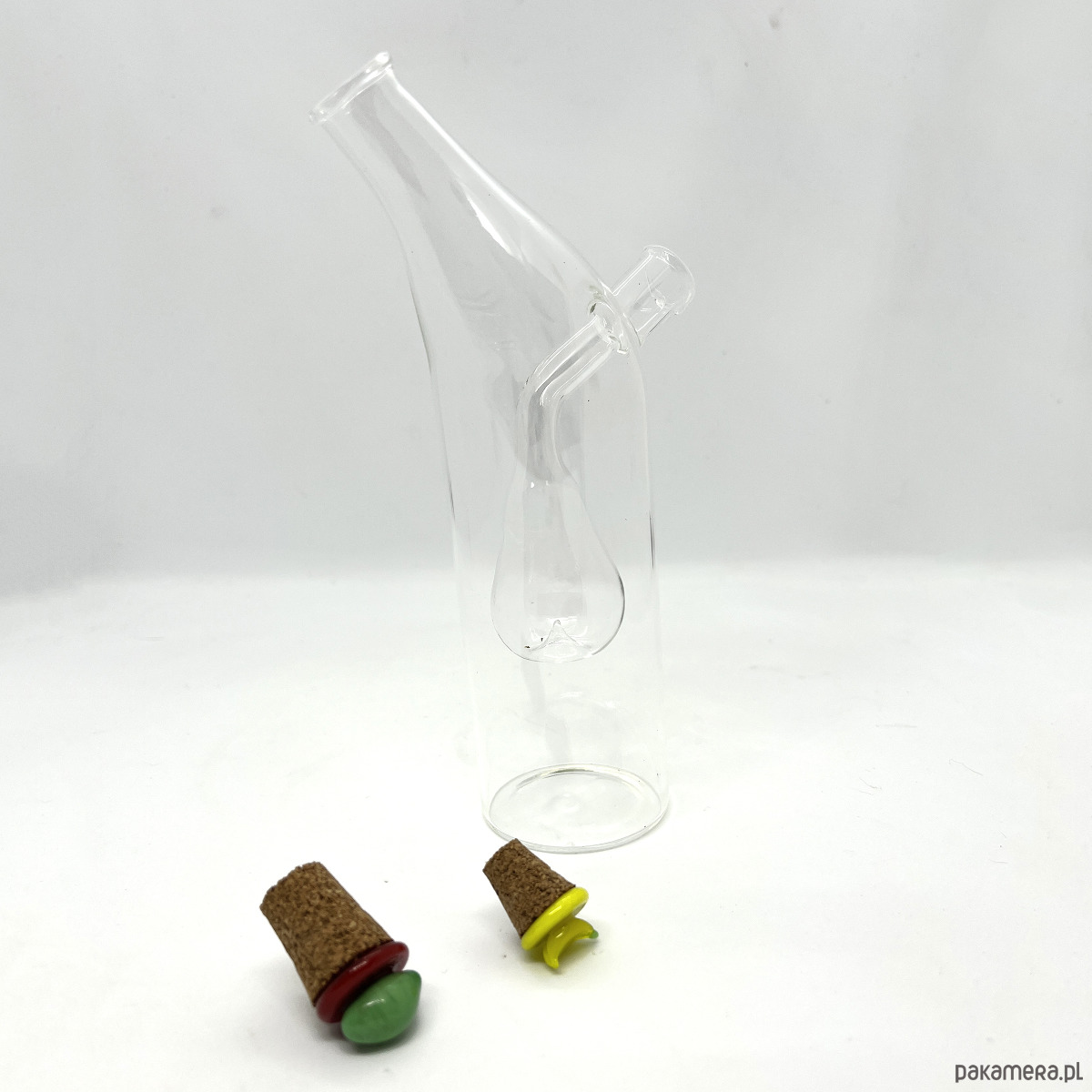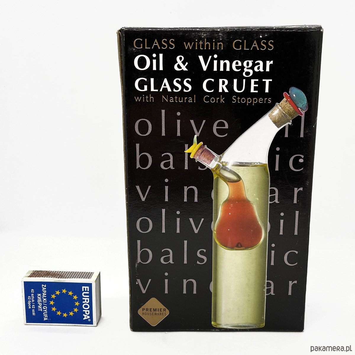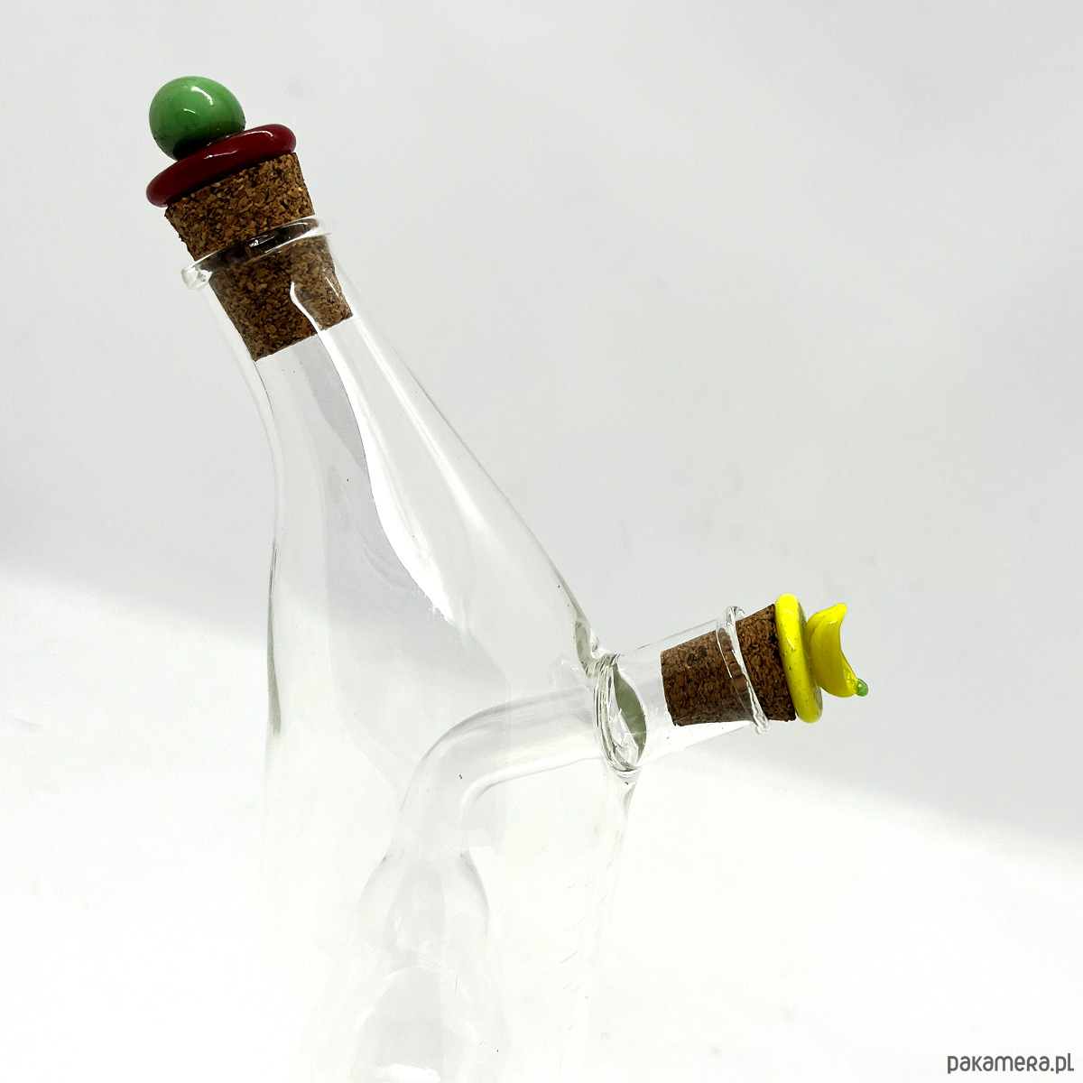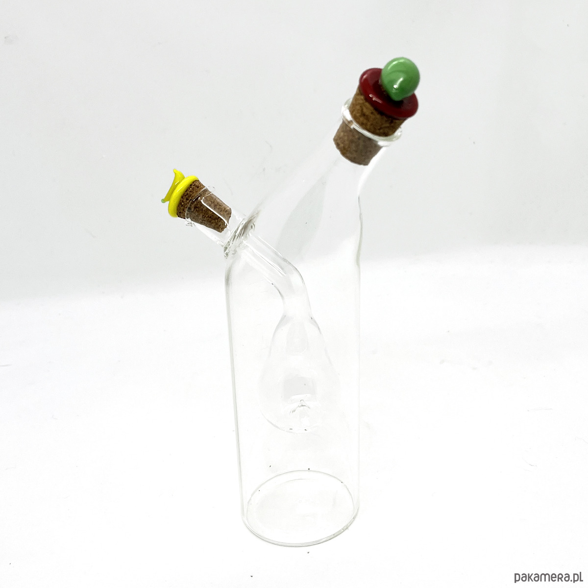 Dozownik składa się z dwóch osobnych zbiorników, które pozwalają na przechowywanie i serwowanie oliwy i octu jednocześnie. Zatyczki wykonane są z naturalnego korka, co pozwala na bezpieczne i trwałe przechowywanie produktów. Szkło w stylu murano, z którego wykonany jest dozownik, wyróżnia się pięknymi, kolorowymi wstawkami, które nadają mu niepowtarzalnego charakteru.