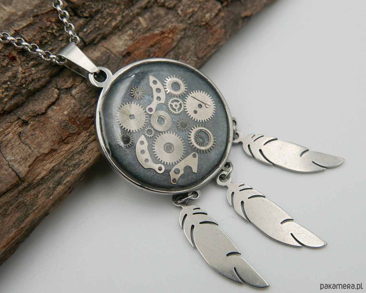Wyjątkowy naszyjnik w formie łapacza snów, wykonany z oksydowanego metalu, żywicy i detali mechanizmu zegarka. Subtelne połączenie tych materiałów tworzy efektowny, industrialny akcent, idealny dla osób ceniących unikalne i pełne symboliki dodatki.