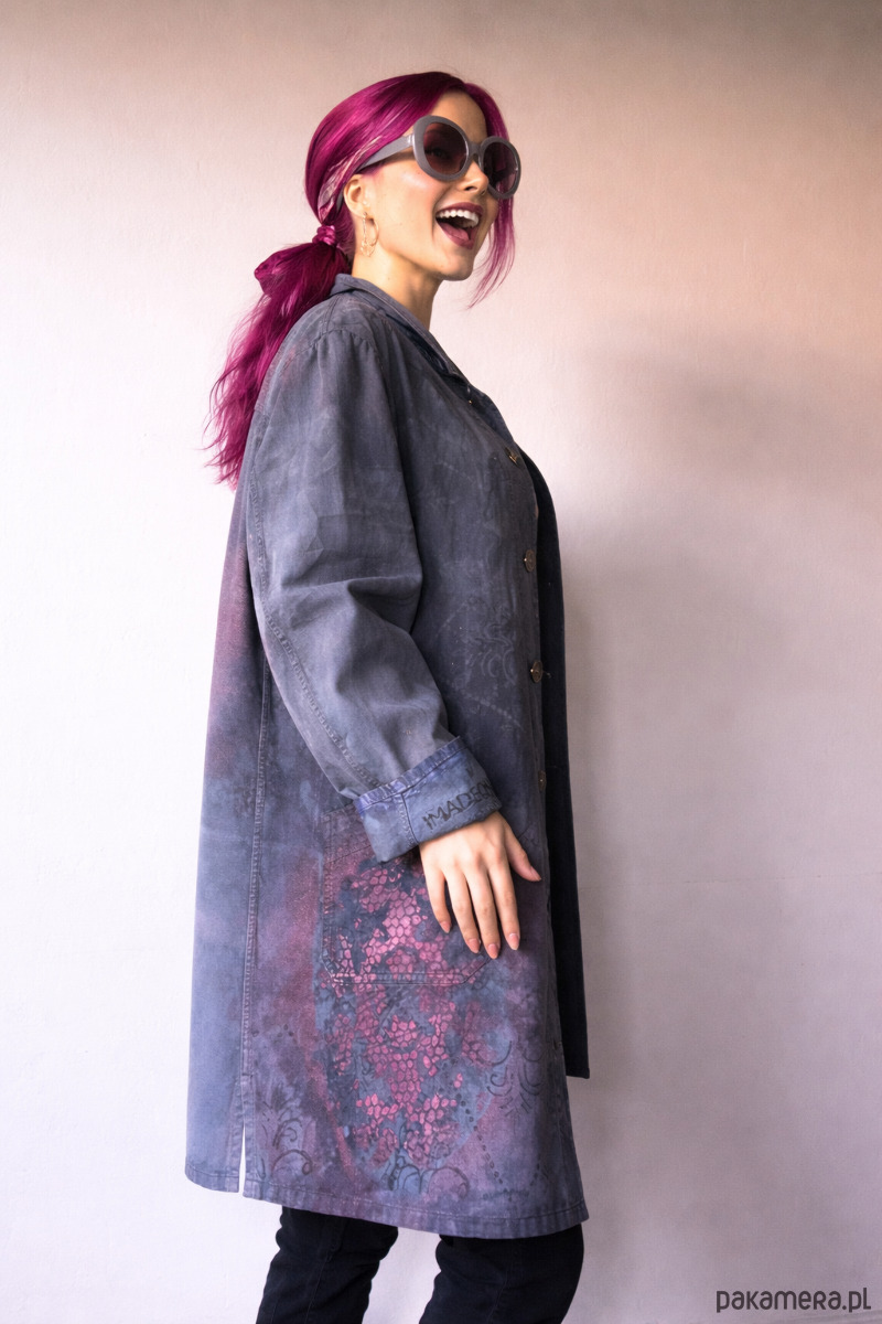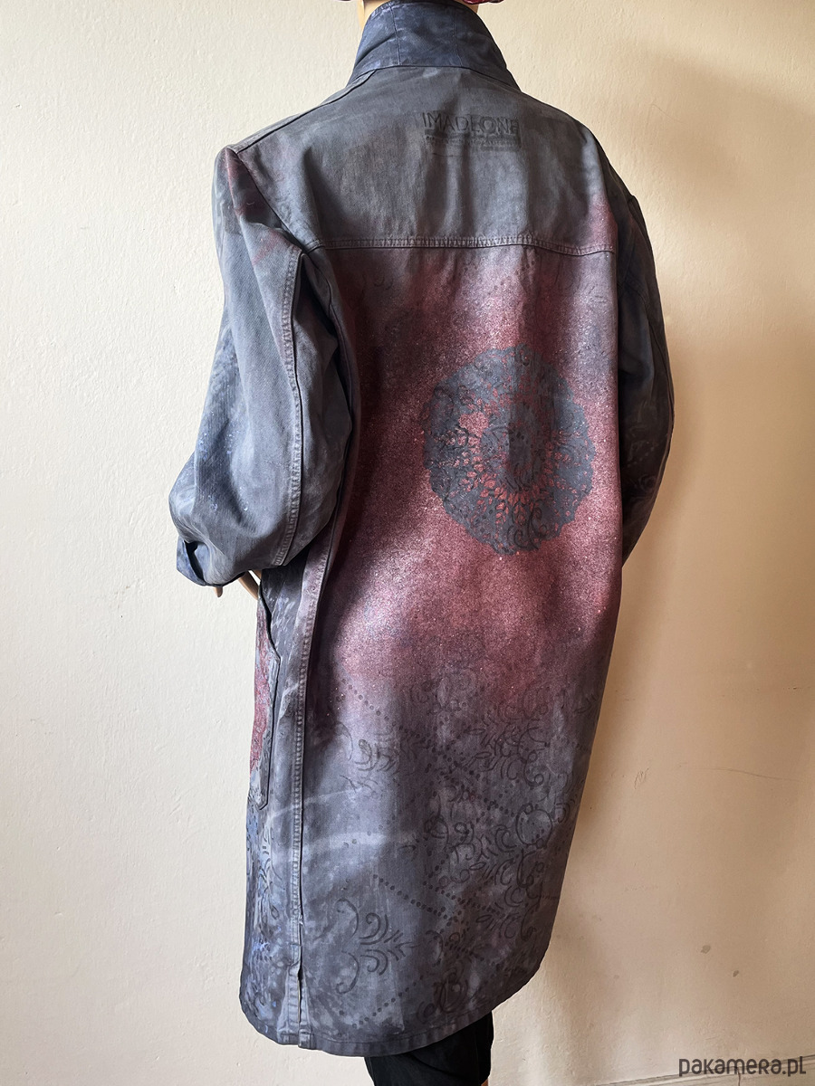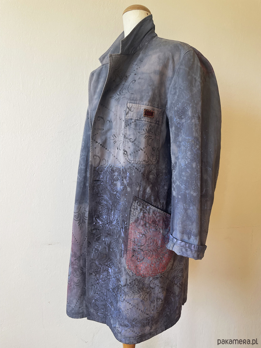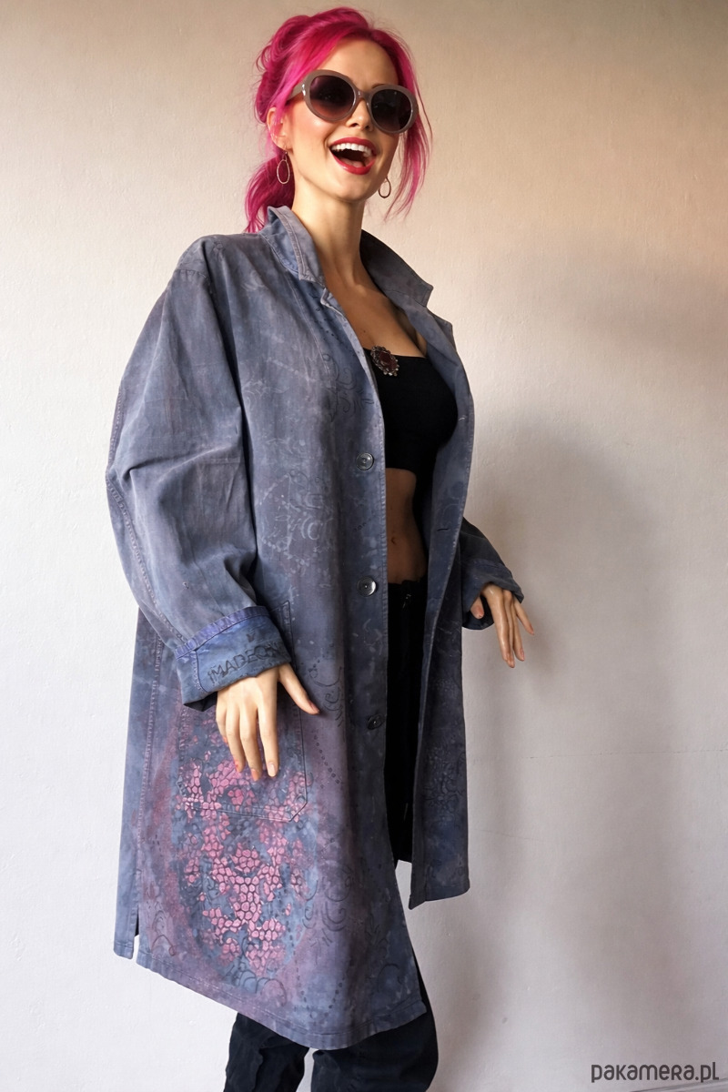 Drelichowy, ‘’roboczy’’ w kroju i w charakterze płaszcz Denim. Z cyklu matiUP. Odbarwiany, malowany, drukowany. Idealny do dresów ale i na elegancką bibę : ) Typowy oversize. Wymiary : Długość 93 cm, długość rękawa ( od wszycia ) 60 cm, szerokość w biuście 120 cm, szerokość na dole 120 cm, 2 małe rozporki z tyłu po 9 cm, szerokość pleców 43 cm. Pokazuję na manekinie w rozmiarze 38. Oczywiście niepowtarzalny, jeden jedyny na świecie. Designed & Made by Matylda Leśnikowska