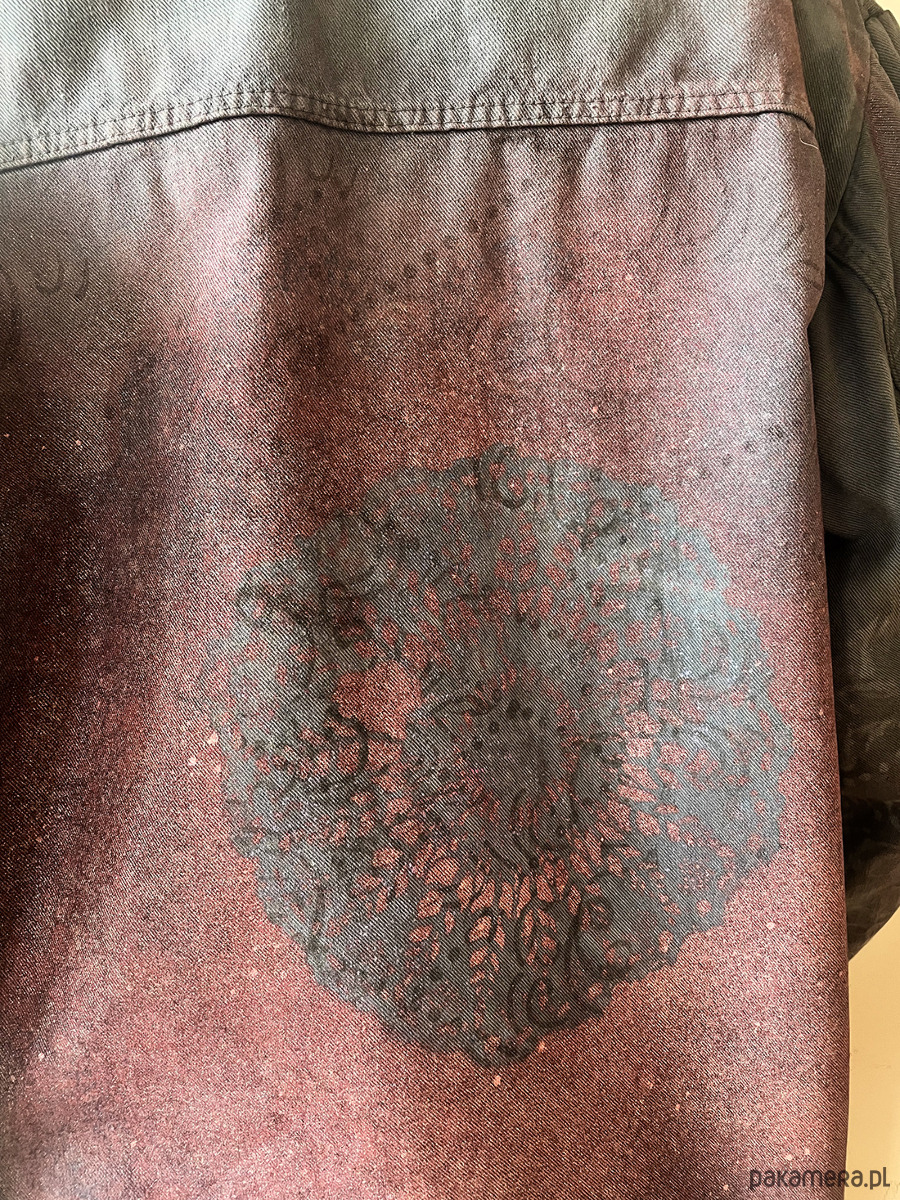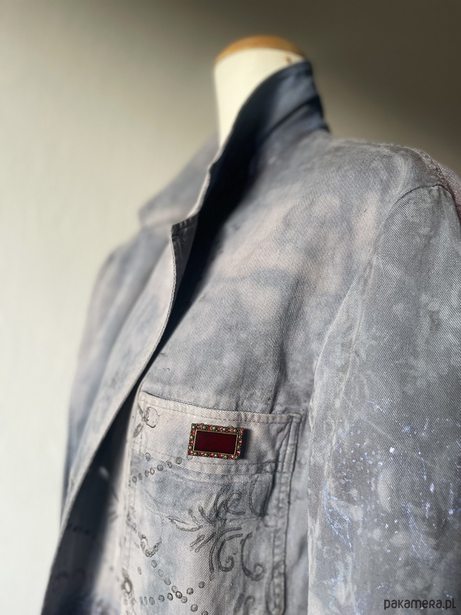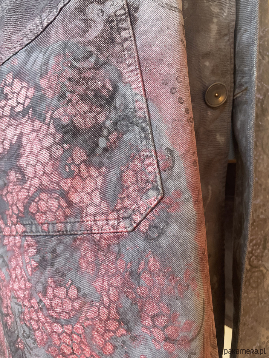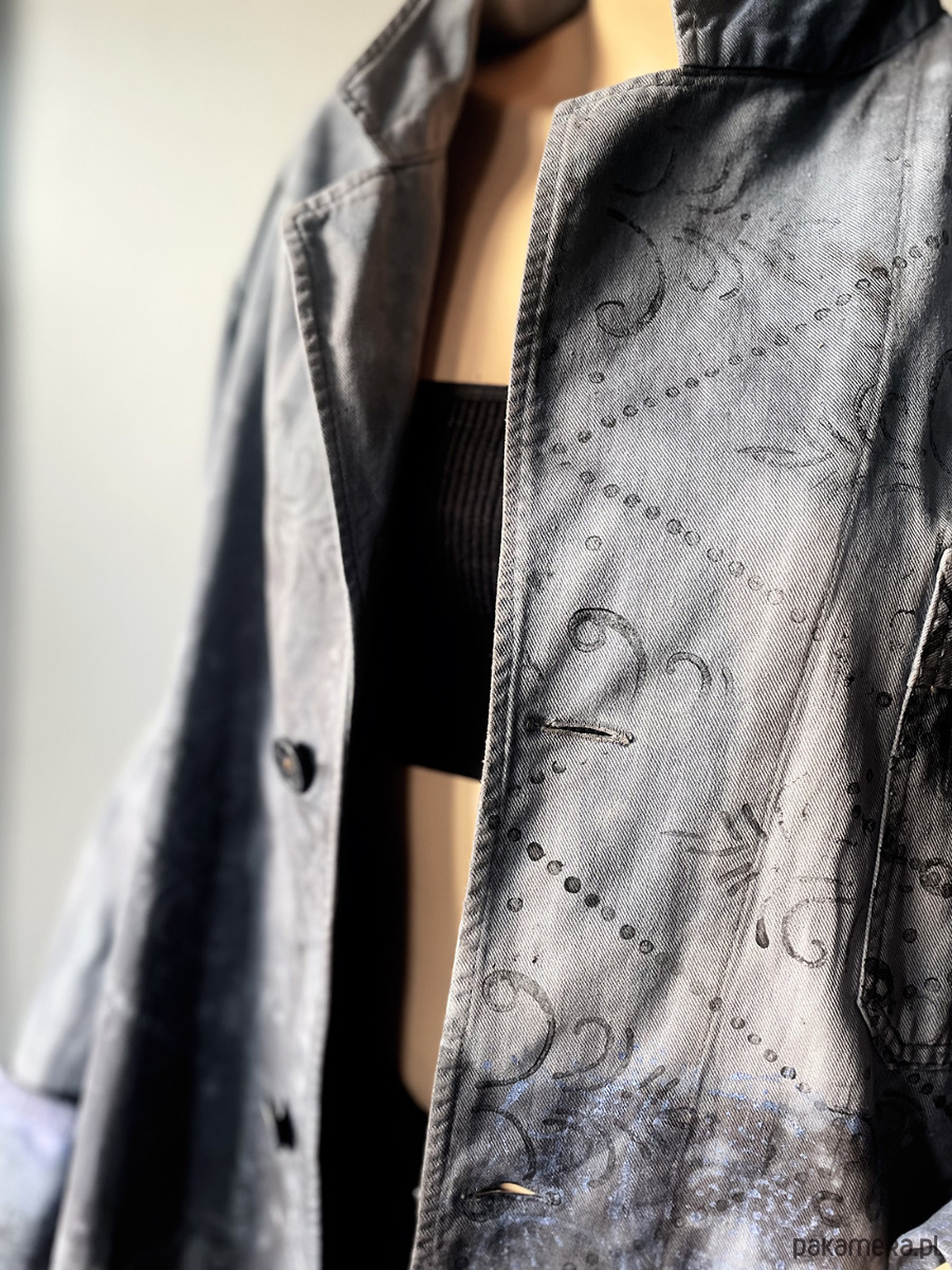 Drelichowy, ‘’roboczy’’ w kroju i w charakterze płaszcz Denim. Z cyklu matiUP. Odbarwiany, malowany, drukowany. Idealny do dresów ale i na elegancką bibę : ) Typowy oversize. Wymiary : Długość 93 cm, długość rękawa ( od wszycia ) 60 cm, szerokość w biuście 120 cm, szerokość na dole 120 cm, 2 małe rozporki z tyłu po 9 cm, szerokość pleców 43 cm. Pokazuję na manekinie w rozmiarze 38. Oczywiście niepowtarzalny, jeden jedyny na świecie. Designed & Made by Matylda Leśnikowska