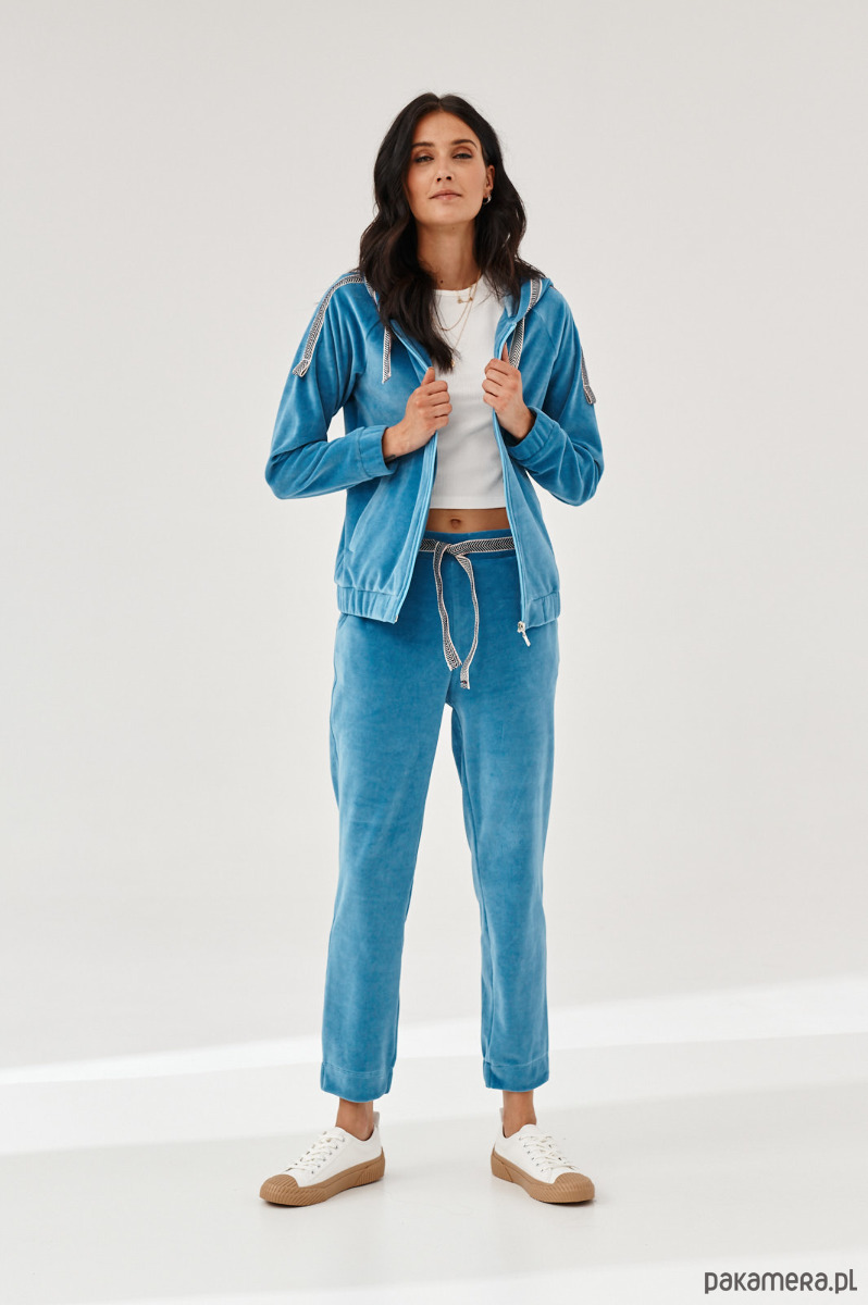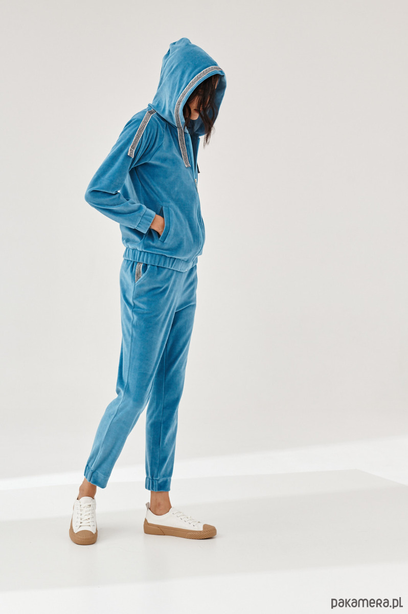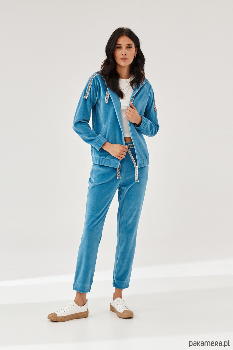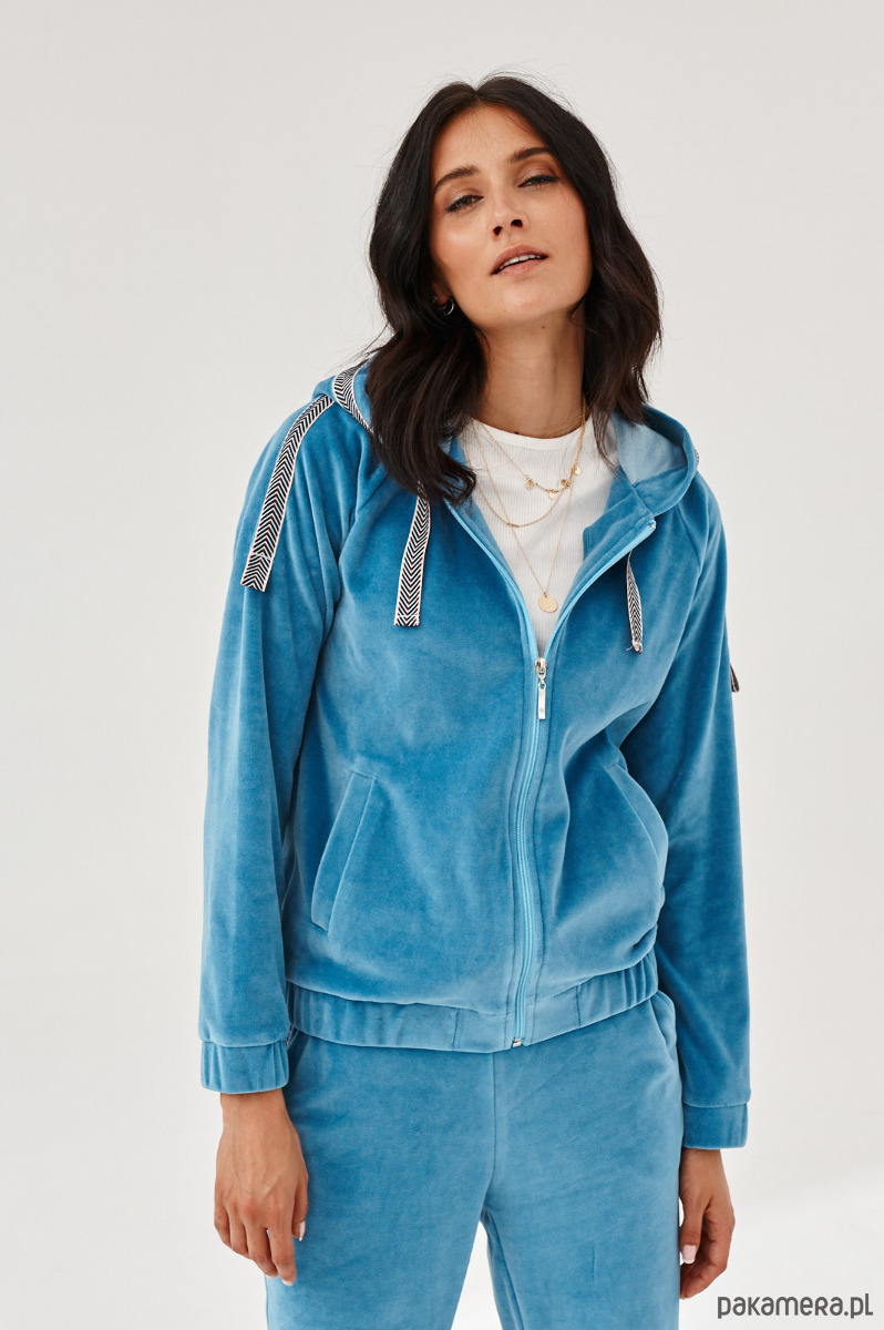Bluza AMIKA uszyta z miękkiej dzianiny. Dzianina to połączenie bawełny z elastanem, która posiada certyfikat EOKO-TEX. Bluza jest zapinana na zamek. Dół bluzy oraz rękawy ujęte w gumę. Na przodzie kieszenie. Kaptur oraz rękawy ozdobione taśmą. Taśma ze sportowymi akcentami, tkana w jodełkę.
