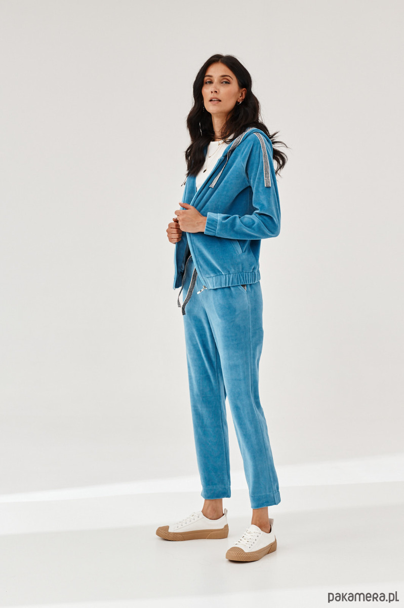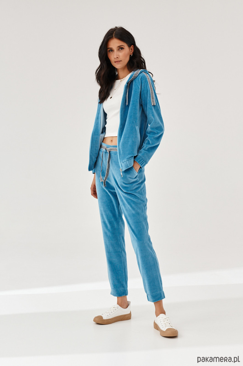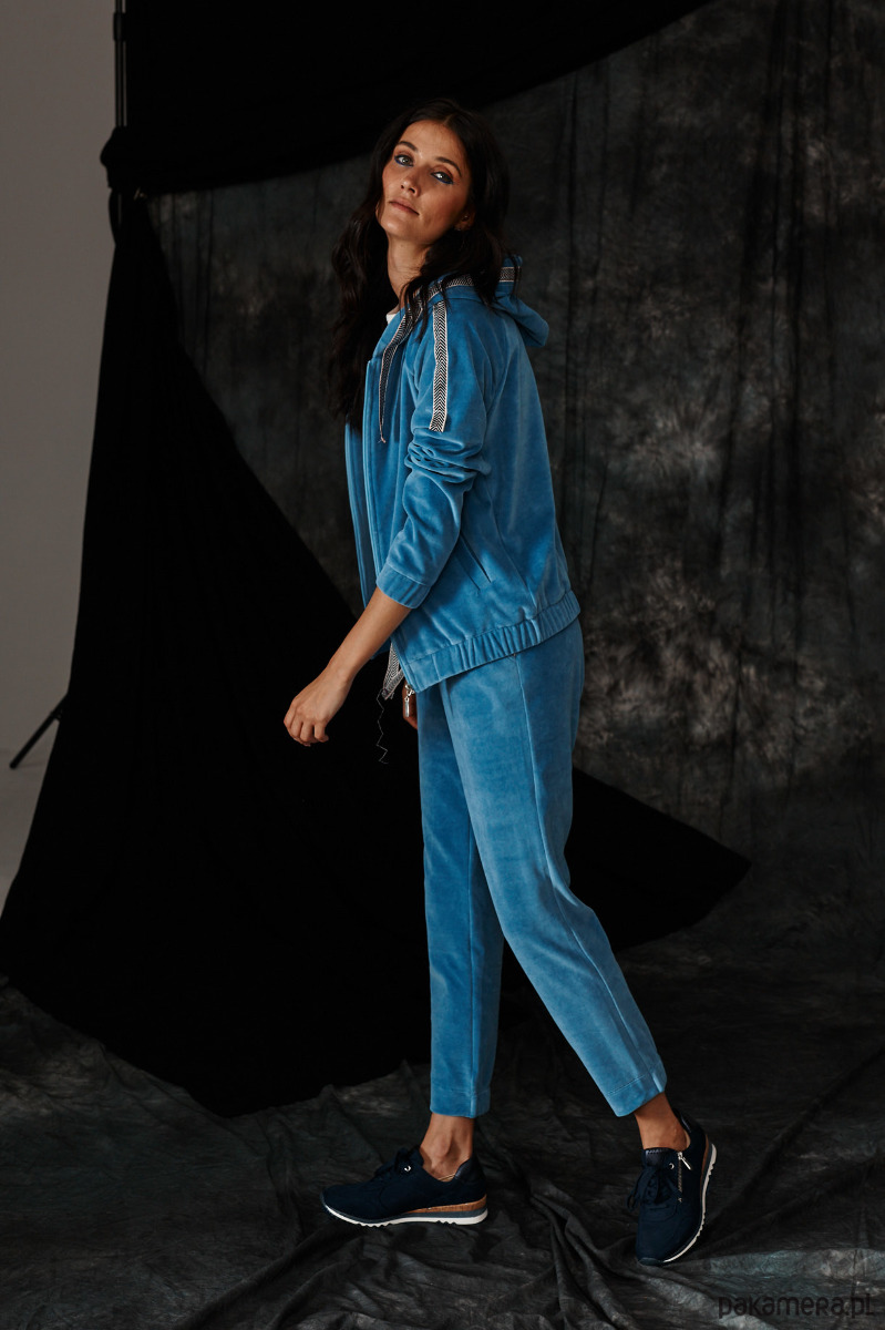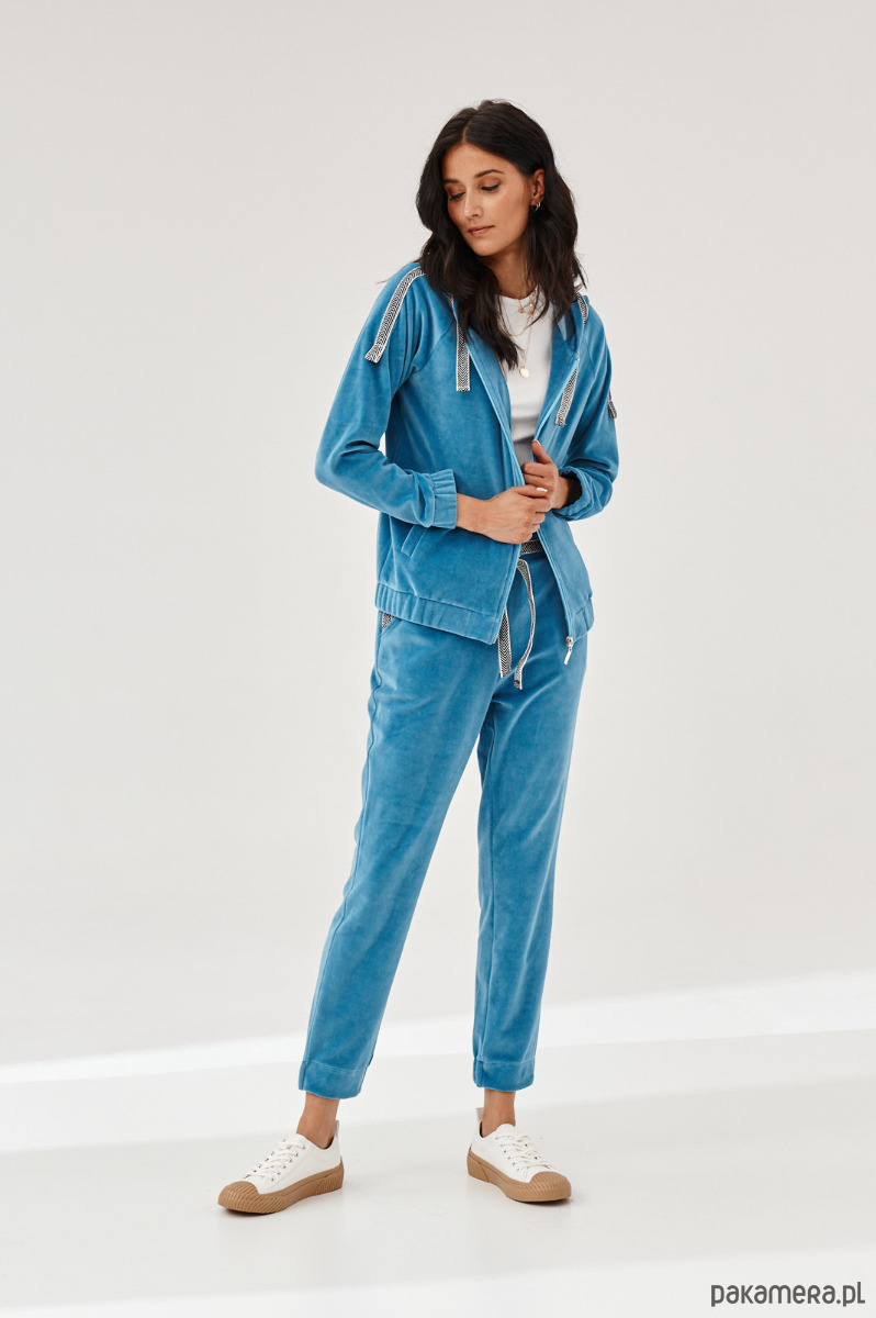 Bluza AMIKA uszyta z miękkiej dzianiny. Dzianina to połączenie bawełny z elastanem, która posiada certyfikat EOKO-TEX. Bluza jest zapinana na zamek. Dół bluzy oraz rękawy ujęte w gumę. Na przodzie kieszenie. Kaptur oraz rękawy ozdobione taśmą. Taśma ze sportowymi akcentami, tkana w jodełkę.