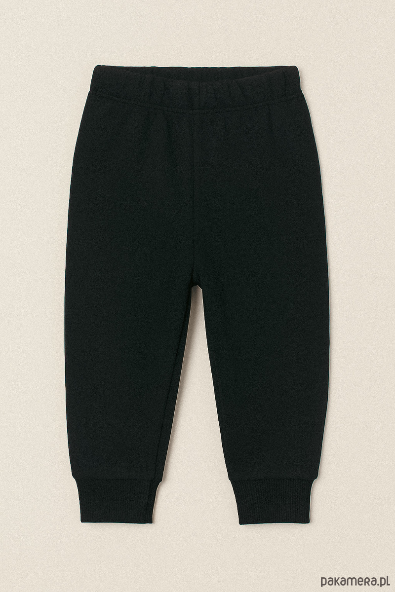 ✔ Czarne spodnie baggy – szersze u góry i zwężane ku dołowi, z elastycznym pasem i ściągaczami przy nogawkach.