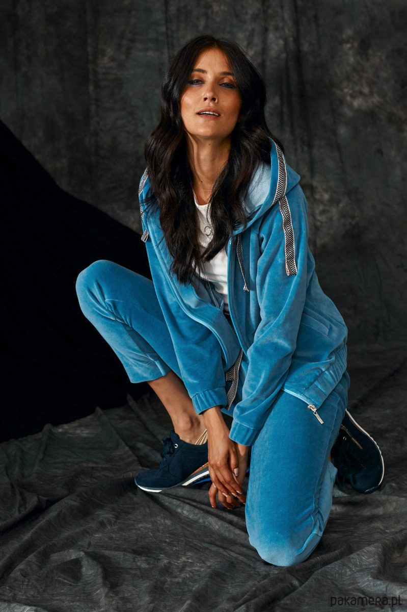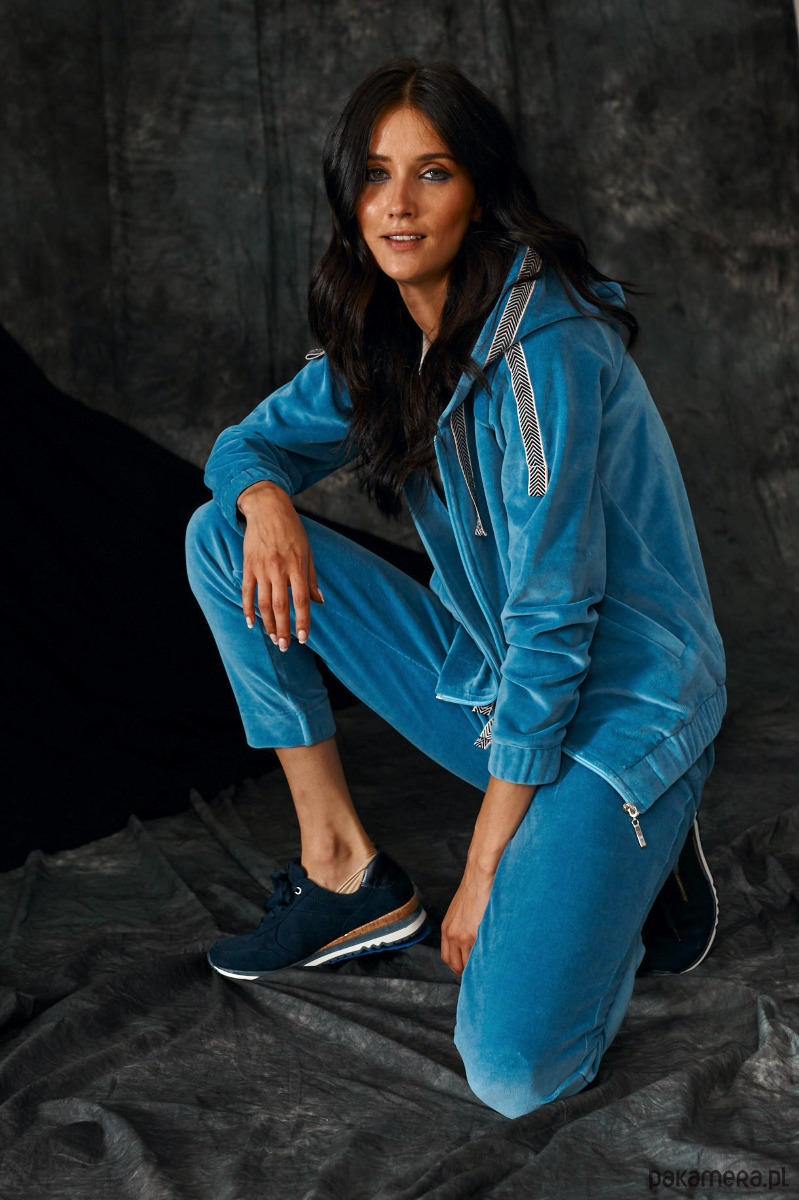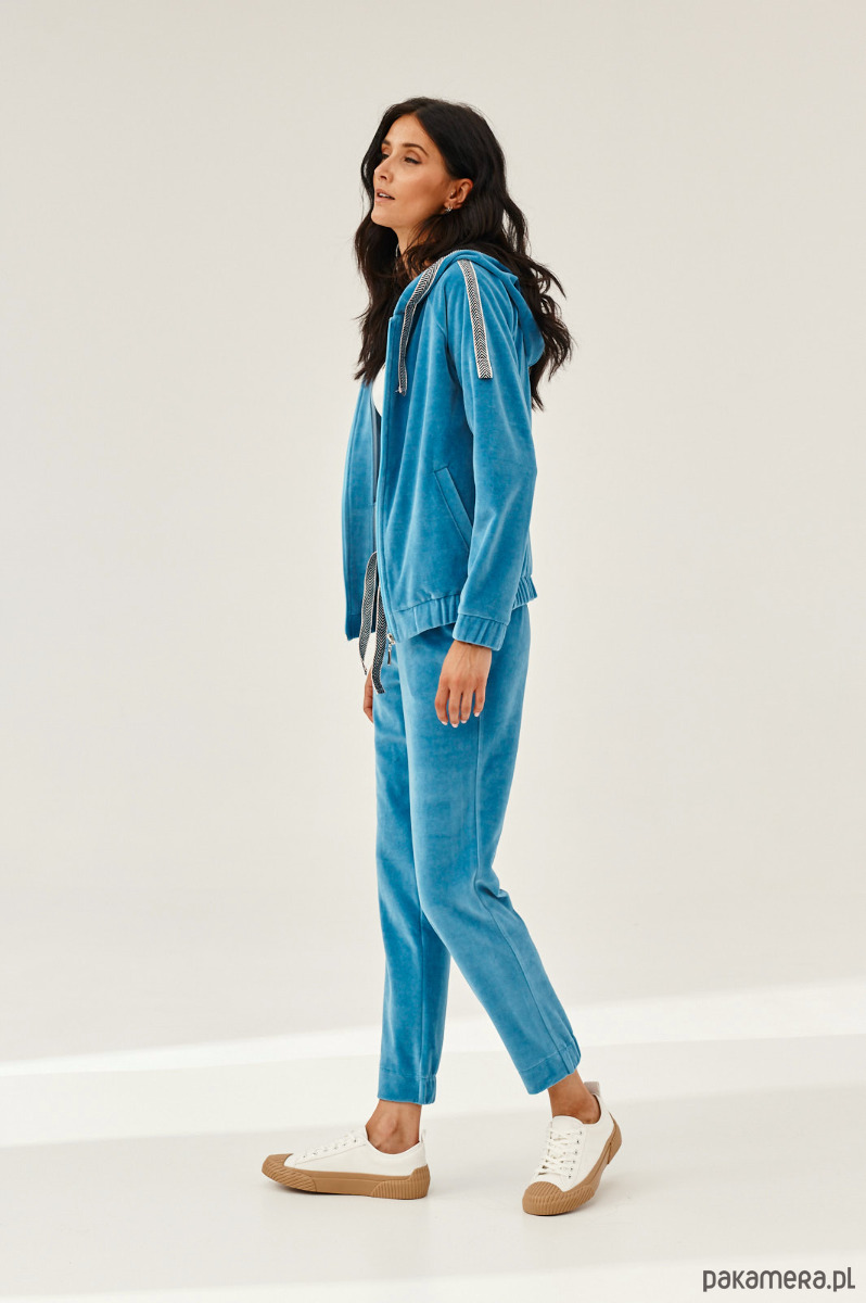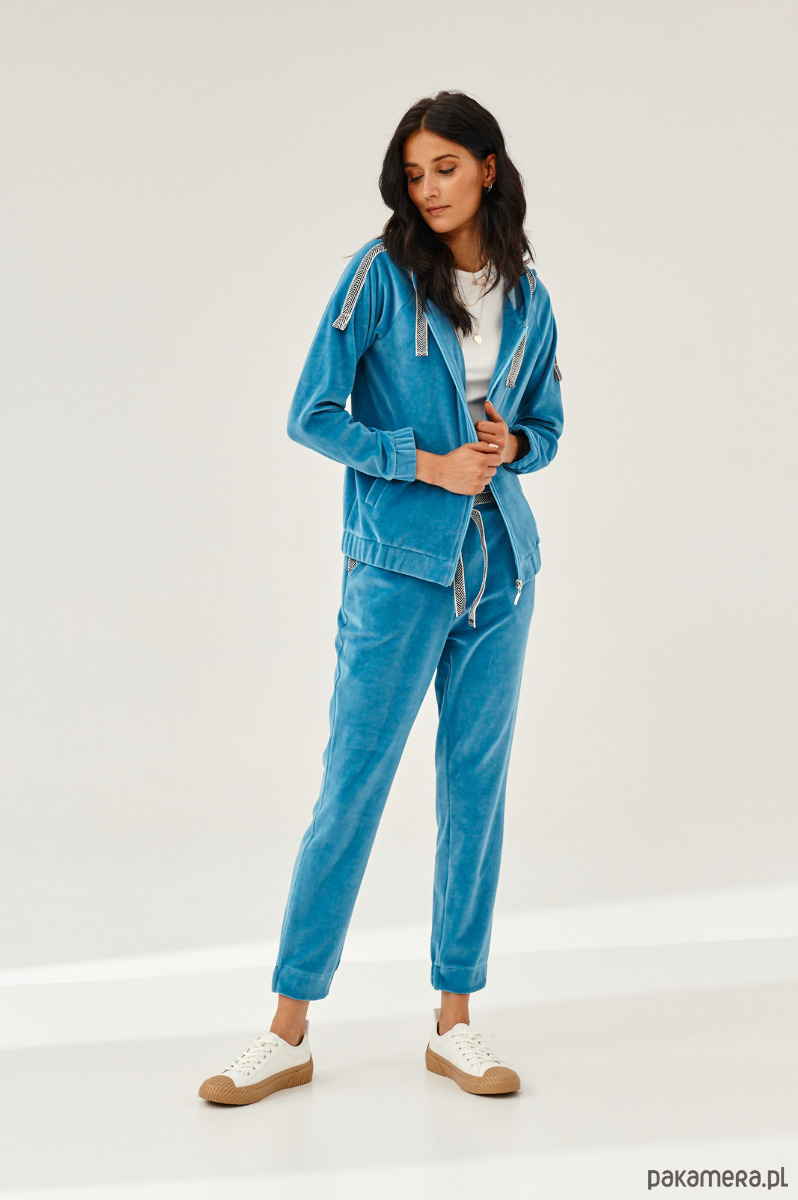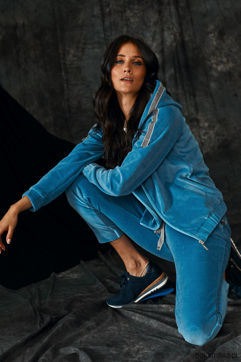 Bluza AMIKA uszyta z miękkiej, welurowej dzianiny. Dzianina to połączenie bawełny z elastanem, która posiada certyfikat EOKO-TEX. Bluza jest zapinana na zamek. Dół bluzy oraz rękawy ujęte w gumę. Na przodzie kieszenie. Kaptur oraz rękawy ozdobione taśmą. Taśma ze sportowymi akcentami, tkana w jodełkę.