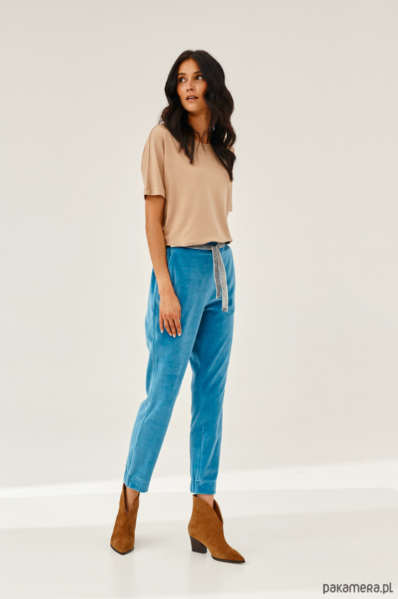 Spodnie ALDO uszyte z miękkiej, welurowej dzianiny. Dzianina to połączenie bawełny z elastanem, która posiada certyfikat OEKO-TEX. Spodnie mają kieszenie z naszytą ozdobną taśmą. W talii na tyle jest guma. Dół nogawek z przodu jest prosty, na tyle ma wszytą delikatną gumę. Na przodzie na pasku naszyta ozdobna taśma. Taśma ze sportowymi akcentami, tkana w jodełkę.