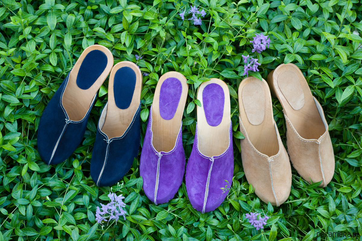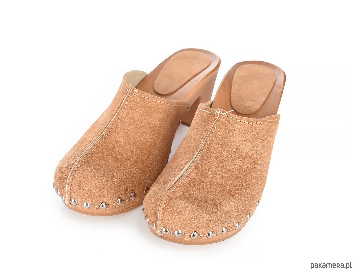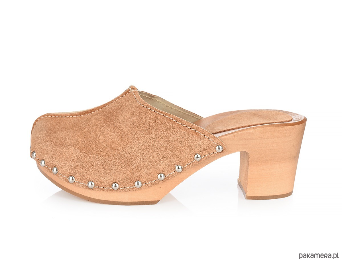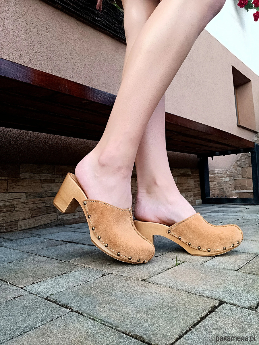 Drewniaki na obcasie ze skóry naturalnej i drewna