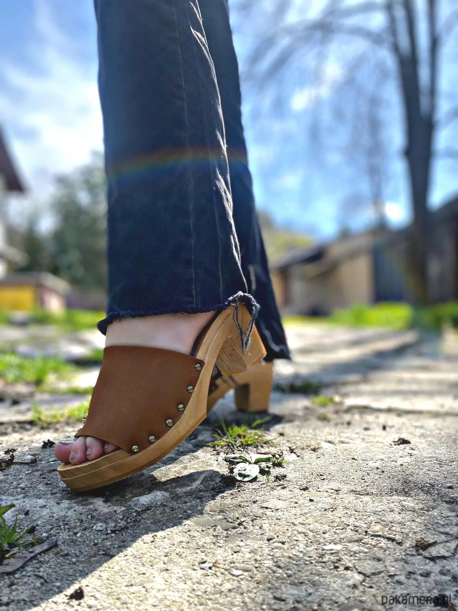 Drewniaki dawmskie 2 w 1. Możesz je nosić jako klapki z elegancką sprzeczką lub z założonym paseczkiem na piętę.