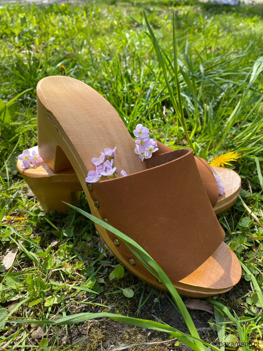 Drewniaki na obcasie ze skóry naturalnej i drewna