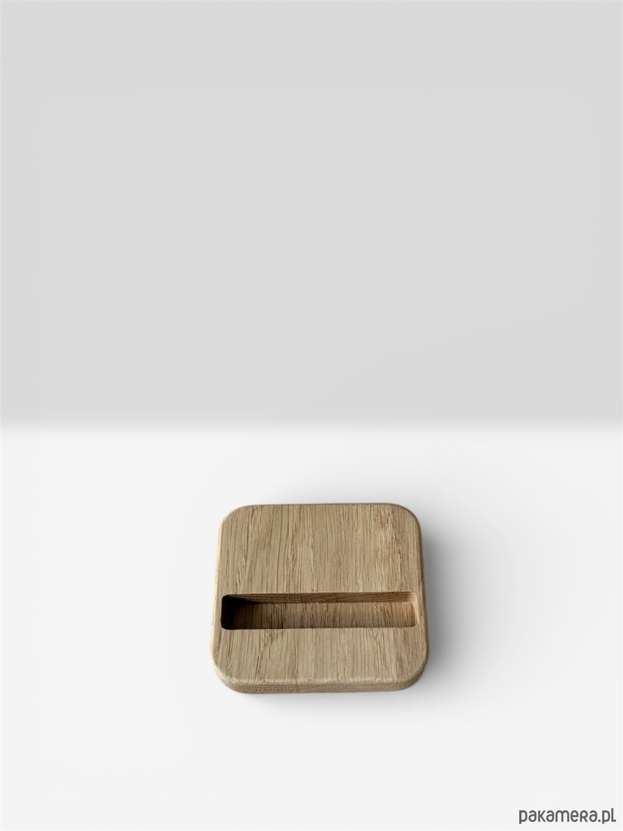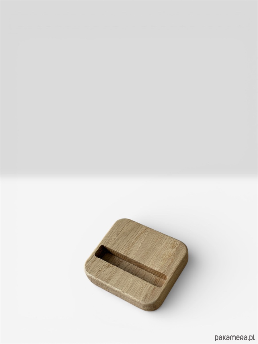 Minimalistyczna podstawka na telefon wykonana z litego dębu. Ma gładkie, zaokrąglone krawędzie oraz wąskie podłużne wgłębienie, w którym można stabilnie umieścić smartfon. Naturalna faktura i kolor dębu nadają jej elegancki, nowoczesny wygląd.