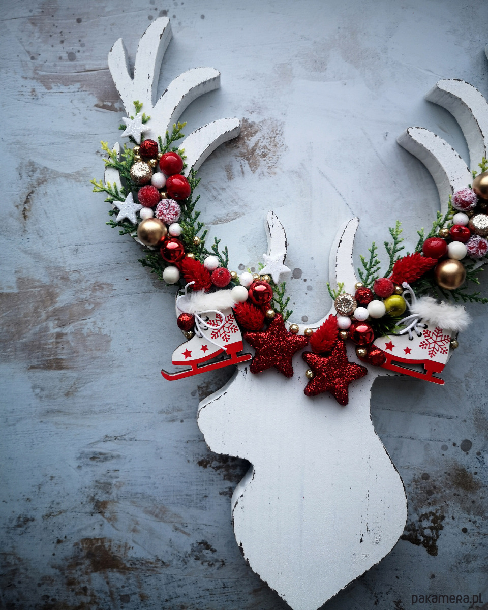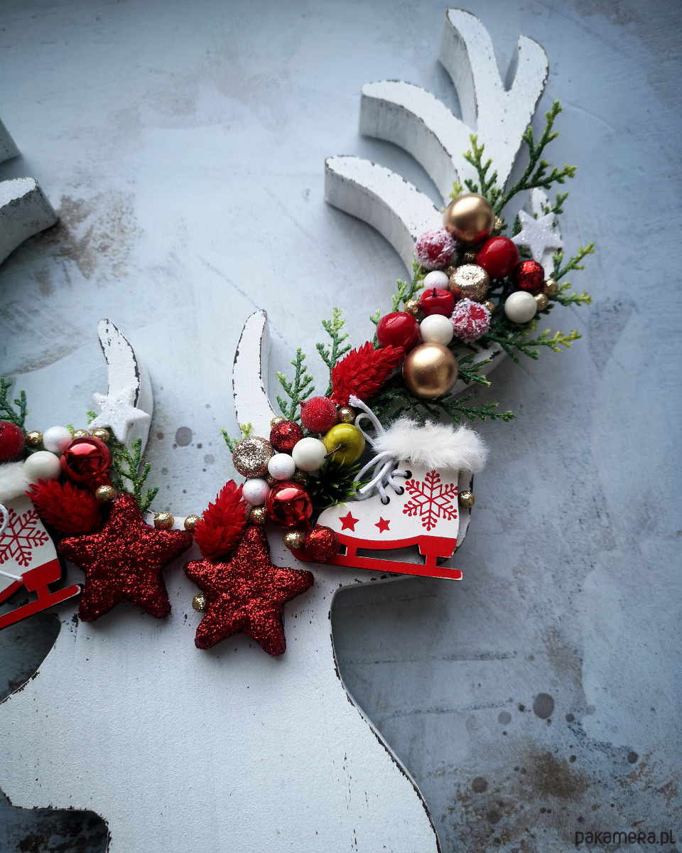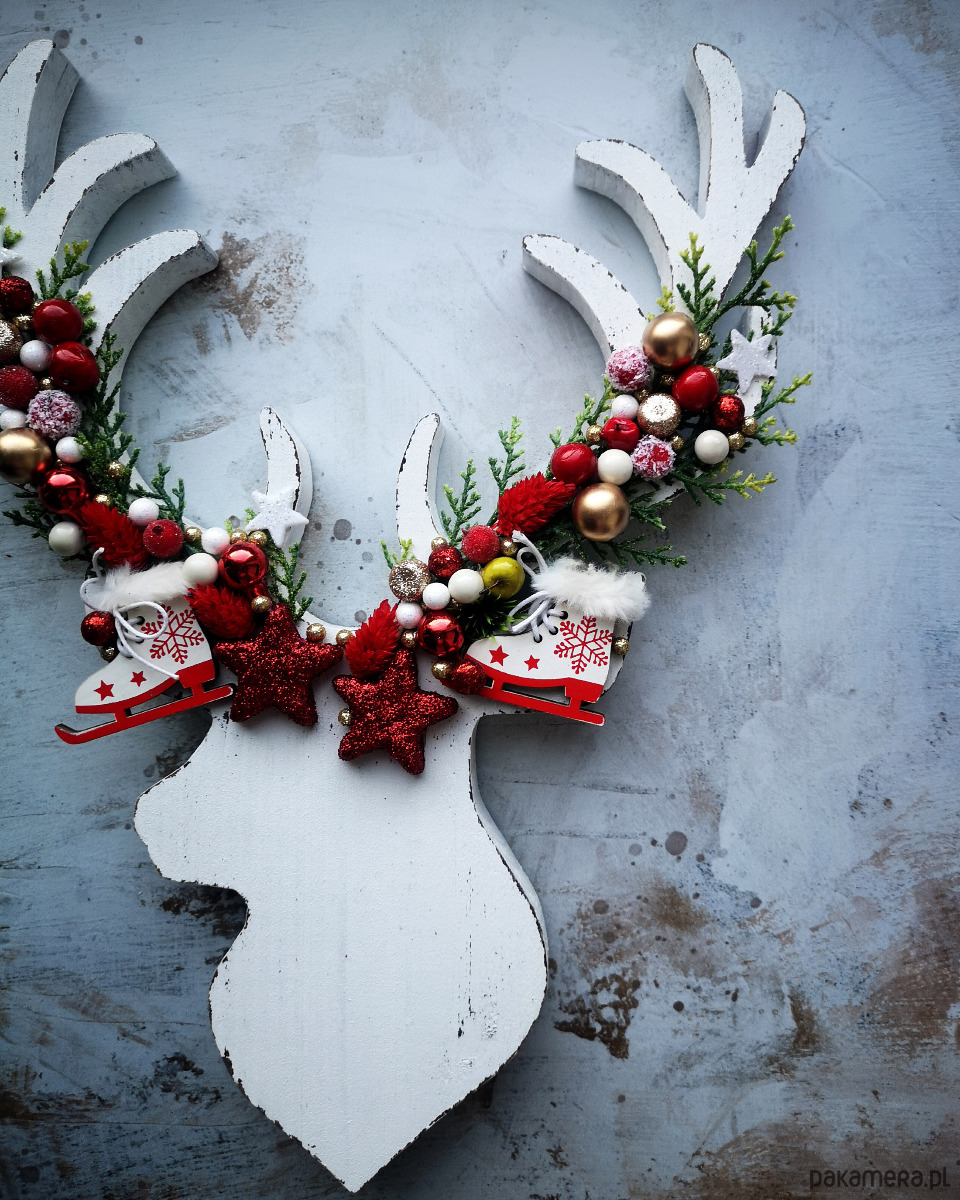 Stwórz niepowtarzalny, zimowy klimat w swoim domu dzięki tej drewnianej dekoracji w kształcie głowy renifera, bogato ozdobionej świątecznymi detalami. Ręcznie wykonana, drewniana głowa renifera w stylu rustykalnym łączy biel drewna (pomalowany z przetarciami) z klasycznymi, świątecznymi akcentami – czerwonymi, szklanymi bombkami, błyszczącymi gwiazdkami, złotymi ozdobami oraz zielonymi gałązkami sosny. Figurka renifera jest idealnym akcentem na ścianę, przyciągającym wzrok i wprowadzającym do wnętrza magię Świąt Bożego Narodzenia.