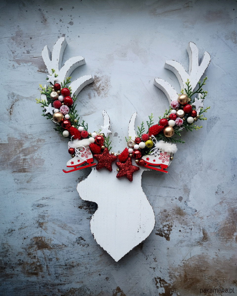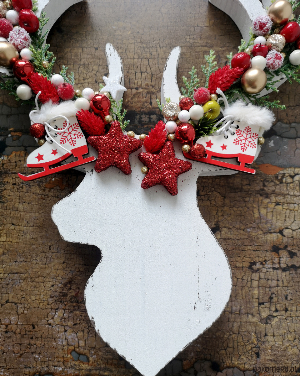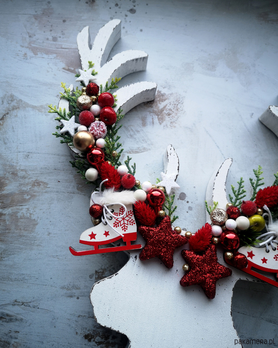 Stwórz niepowtarzalny, zimowy klimat w swoim domu dzięki tej drewnianej dekoracji w kształcie głowy renifera, bogato ozdobionej świątecznymi detalami. Ręcznie wykonana, drewniana głowa renifera w stylu rustykalnym łączy biel drewna (pomalowany z przetarciami) z klasycznymi, świątecznymi akcentami – czerwonymi, szklanymi bombkami, błyszczącymi gwiazdkami, złotymi ozdobami oraz zielonymi gałązkami sosny. Figurka renifera jest idealnym akcentem na ścianę, przyciągającym wzrok i wprowadzającym do wnętrza magię Świąt Bożego Narodzenia.