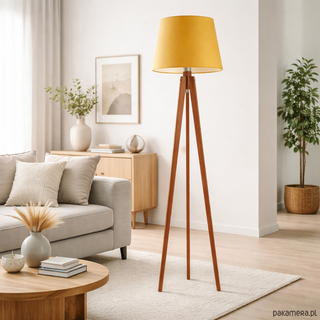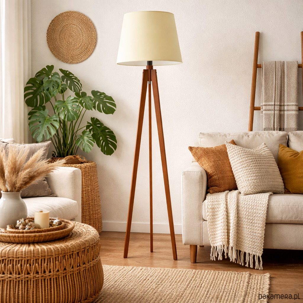Drewniana lampa stojąca na trójnogu do salonu CURACAO