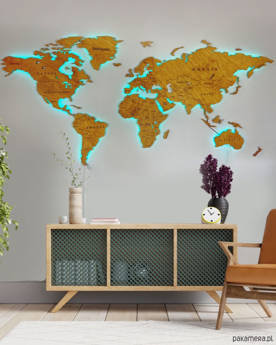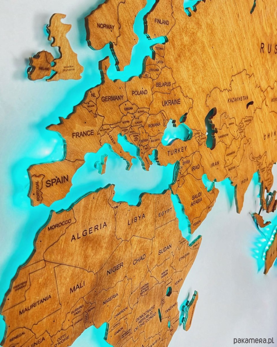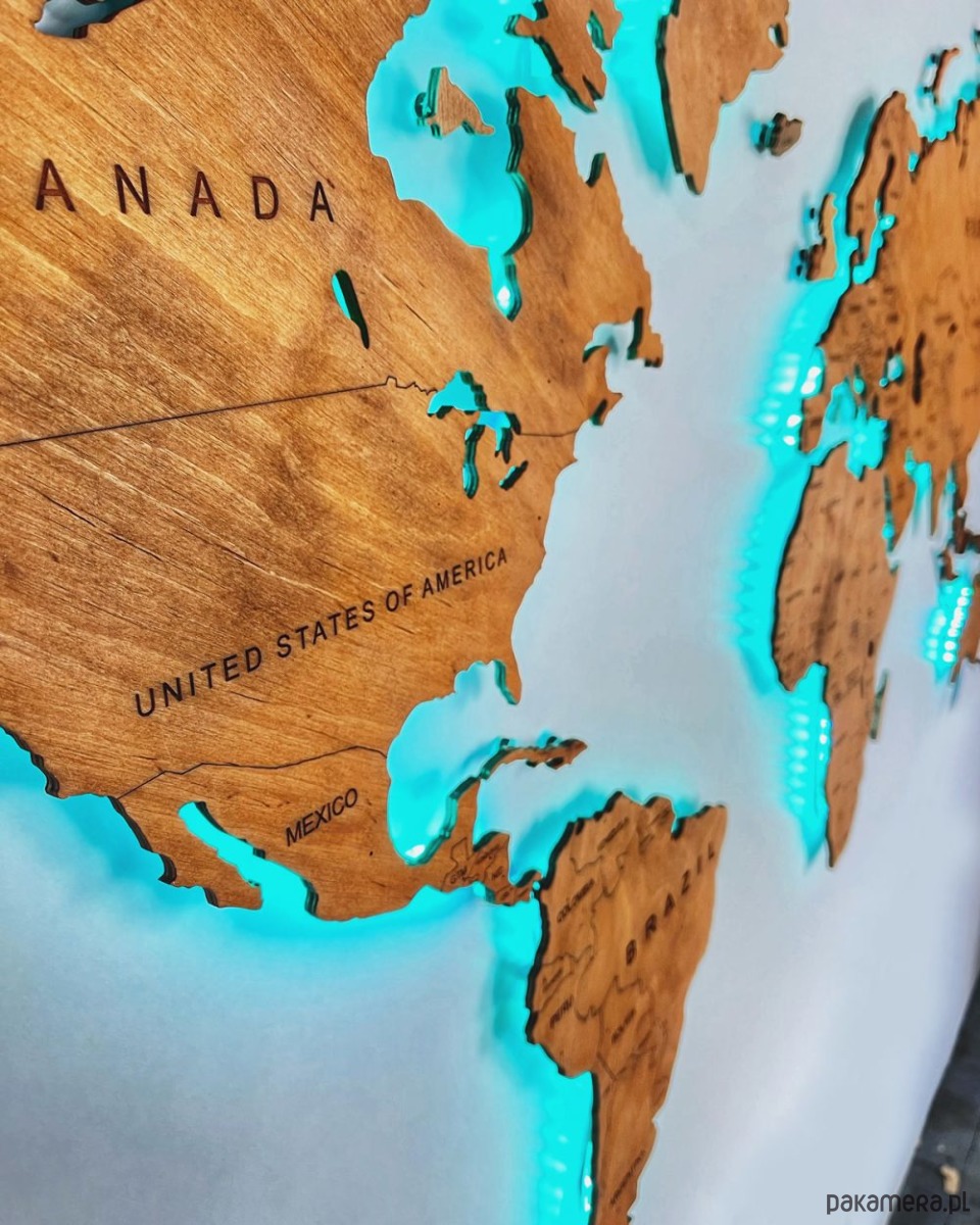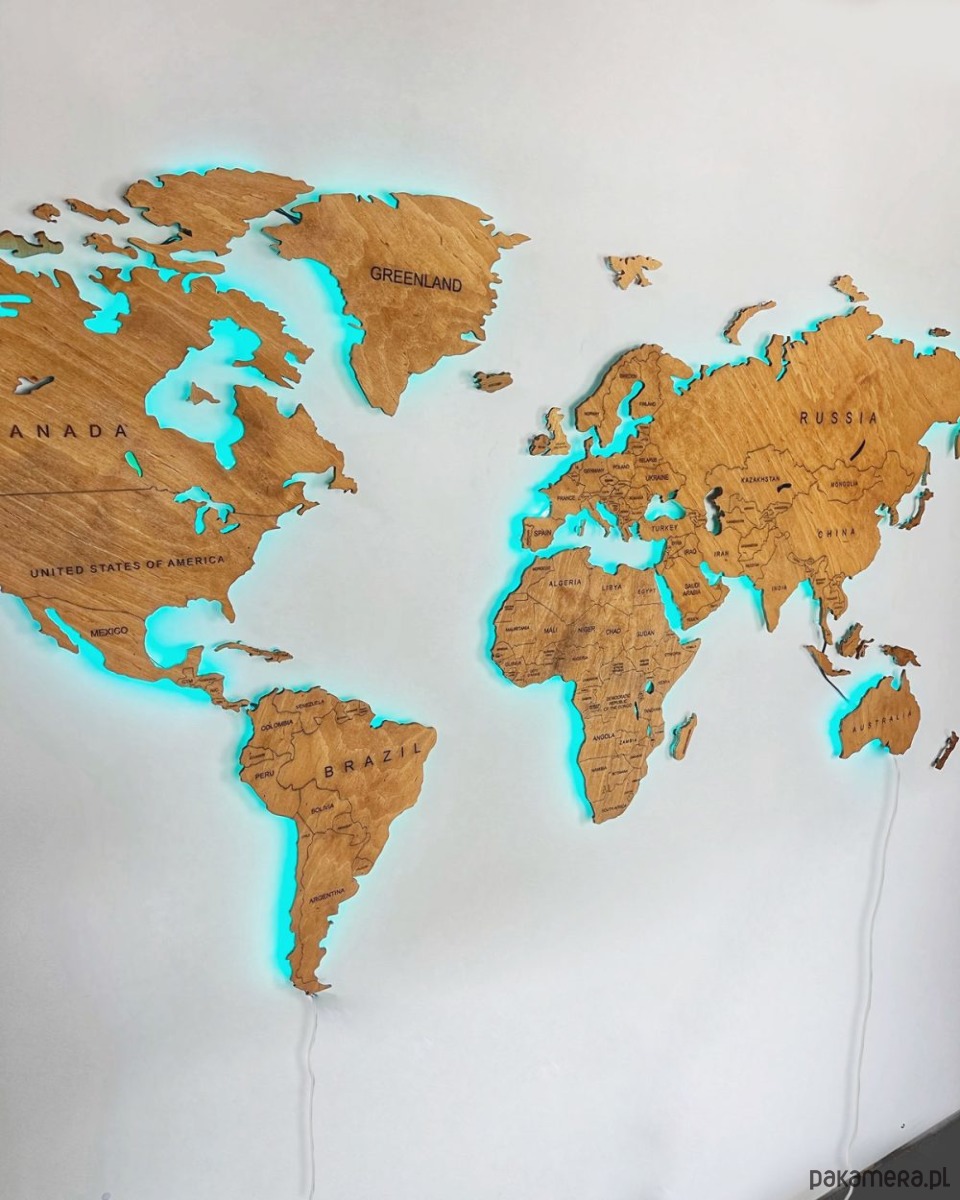 🌎 Drewniana Mapa Świata Podświetlana LED na ścianę to połączenie bliskości natury z nowoczesną technologią, która jest niekwestionowaną rewolucją na rynku oświetlenia. Nasza drewniana mapa świata LED jest dostępna w wersji Classic. Dzięki nowoczesnej technologii sterowanie światłem nigdy nie było łatwiejsze. Inteligentna Drewniana mapa świata LED sterowana jest za pomocą sieci Wi-Fi. Produkt wykonany jest z wysokiej jakości sklejki olejowanej. Dostępne są dwie grubości – 6 mm/ 12 mm oraz sześć rozmiarów mapy.