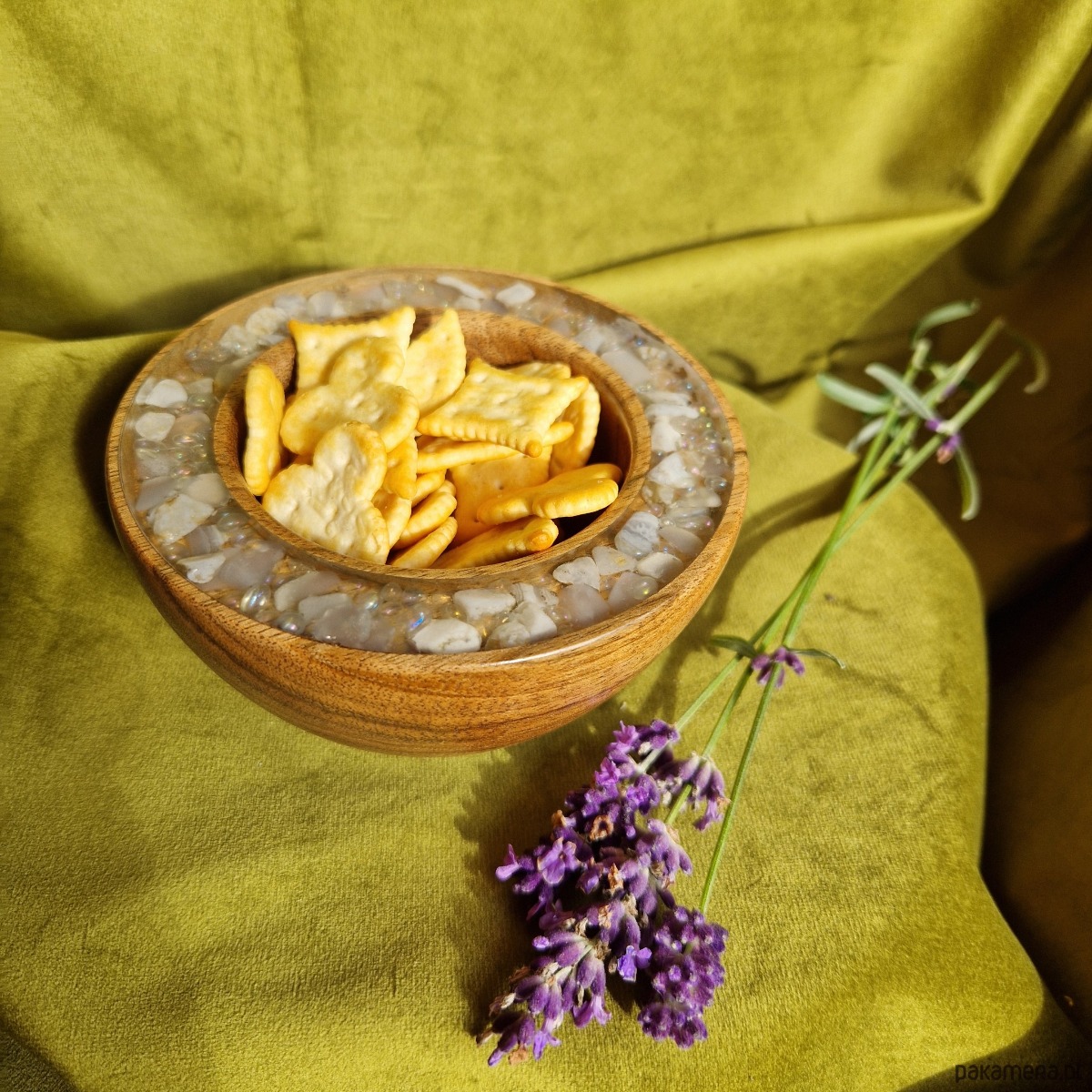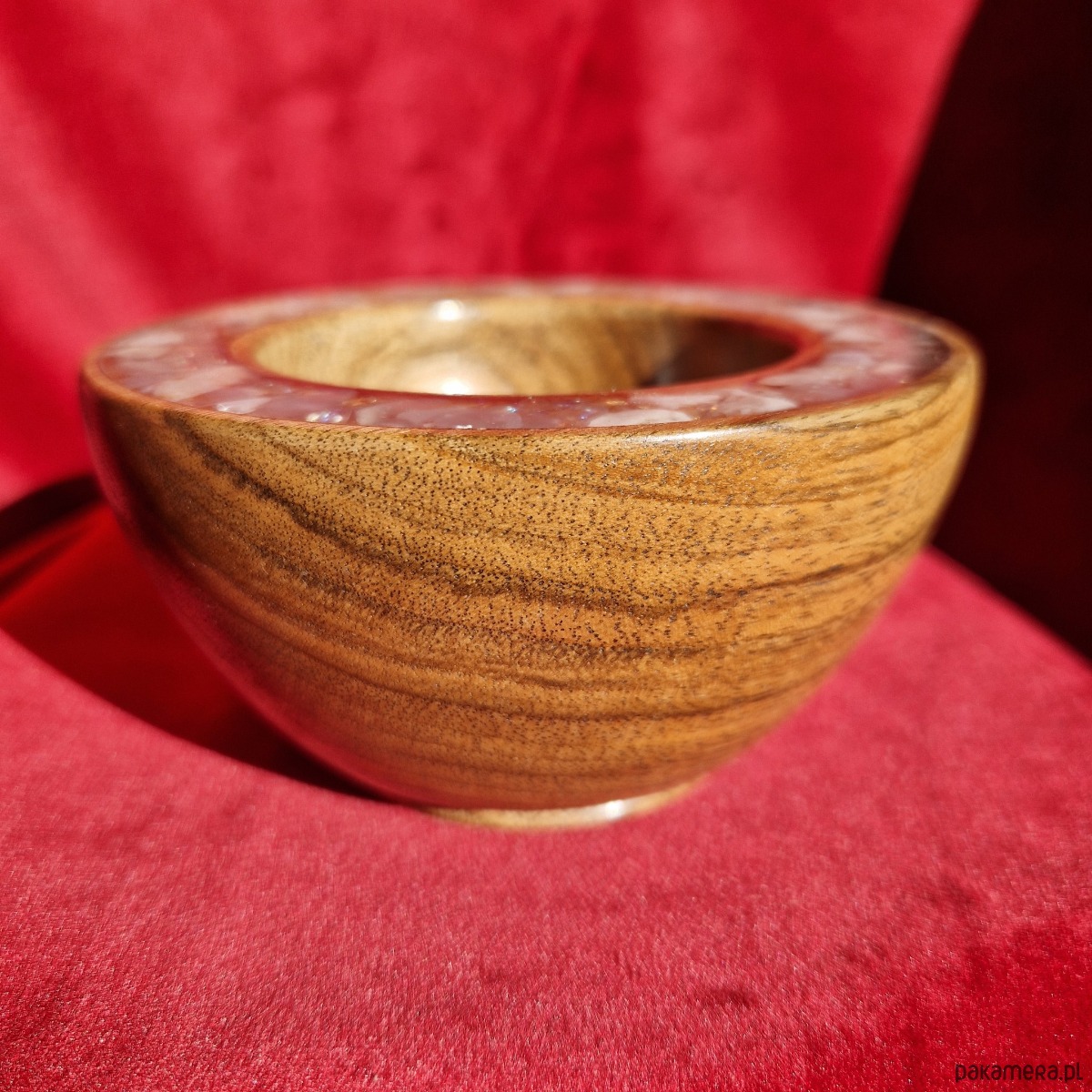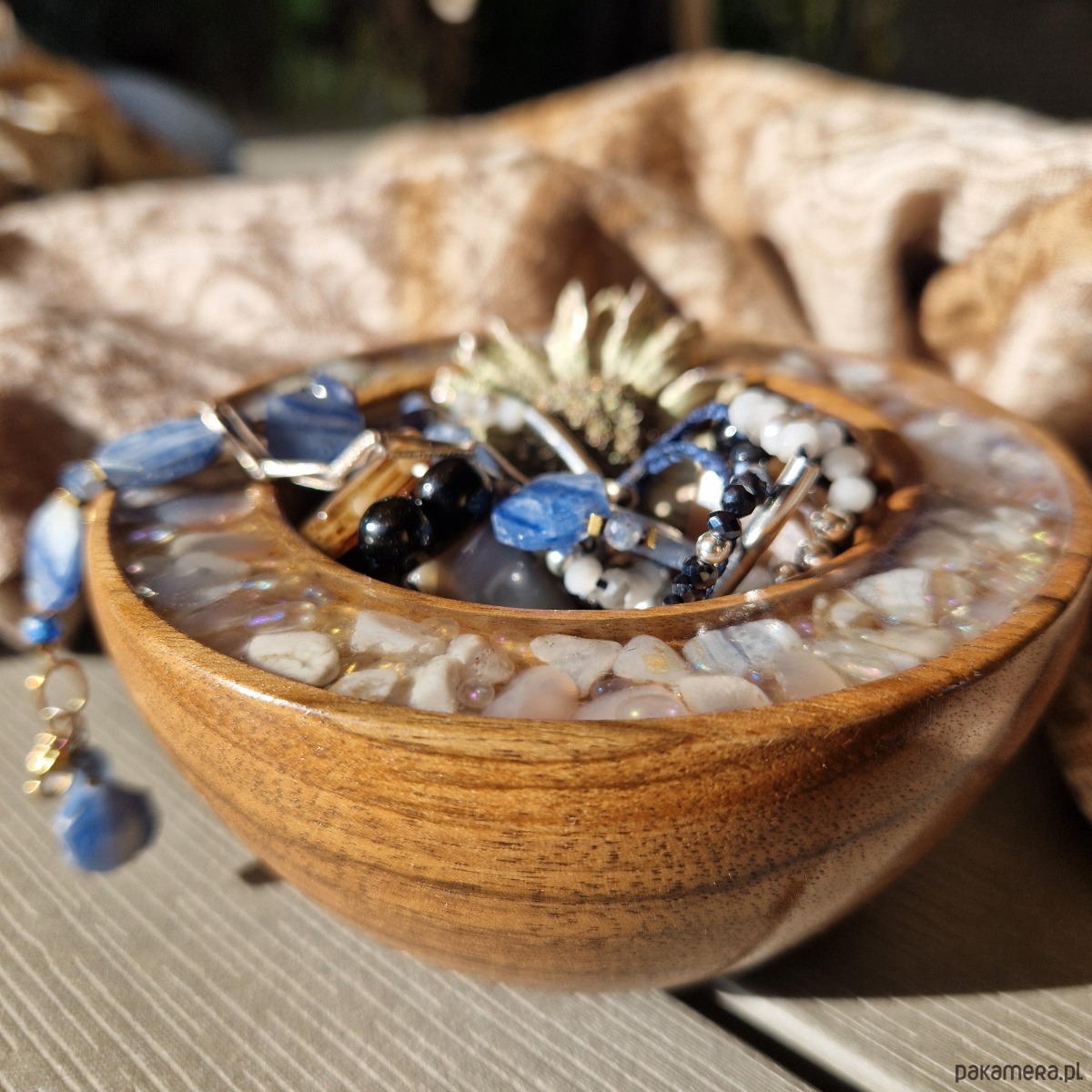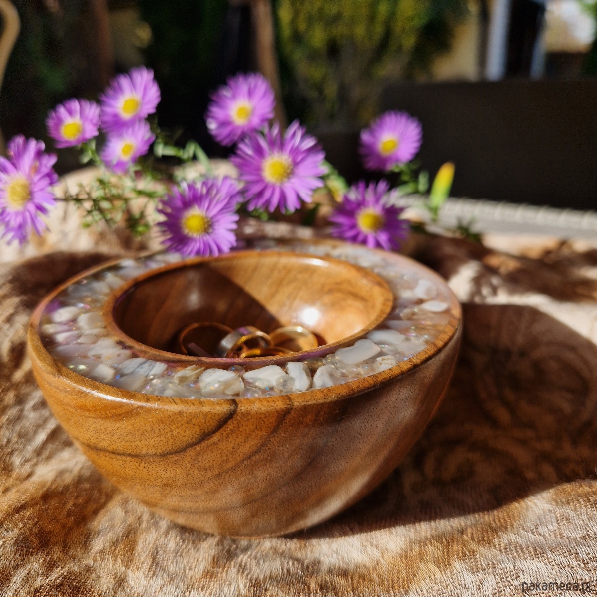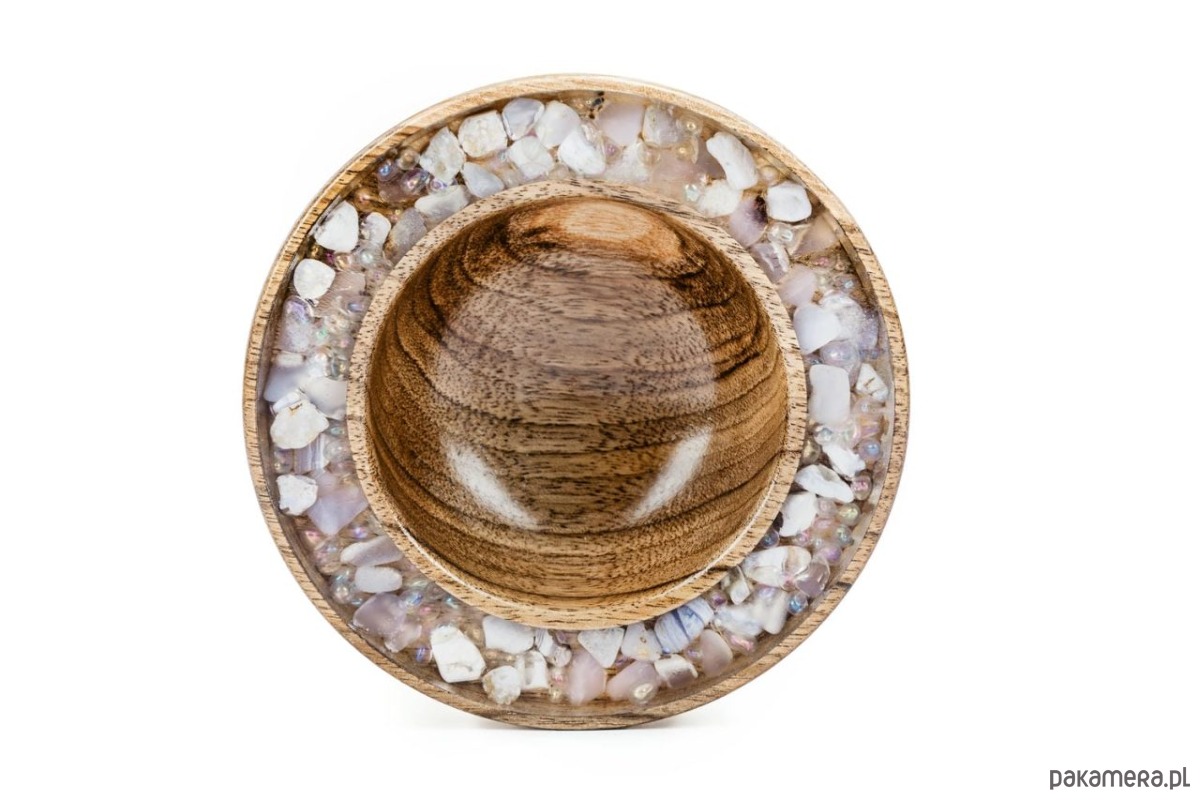 Rzemieślnik starannie ręcznie toczy każdą miseczkę na tokarce. Następnie poleruje ją na wysoki połysk. Przezroczysta krawędź epoksydowa obramowuje dzieło, inkrustowane półszlachetnymi kamieniami i minerałami. Każdy szczegół podkreśla piękno przechowywanych skarbów. Niewielka, ale efektowna misa stoi na podwyższonej nóżce i ma głębokie wgłębienie. Dzięki temu biżuteria jest przechowywana z dbałością, precyzją i stylem.