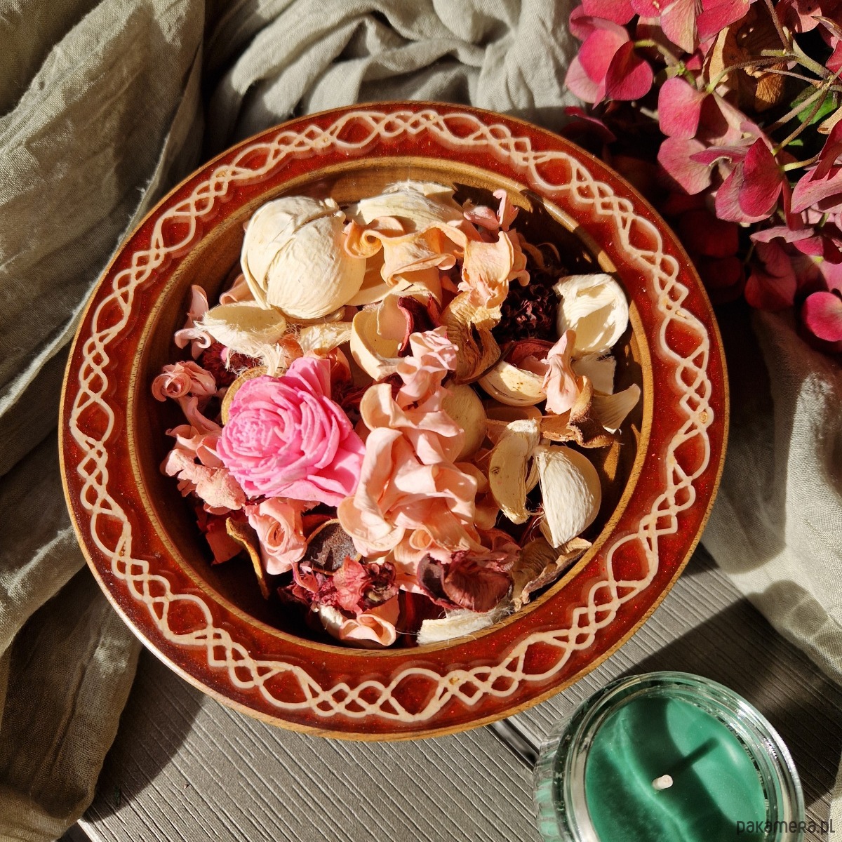 Delikatne, a zarazem praktyczne naczynie jest wielkości małej miseczki śniadaniowej. Można w niej podawać orzechy, suszone owoce lub drobne smakołyki dla gości, lub postawić ją samodzielnie jako magiczny eksponat. Wypełnij ją potpourrie, aby dodać subtelne akcenty zapachowe i kolorystyczne, które dodadzą czaru i atmosfery każdej przestrzeni.