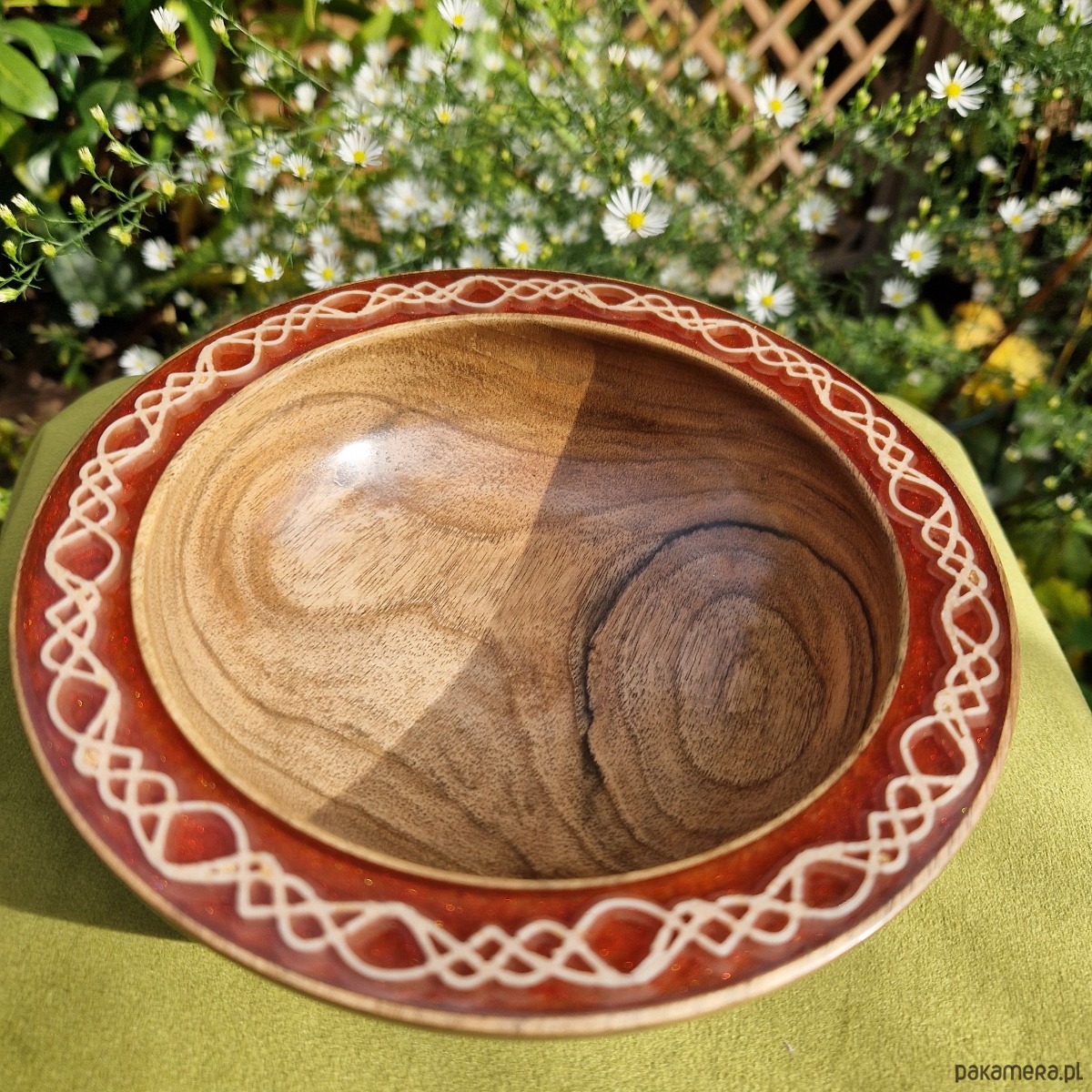 Drewniana miska elfów wniesie do Twojego domu odrobinę magii i elegancji. Naczynie powstało z bogatego, ciemnego orzecha europejskiego, zawierającego naturalne wzory słojów, mieniące się zarówno wewnątrz, jak i na zewnątrz. Brzeg miseczki okala rzeka żywicy mieniąca się głęboką czerwienią, w której której widać prawdziwie elficko - królewski splot polimerowy zaprojektowany w stylu Art Novueau.