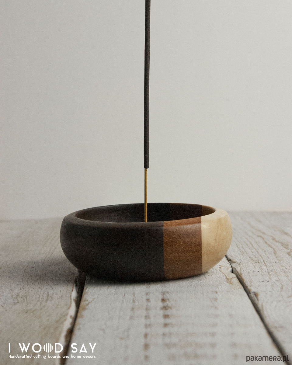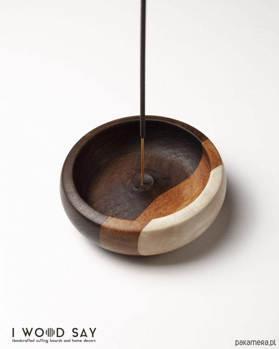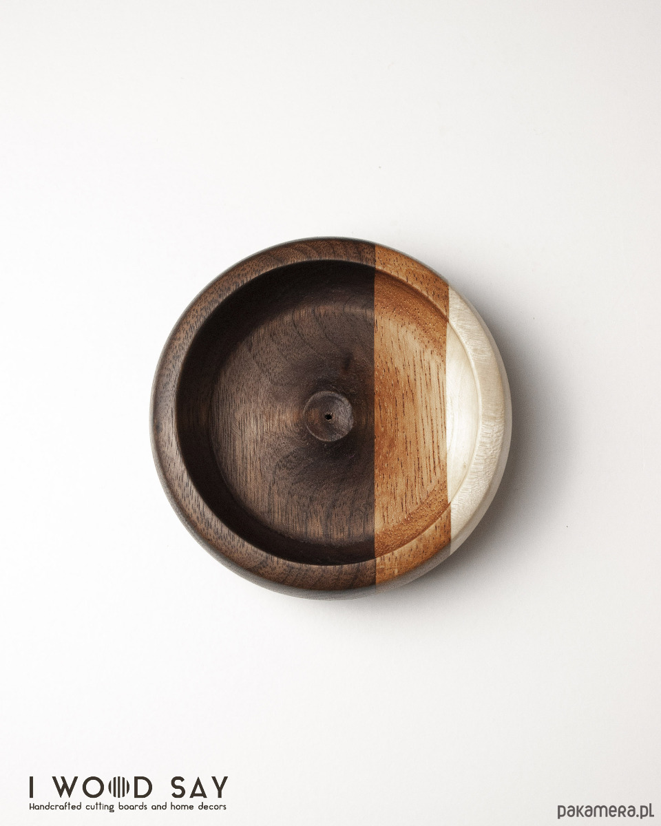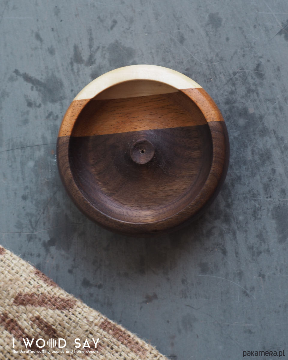 Podstawka pod kadzidełko toczona w drewnie amerykańskiego orzecha, łączonego z egzotycznym meranti oraz jaworem o mlecznym odcieniu.