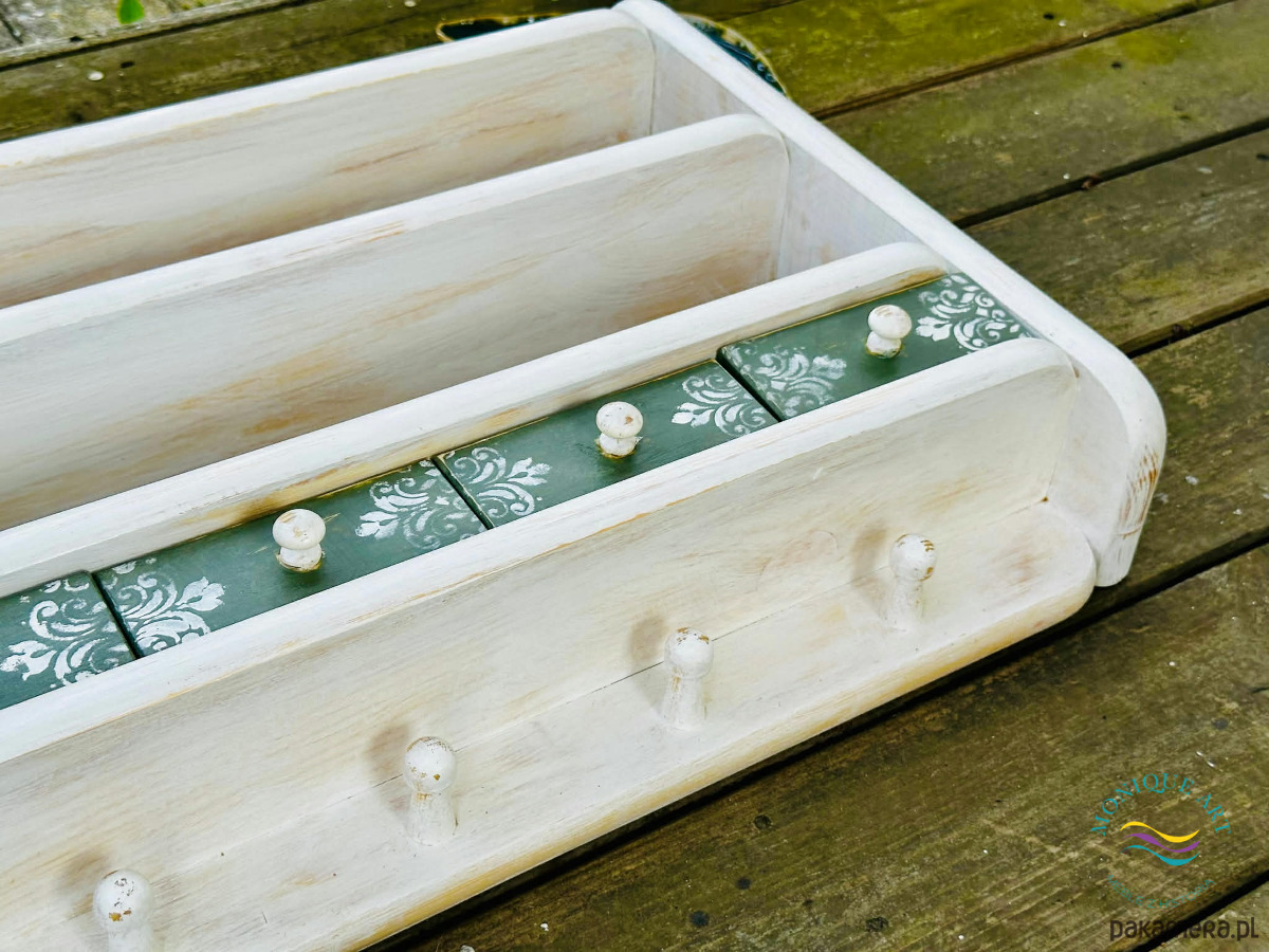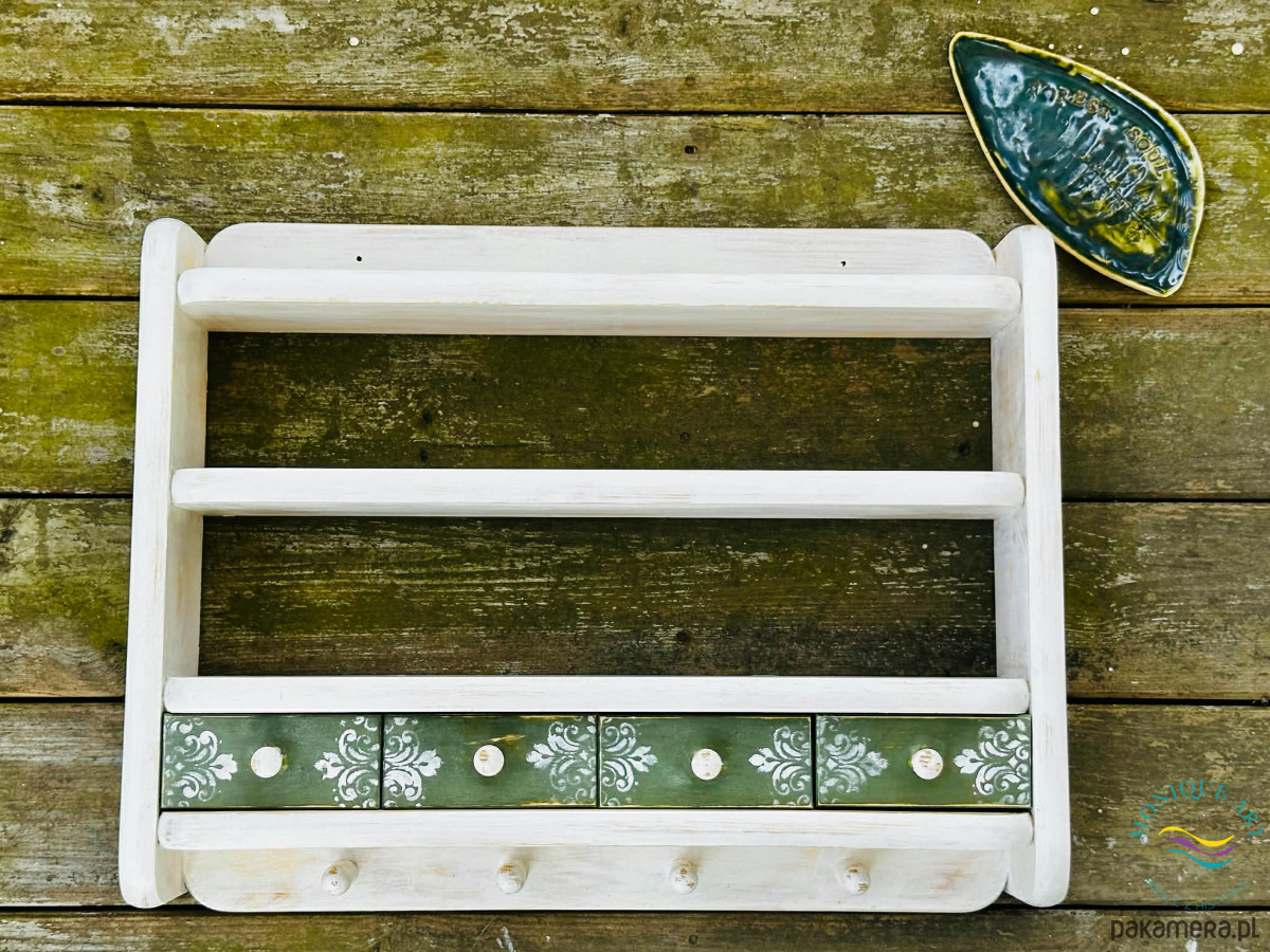 Półka kuchenna ozdobiona w stylu shabby chic, pomalowana wysokiej jakości farbami kredowymi i zabezpieczona woskiem.