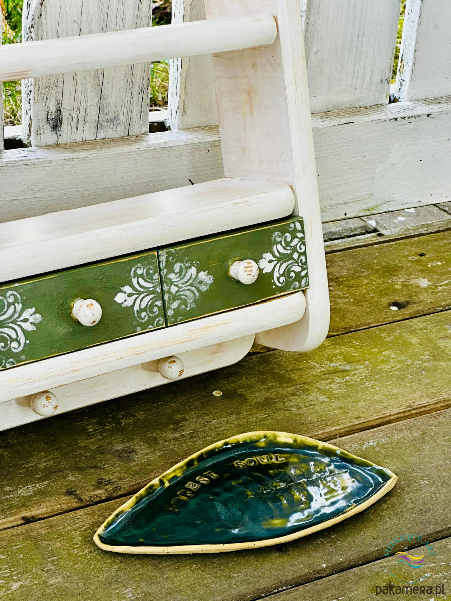 Półka stylizowana dla miłośniczki sielskości we wnętrzach. To połączenie bieli i zieleni.