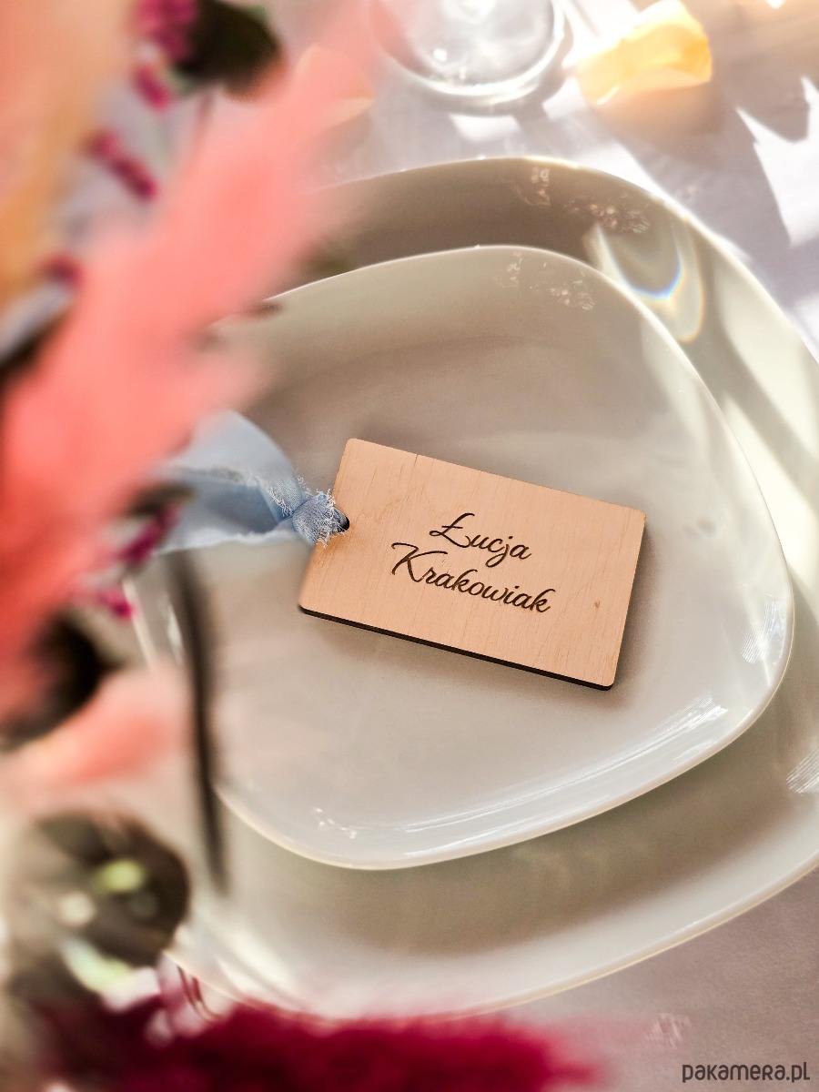 Drewniane winietki z grawerem to elegancki dodatek do dekoracji stołu na wesele, przyjęcie lub inną uroczystość. Pomagają w organizacji miejsc, a jednocześnie pięknie dopełniają aranżację stołu. Każda winietka posiada grawerowany napis według przesłanej listy gości (np. imię, imię i nazwisko, pseudonim, forma grzecznościowa).