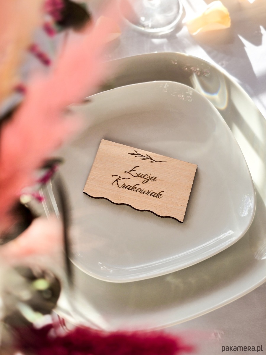 Drewniane winietki z grawerem to elegancki dodatek do dekoracji stołu na wesele, przyjęcie lub inną uroczystość. Pomagają w organizacji miejsc, a jednocześnie pięknie dopełniają aranżację stołu. Każda winietka posiada grawerowany napis według przesłanej listy gości (np. imię, imię i nazwisko, pseudonim, forma grzecznościowa).