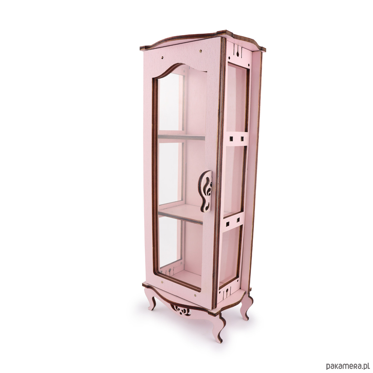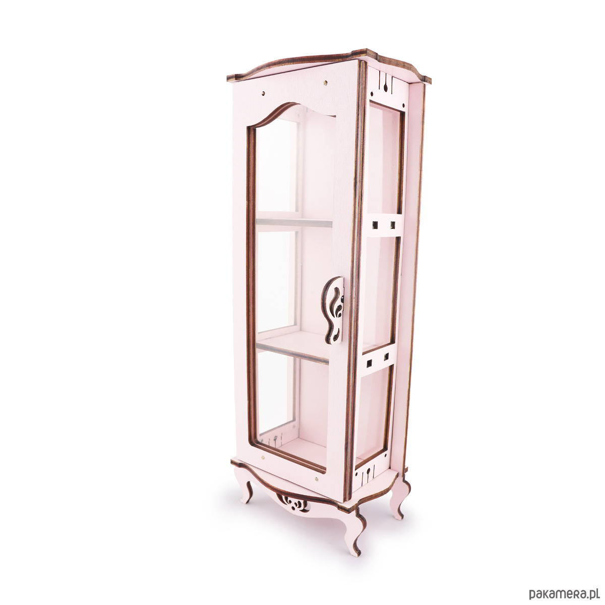 Ozdobna witrynka łazienkowa to dekoracyjny element będący uzupełnieniem wyposażenia łazienki domku dla lalek. Mebelek ma ruchome i przezroczyste elementy, szybki wykonane są z bezpiecznego i nietłukącego się materiału. We wnętrzu witrynki znajdują się dwie półki. Witrynka może być przedmiotem służącym do przechowywania innych akcesoriów, nie tylko w pomieszczeniu łazienki.