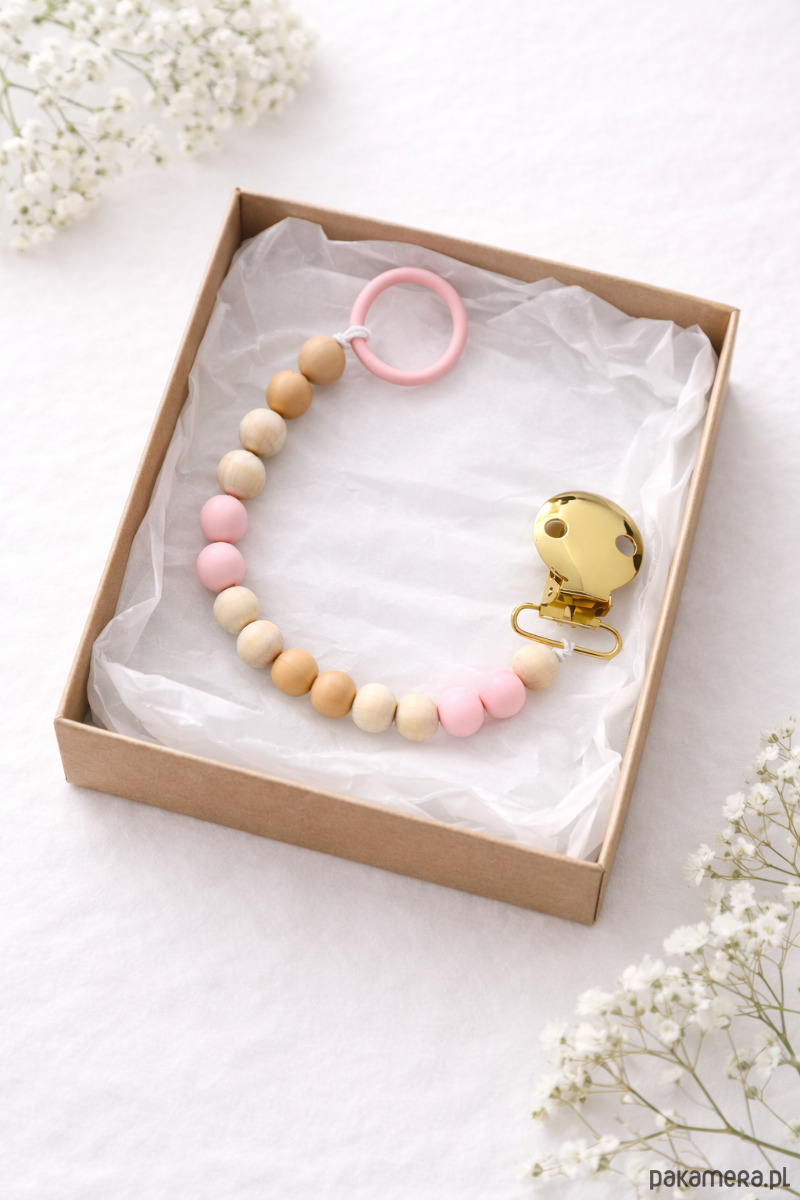 Drewniana zawieszka koralikowa do smoczka dla dziecka z pudełkiem
