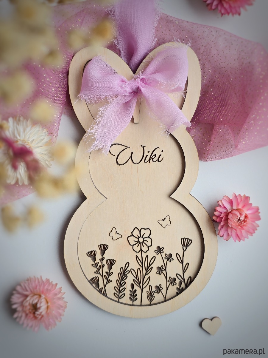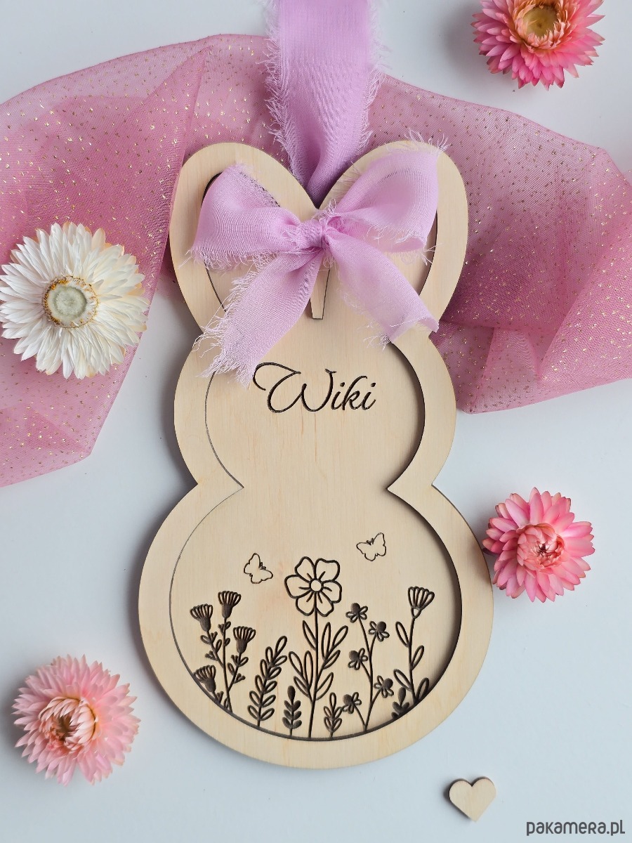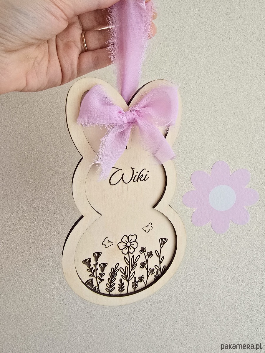 To wyjątkowa ozdoba z wygrawerowanym imieniem oraz motywem przywołującym wiosnę. Zawieszka sprawdzi się w pokoju dziecka lub jako symboliczny prezent od zajączka. Dekorację można powiesić na ścianie lub drzwiach.