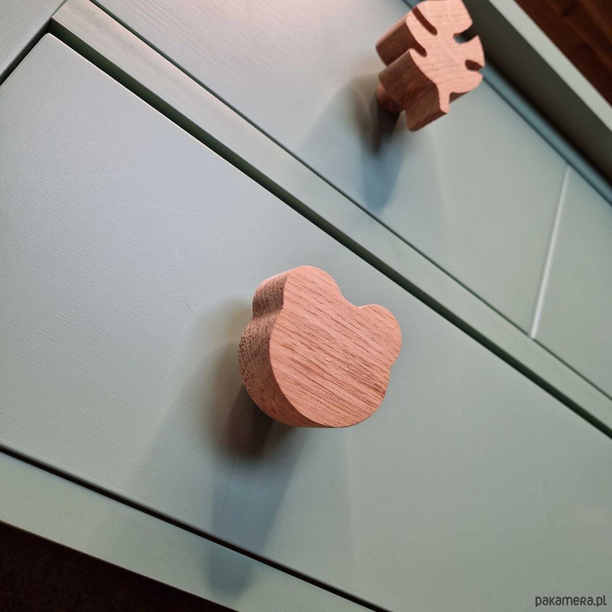 Każda gałka jest niepowtarzalna, ponieważ drewno dębowe różni się odcieniem i układem słojów.