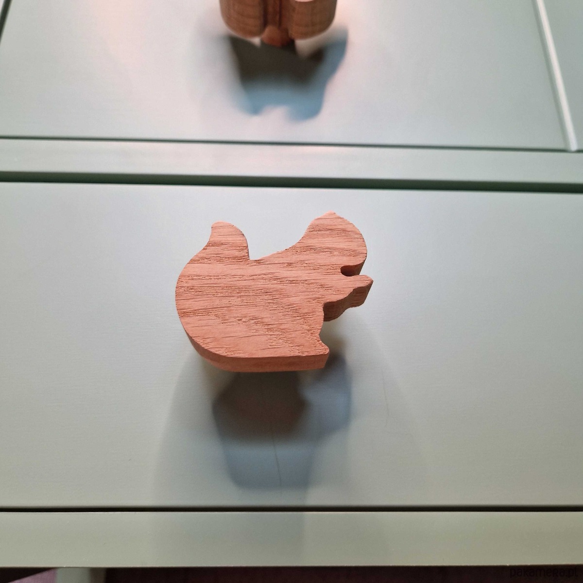 Urocza drewniana gałka do mebli w kształcie wiewiórki wprowadza do wnętrza ciepło, naturalny urok lasu i subtelny, przyjazny detal. Wykonana z litego drewna dębowego, starannie szlifowana i zabezpieczona ekologicznym, bezbarwnym olejem, łączy trwałość z pięknem naturalnego drewna.