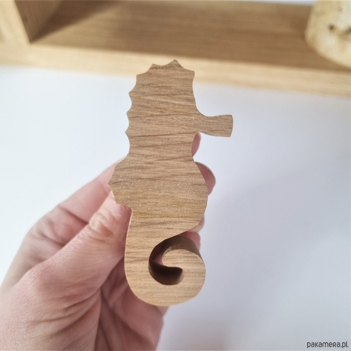Wykonana z litego drewna dębowego, zachwyca prostotą i precyzją wykonania. To idealny dodatek do dziecięcych pokoi urządzonych w stylu morskim, boho lub naturalnym, w których królują piasek, błękit i ciepłe odcienie drewna. Drewniany konik morski pięknie komponuje się z innymi wzorami z kolekcji „Ocean” – jak ryba, ośmiornica, żółw, krab czy rozgwiazda – tworząc harmonijną, tematyczną przestrzeń pełną lekkości i przygody.