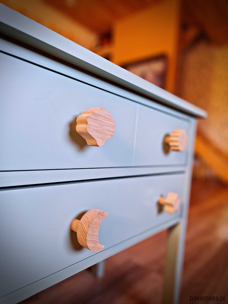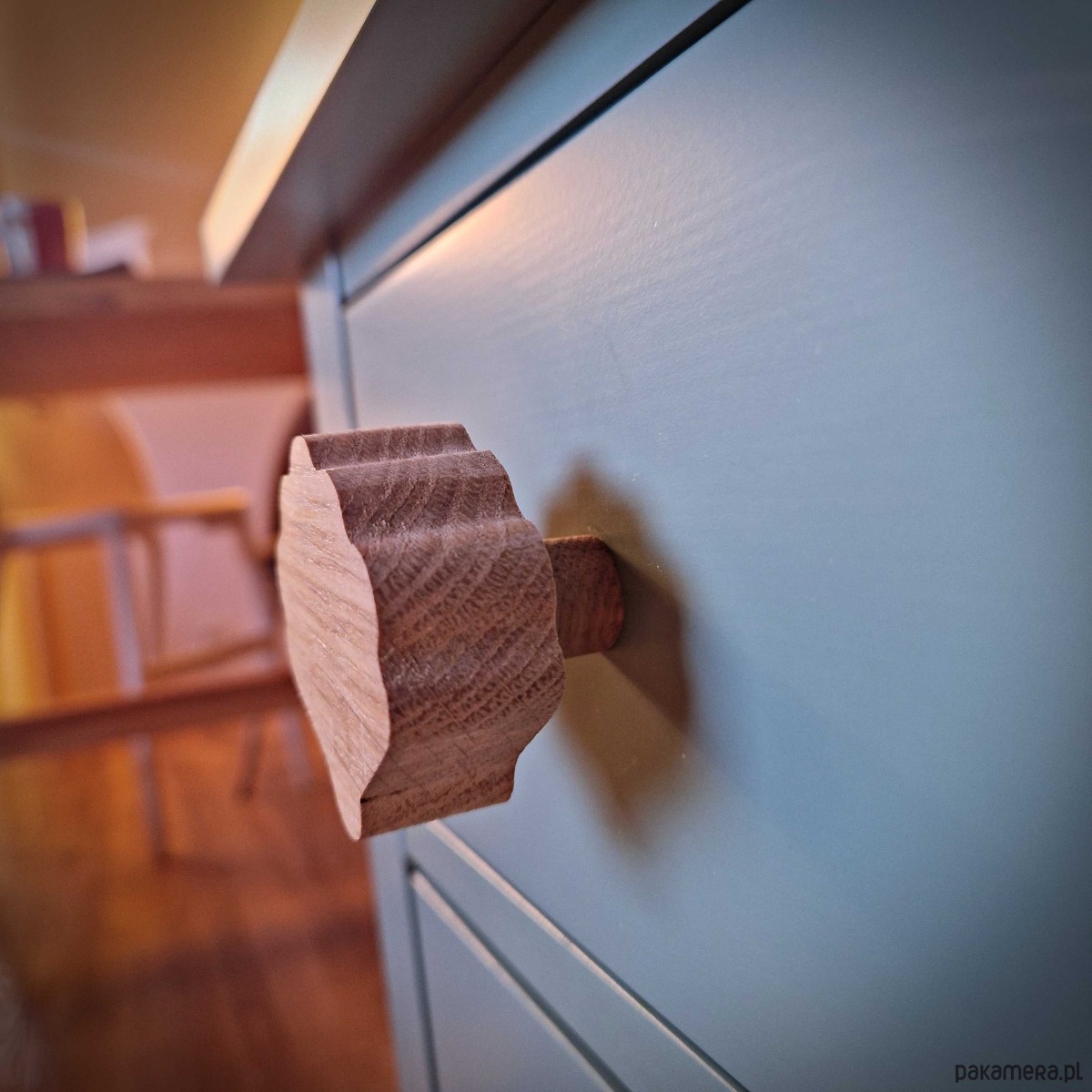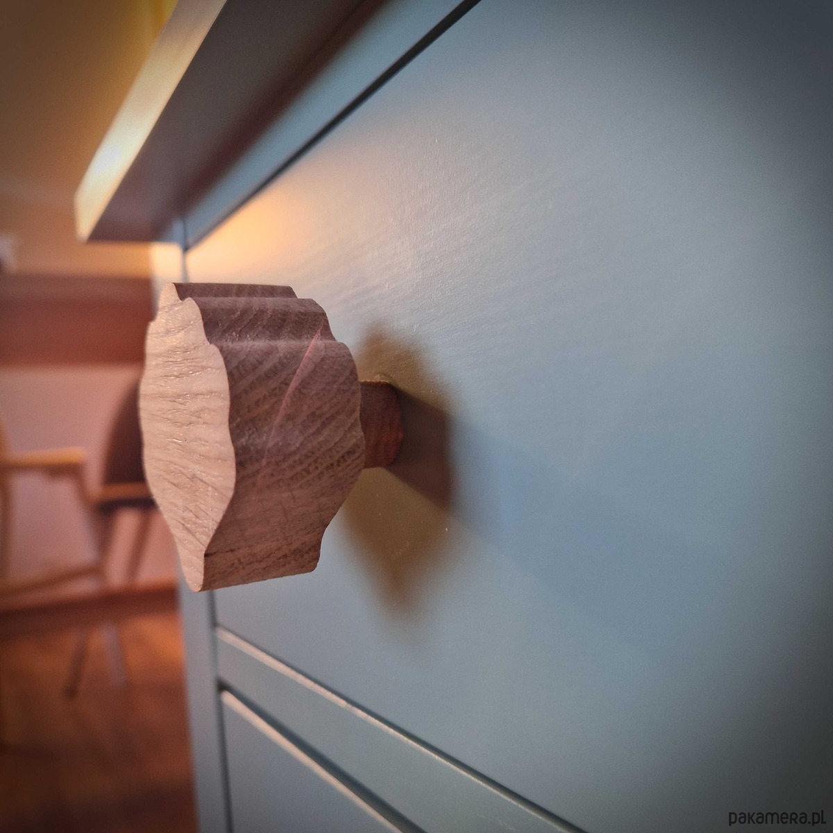 Każdy egzemplarz wykonujemy na zamówienie, co pozwala nam wycinać wszystkie gałki z jednej deski – dzięki temu zachowują one spójny odcień i rysunek drewna. To drobny detal, który czyni różnicę w jakości i estetyce gotowego produktu.