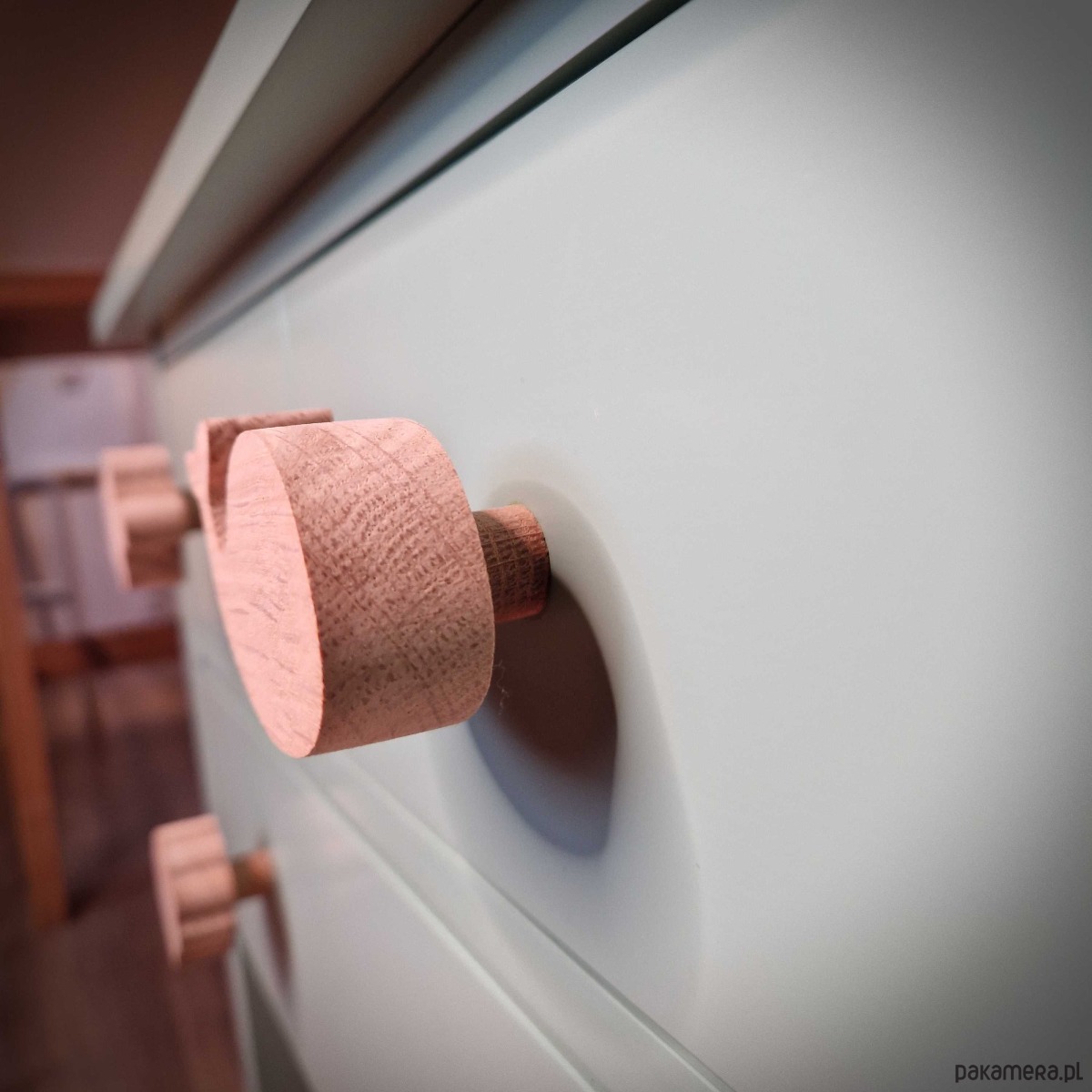 Każda gałka jest ręcznie wykonywana na zamówienie, dzięki czemu możemy przygotować komplet z jednej deski, by zachować jednolity odcień, strukturę i wyjątkowy rysunek słojów. Dąb zabezpieczony ekologicznym, matowym olejem pozostaje przyjemny w dotyku, odporny na zabrudzenia i bezpieczny również do dziecięcych wnętrz.